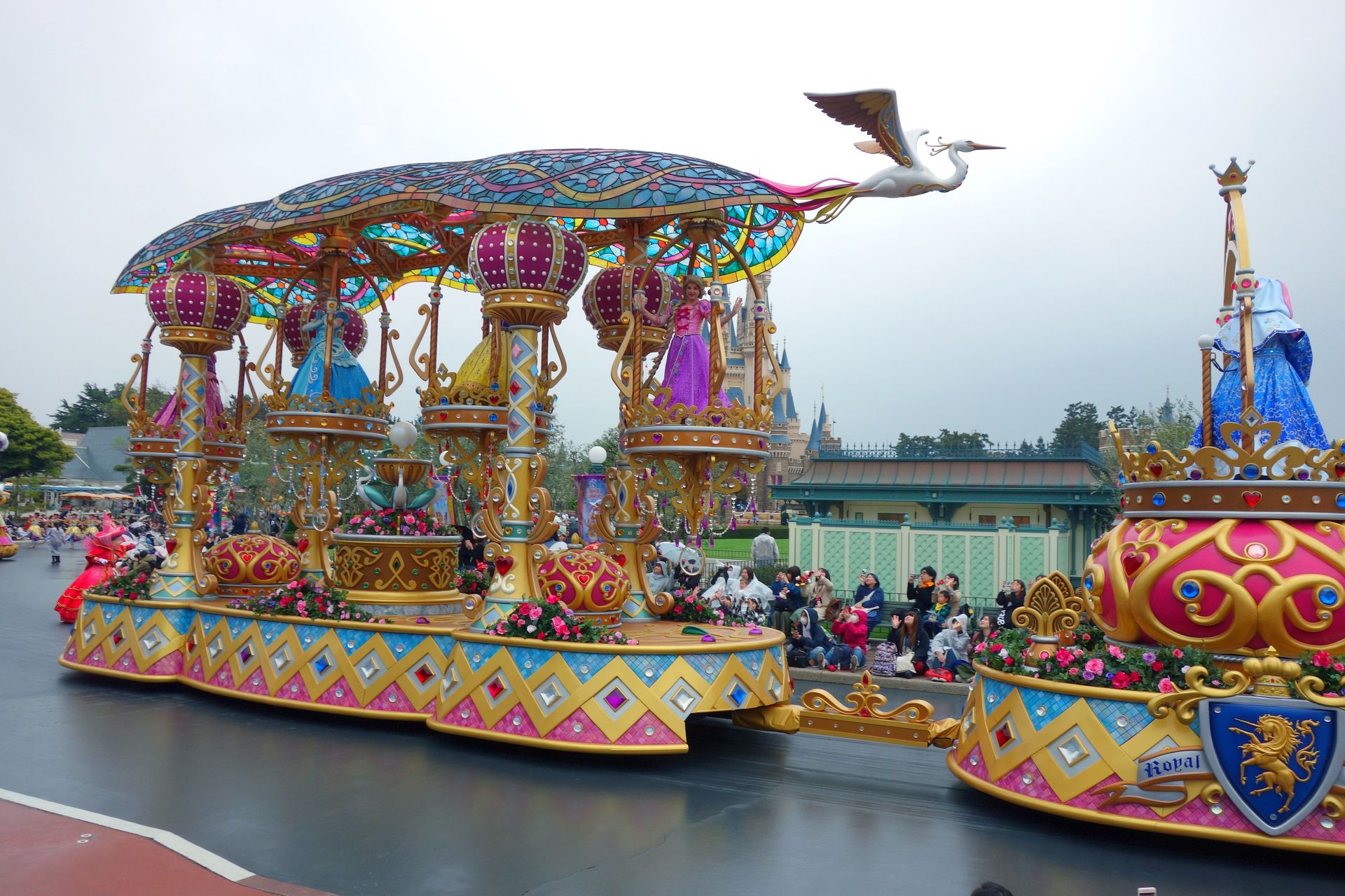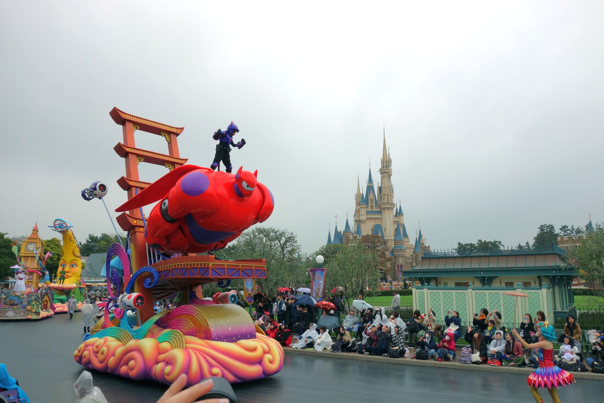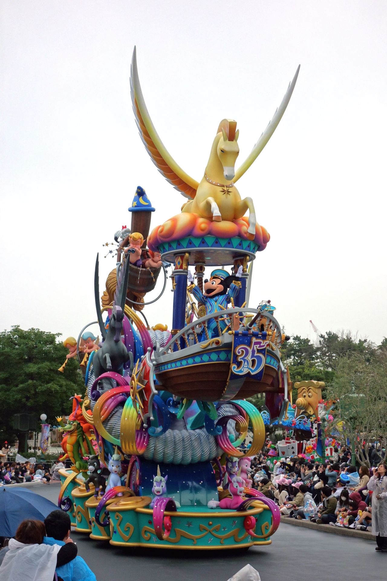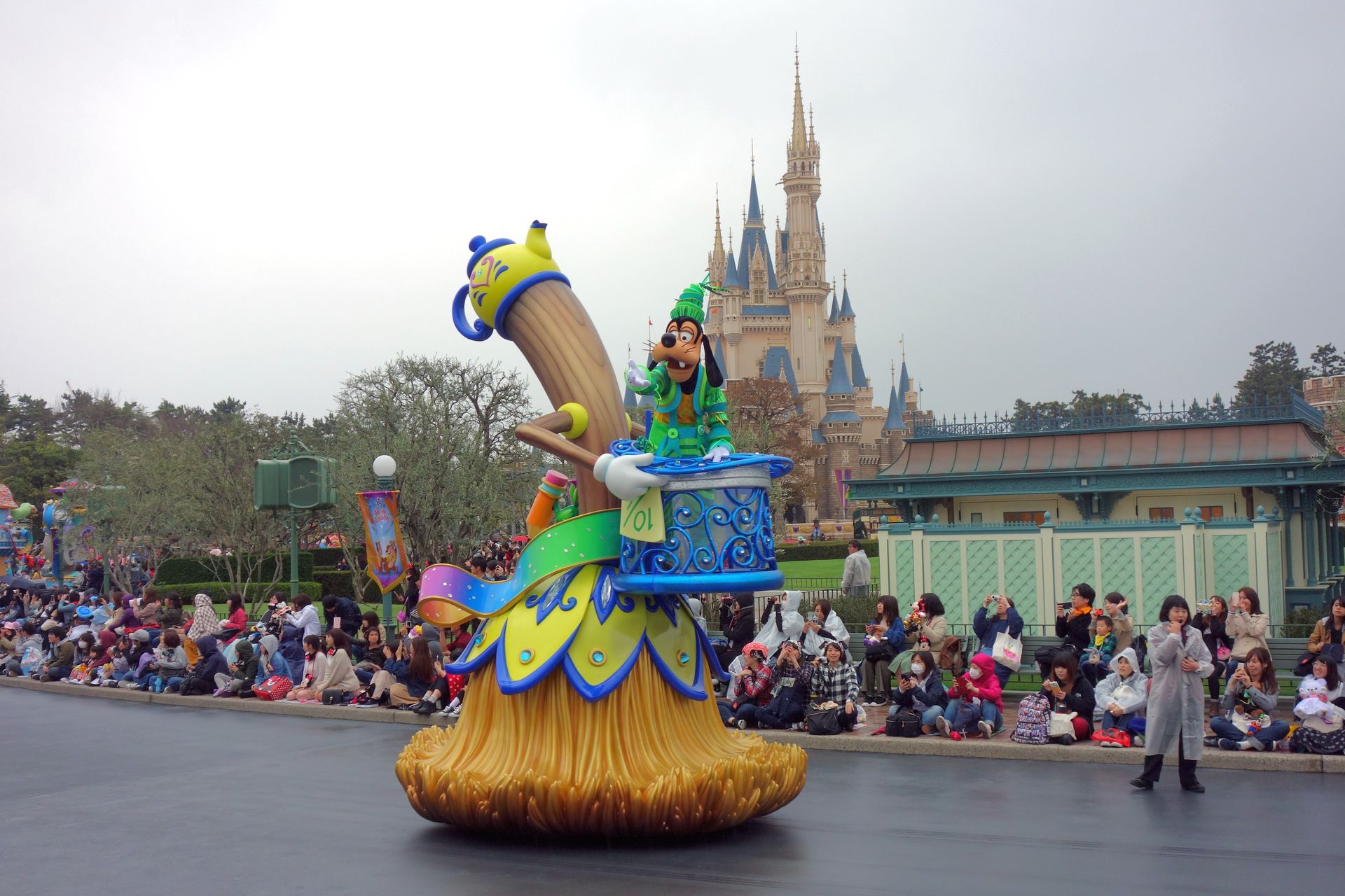 Natürlich genau NACHDEM wir mit den ganzen Indoor-Attraktionen im Adventureland fertig waren. Nunja, der Schauer war wie gesagt nur von kurzer Dauer. Als wir uns am HUB für die zweite Parade des Tages aufstellten, hörte es auch schon wieder auf. In Japan herrscht übrigens auch beim Bewundern einer Parade Zucht und Ordnung. Wir hatten uns ein freies Plätzchen nah am Weg gesucht, ganz so voll war der Park dann offensichtlich doch nicht (zugegeben, wir kamen auch nicht gerade auf den letzten Drücker). Die Bereiche direkt am Weg waren auch schön markiert, den Grund dafür gab uns wenig später ein Mitarbeiter zu verstehen. Wir sollten uns entweder auf den Boden setzen, oder eben ein Stück weiter nach hinten gehen. Jawohl, im markierten Bereich darf man ausschließlich sitzen, damit auch die weiter hinten stehenden Besucher noch genug von der Parade sehen können. Sehr lobenswert.
