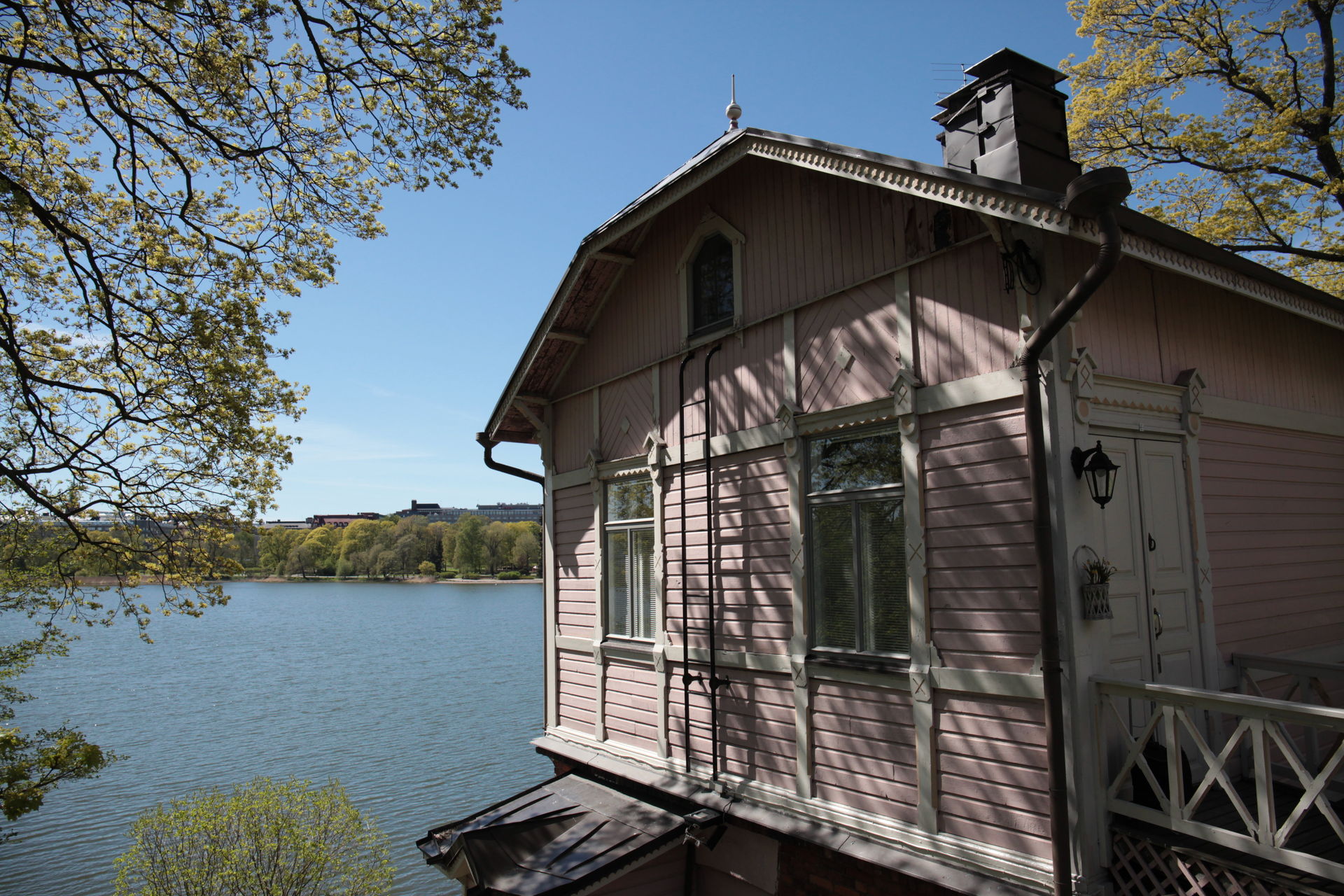 Blick von der Messe über den Töölönlahti auf Linnanmäki