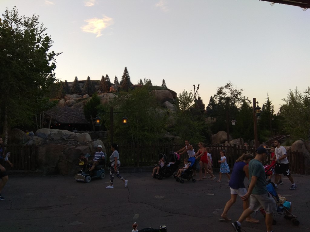 Da wir relativ zeitig da waren, konnten wir uns noch in Richtung Seven Dwarfs Mine Train einen Platz suchen. Nach der Eröffnung begann der Lauf auf die Länder und Attraktionen. Um die teilweise langen Wartezeiten zu umgehen, kann man sich mehrerer Strategien bedienen. Eine davon, der Rope Drop, verlangt das frühestmögliche Erscheinen im Park, um sich an den beliebten Attraktionen direkt morgens anzustellen. Als wir jedoch am Mine Train ankamen, schlängelte die Queue bereits um den Berg herum. Wir hatten zwar keinen Fastpass für die Bahn im Voraus bekommen, vertrauten aber drauf später noch einen reservieren zu können und entschieden uns nicht direkt am morgen in einer Schlange zu stehen, sondern gingen weiter zum Barnstormer.