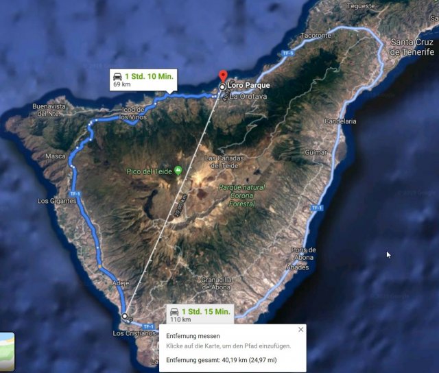 Laut Karte liegen beide Parks Luftlinie rund 40km und mit Auto/Bus gut 70km (1:10 Stunde) auseinander: