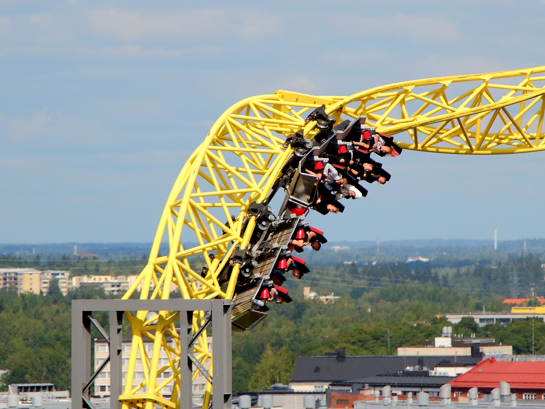Dann setzt er zum höchsten Punkt einer finnischen Achterbahn in 51 Meter Höhe zum Steilflug an.
