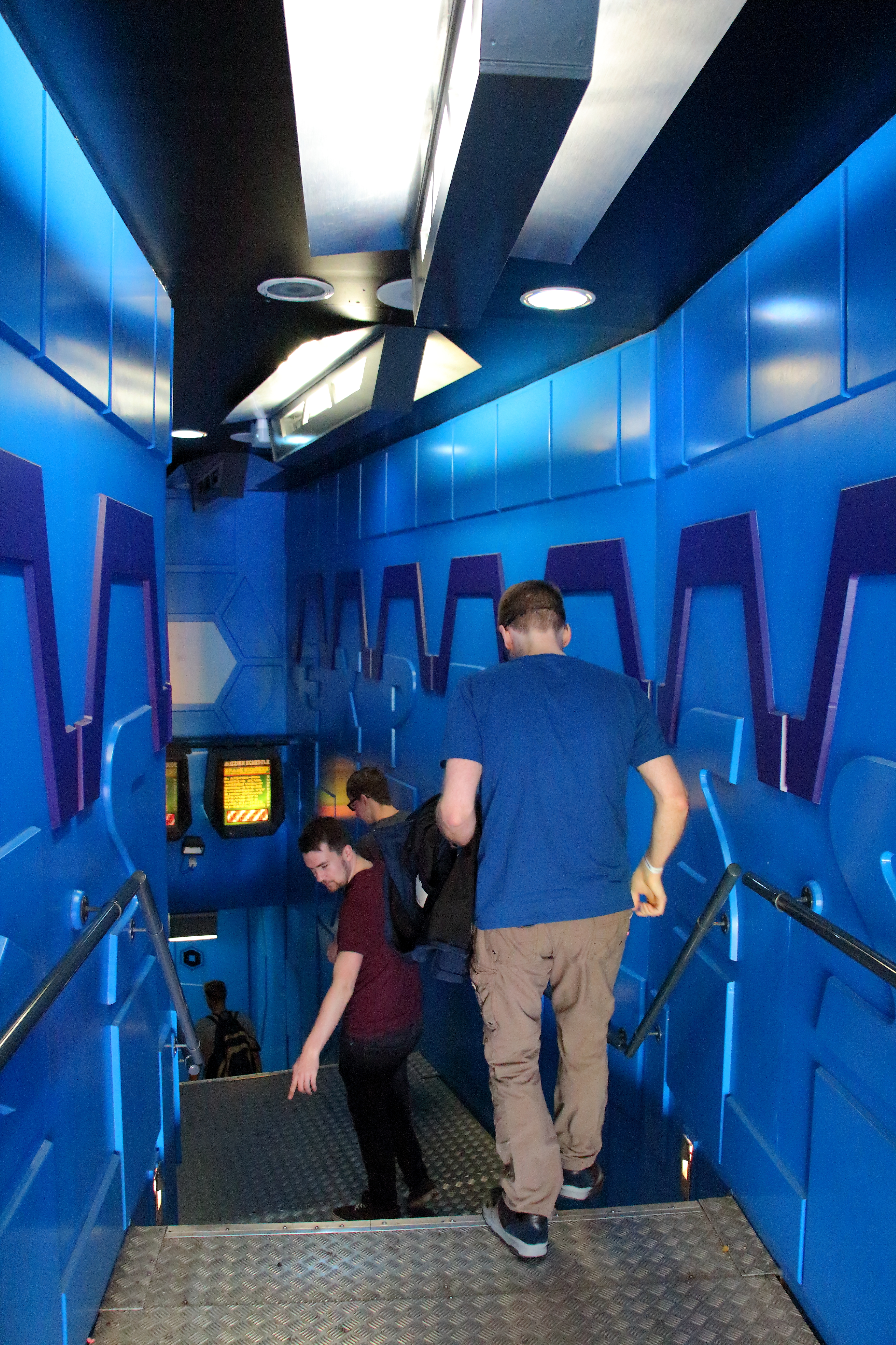 Bei angeschlagenen 60 Minuten (dies ist die einzige Attraktion, wo eine analoge Wartezeitentafel verwendet wird) stellten wir uns am ersten Abend kurz vor 21 Uhr in die Warteschlange.