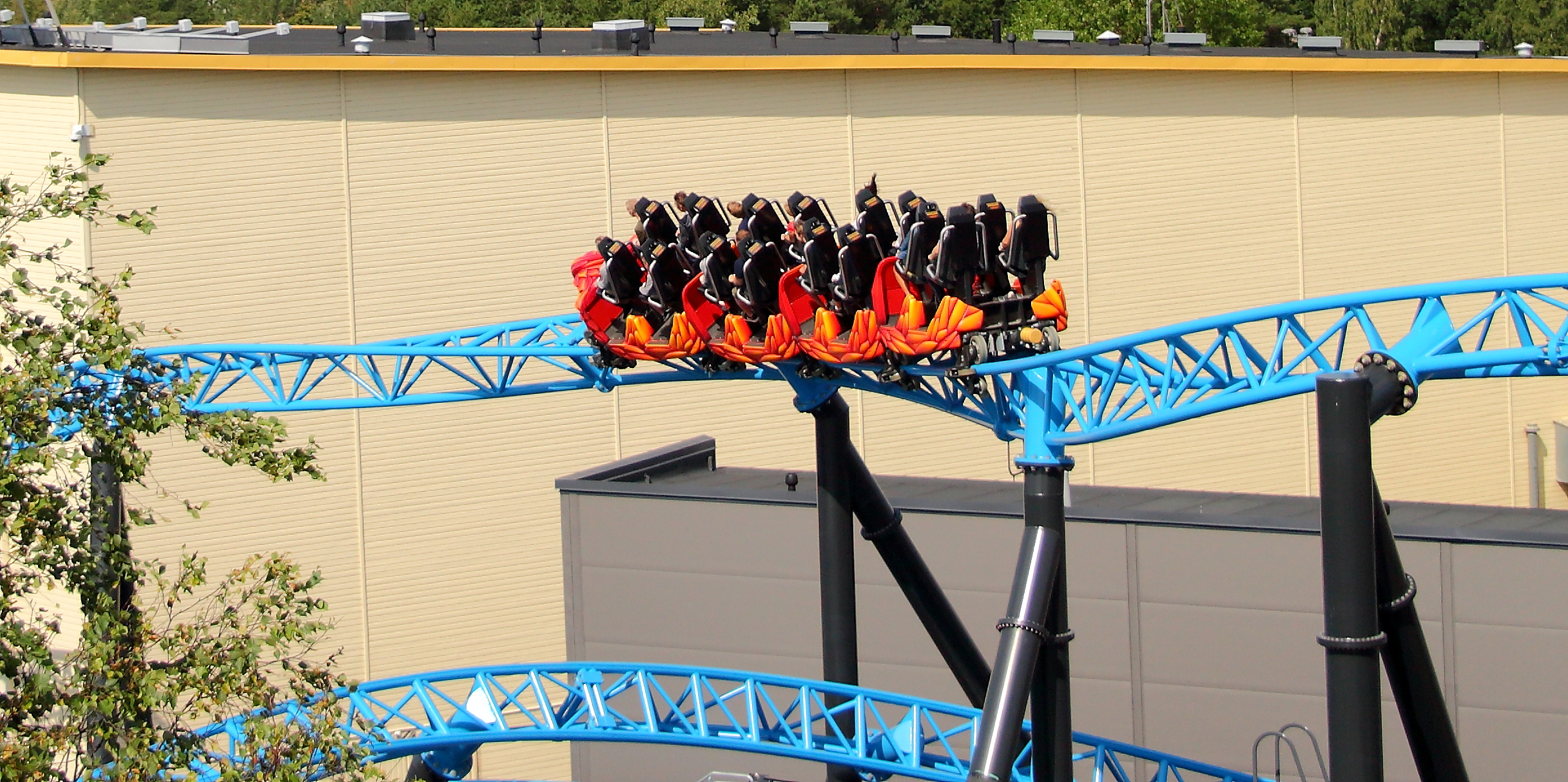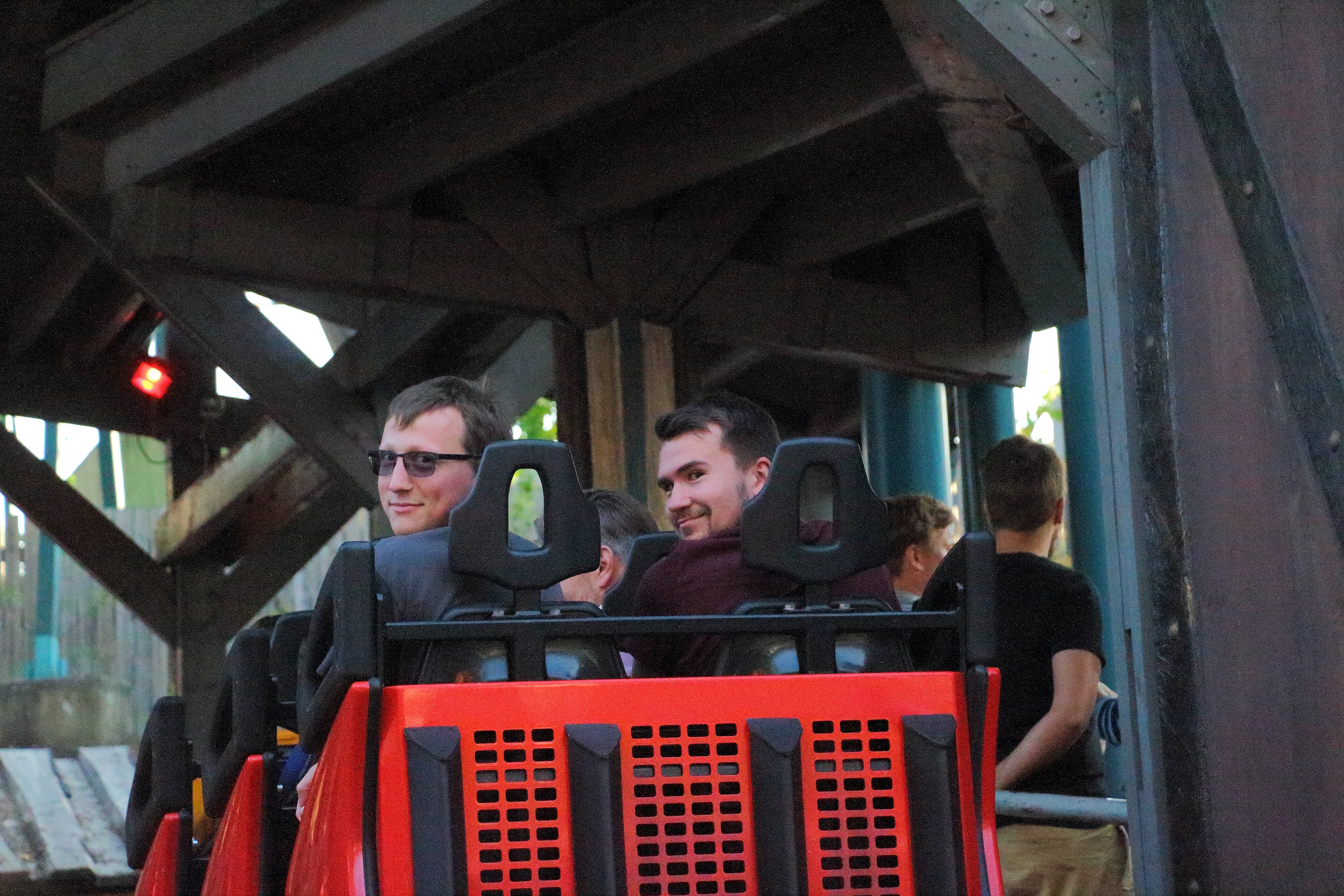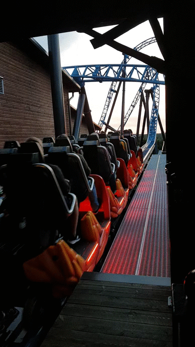 Airtime liefert. Daher haben wir uns für die ersten Fahrten die hintersten Reihe herausgesucht. Die erste Abfahrt bietet dann einen ganz seichten abhebenden Moment. Im Tal schüttelt es dafür ein wenig.