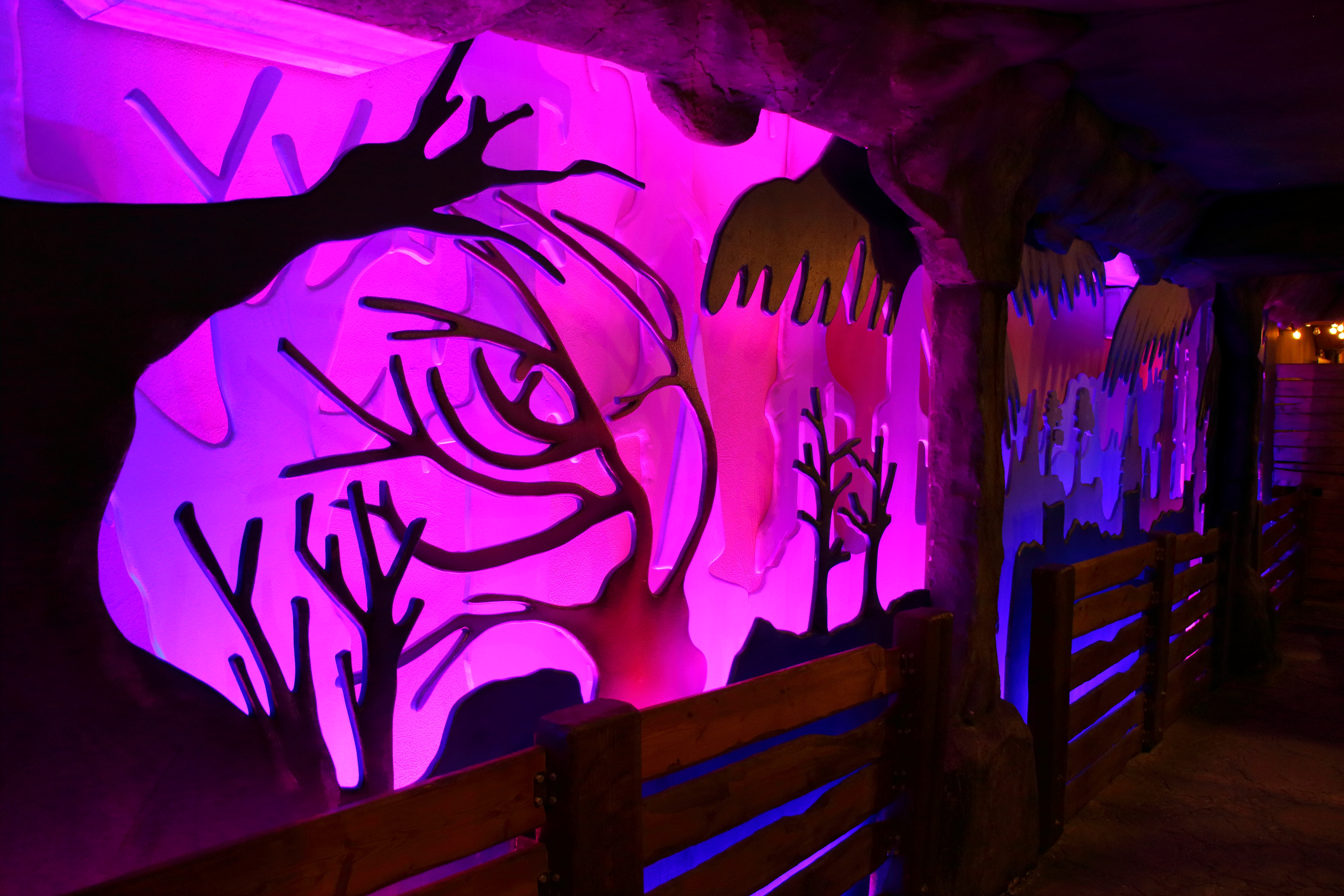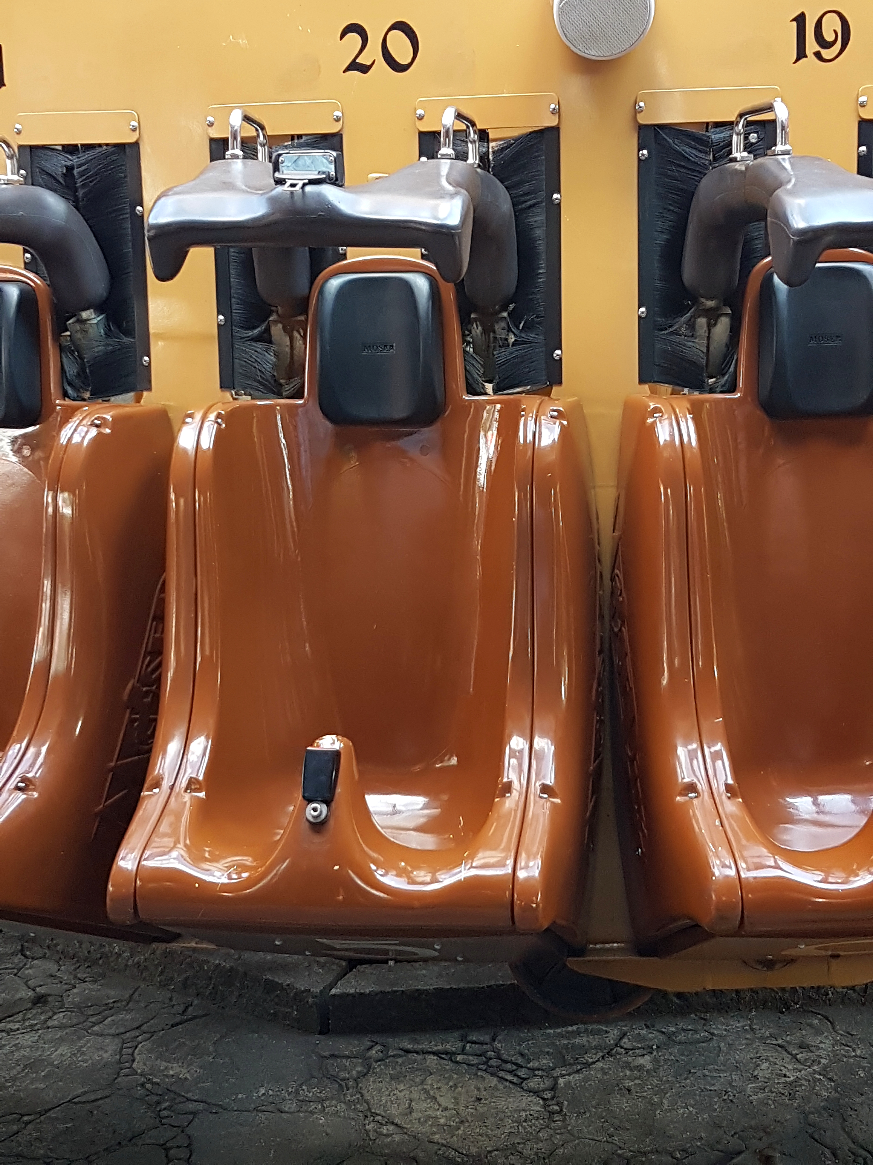 Die Strecke im Tunnel ist dann leider nicht mehr der Rede wert, auch wenn die Fahrt in Dunkelheit etwas das Adrenalinlevel ob der ausgestreckten Arme erhöht. Zurück in der Station öffnen sich dann bei voller Fahrt die Bügel und die Fahrgäste springen heraus. Der Zug wird langsam auf den davor parkenden Zug aufgefahren und der Bremser hüpft in eben jenen Zug und die nächste Runde beginnt. Die Aufsichtsperson in der Station parkt nun den geleerten Zug an der Einstiegsplattform ein und die außenherum geeilten Gäste können wieder einsteigen.