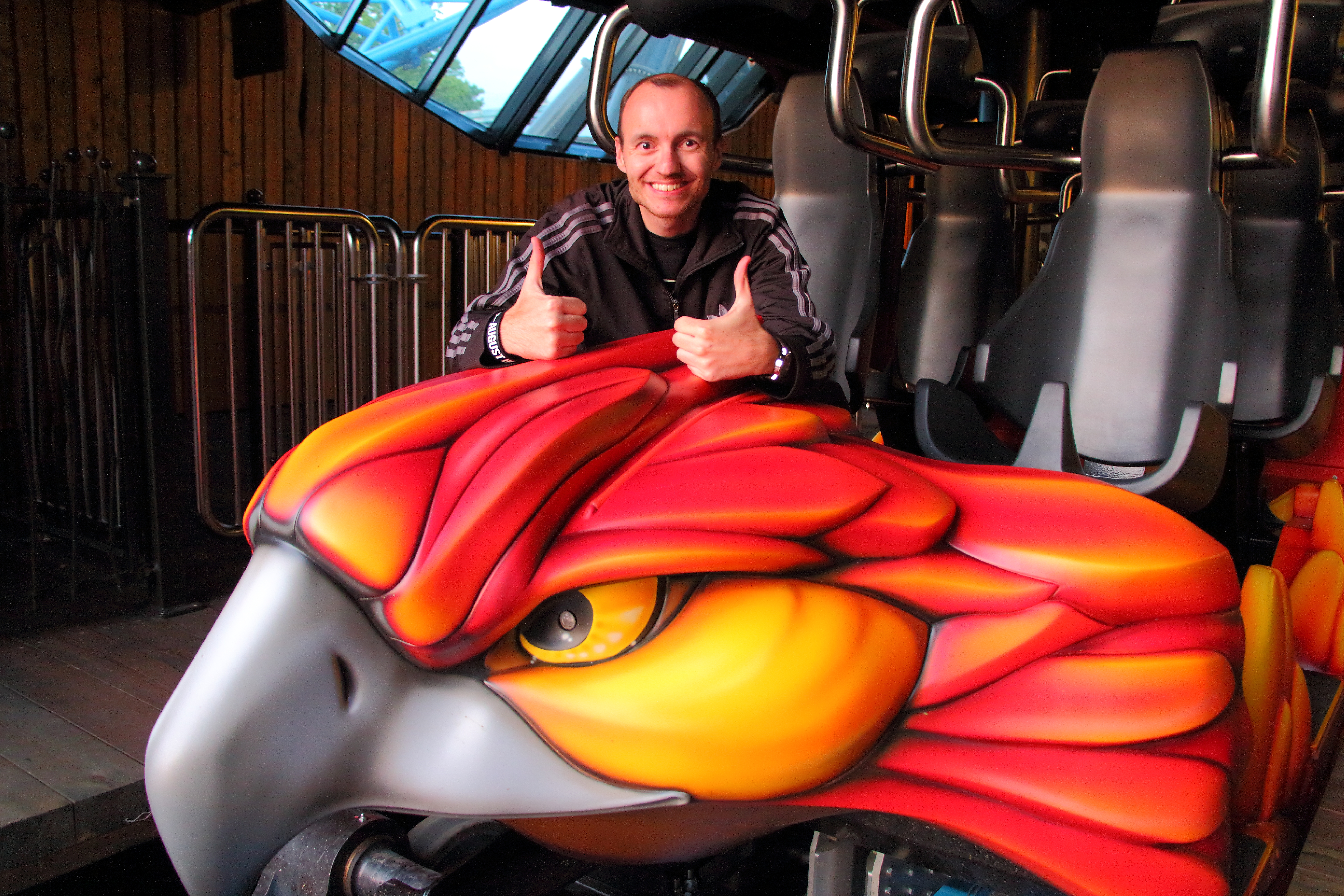 ... und auch etwas in dieser Position bleibt, bevor die Abfahrt beginnt. Mit weit weggestreckten Extremitäten in einer der 1. Reihen des Zuges immer wieder ein sehr geniales Fahrgefühl, das kein Sky Rocket dieser Welt bieten kann.