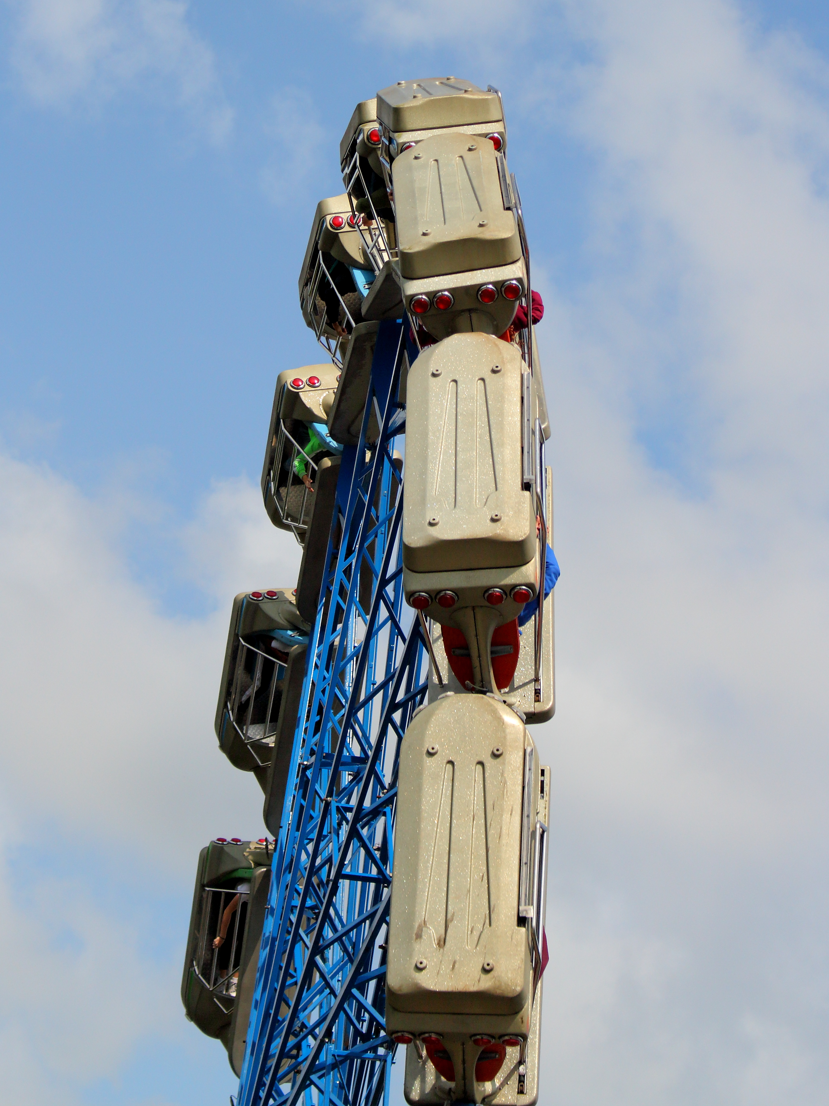 Vekoma Riesenrad, bei dem meistens nur eine Gondel pro Achtel- (oder sogar Viertel-?) Drehung beladen wird. Daher bei meinen drei Besuchen nur zweimal gefahren, als die Warteschlange mal nicht vorhanden war.
