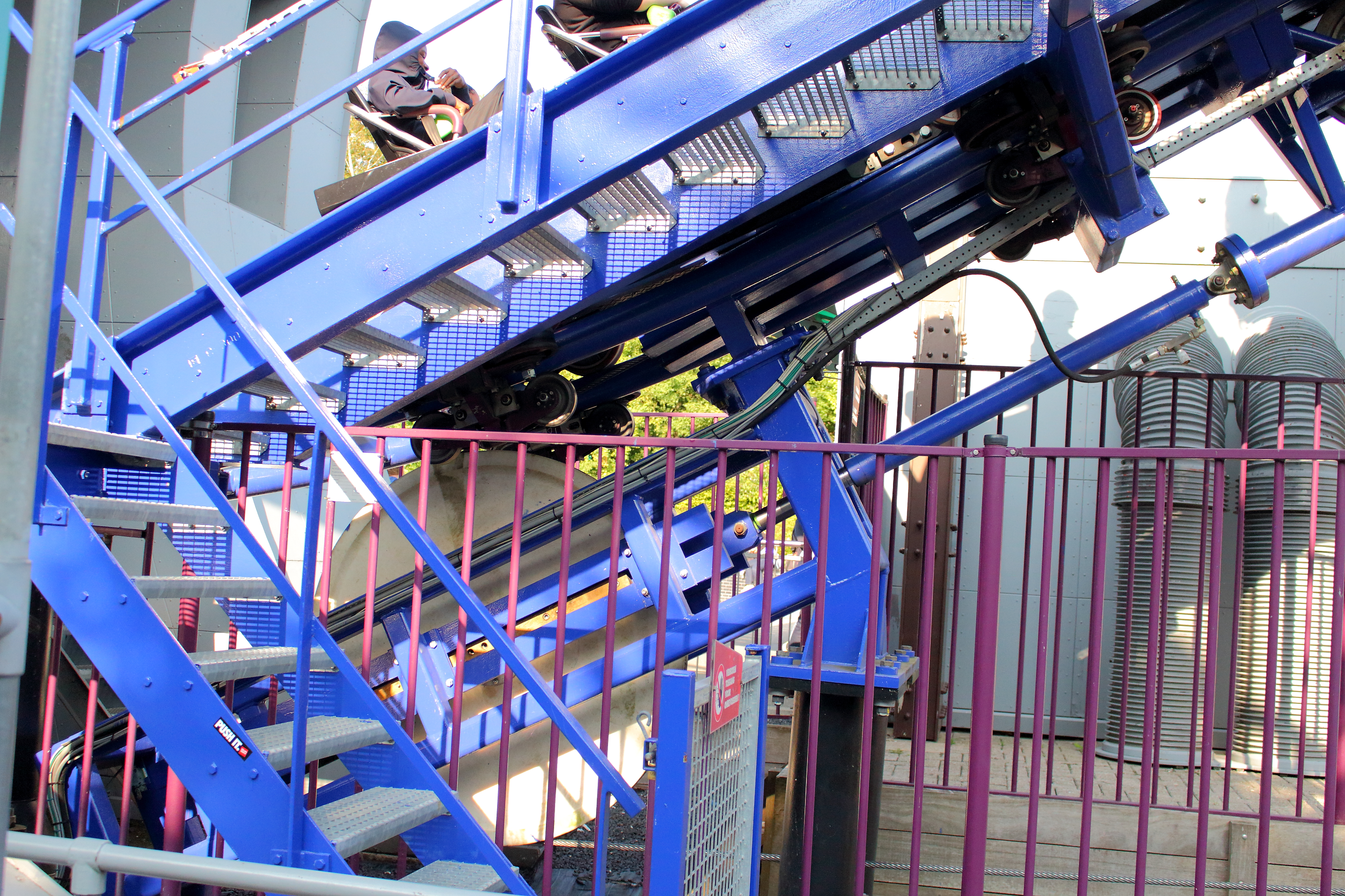 Airtime hatte die hochgelegene Kurve auch zu bieten. Vergleichbar mit der Regina im Tobu Zoo nahm der Zug mit einer leichten Abfahrt immer mehr Schwung auf, bevor es dann steil in den Abgrund ging. Wie in Japan dadurch auf jedem Platz toll zu fahren, hinten aber natürlich besonders, v.a. mit Platz zum Bügel!