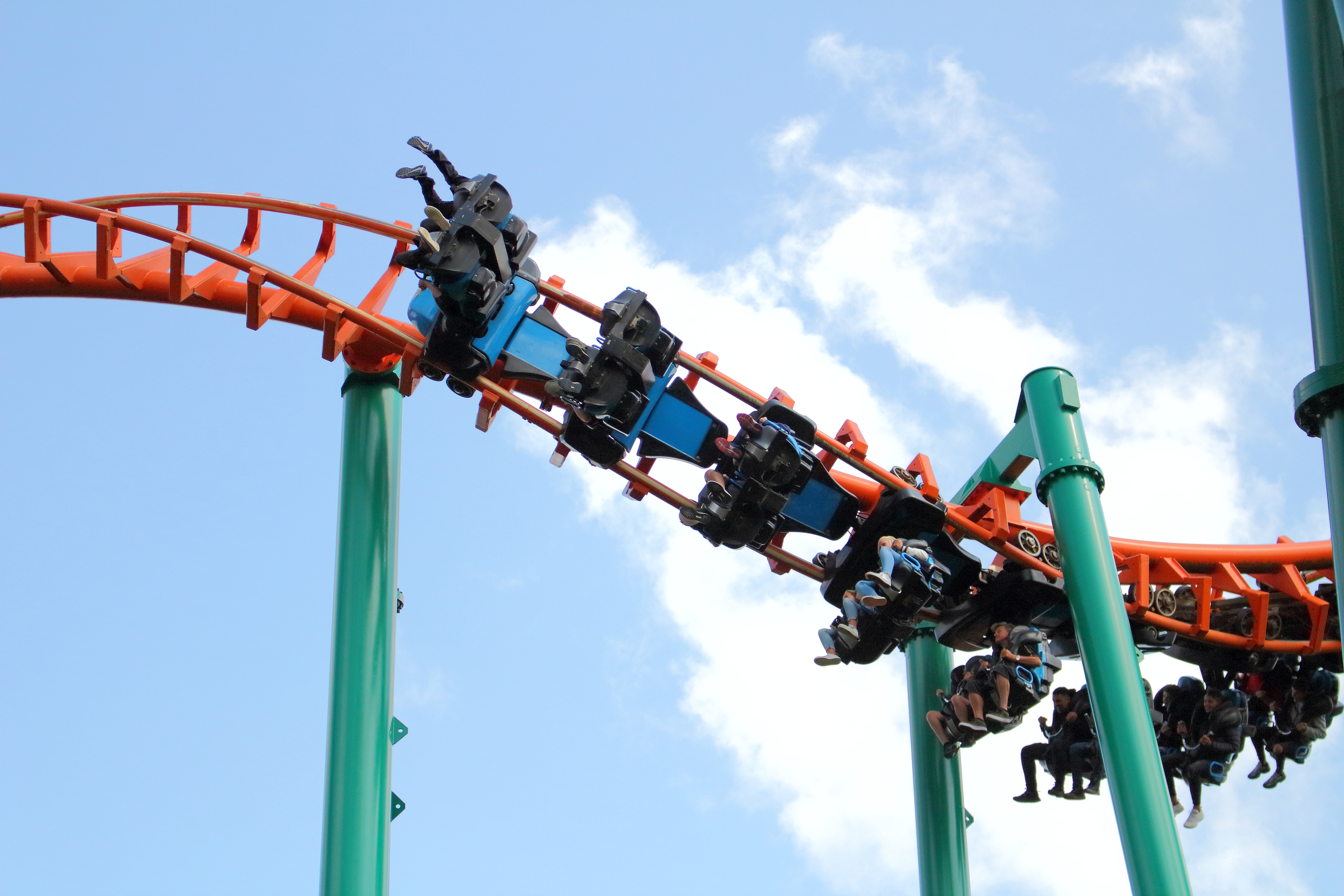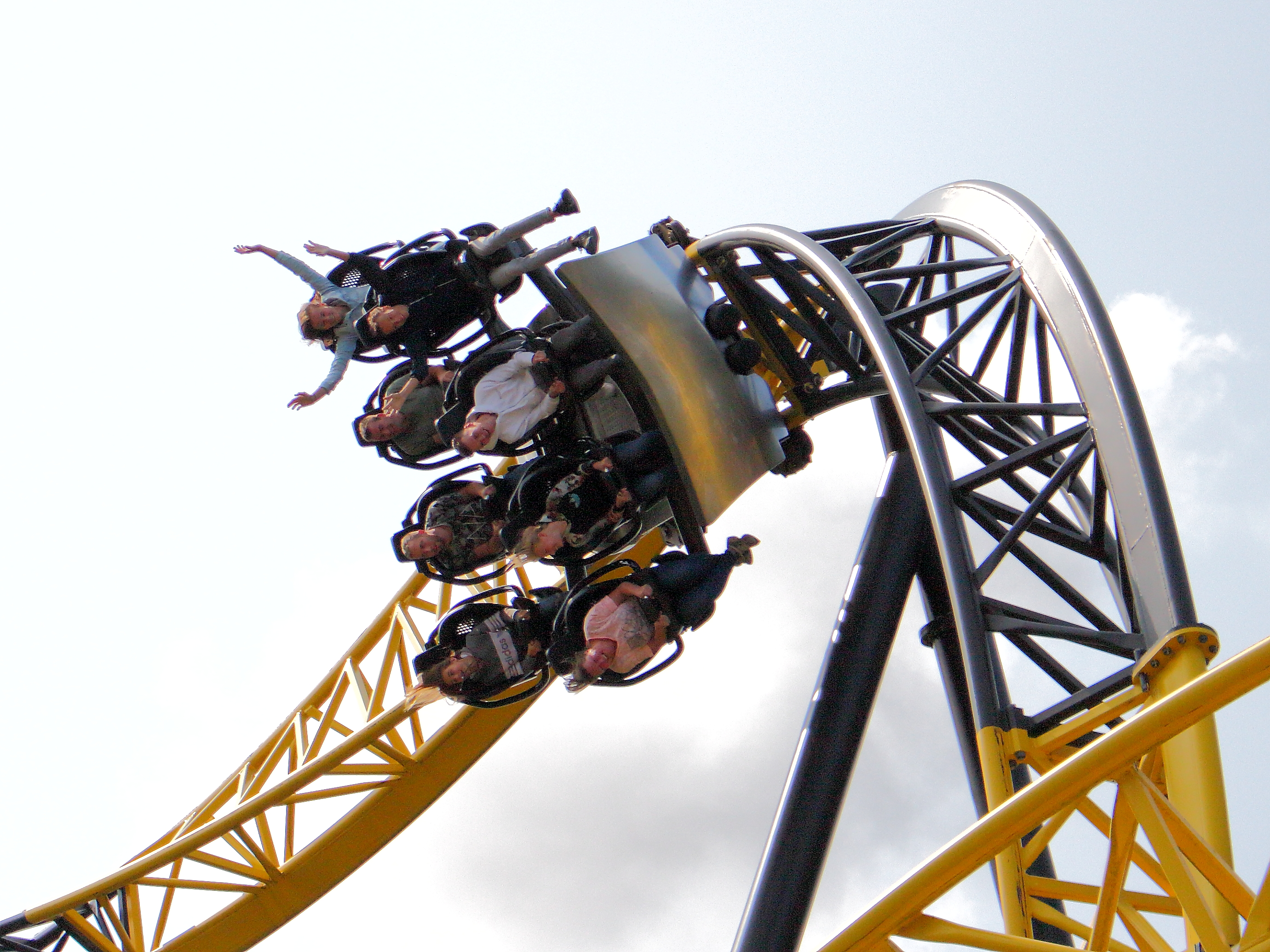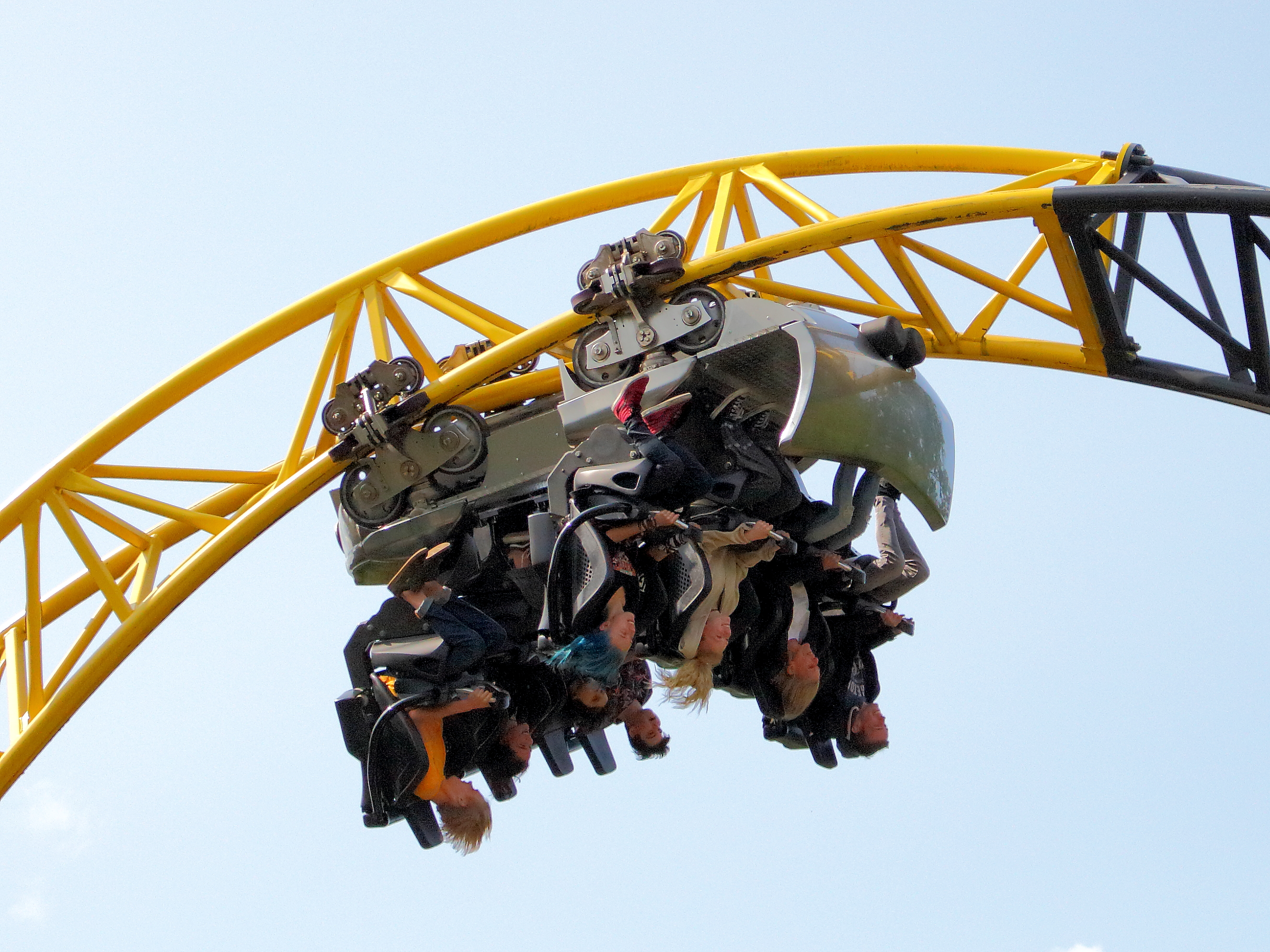 Mit negativer g-Kraft in der Körperrichtung nach links oben. Da es dieses Element leider nicht so häufig gibt, ist es immer wieder überraschend für das Hirn, das dabei eine normale horizontale Schiene erwartet.