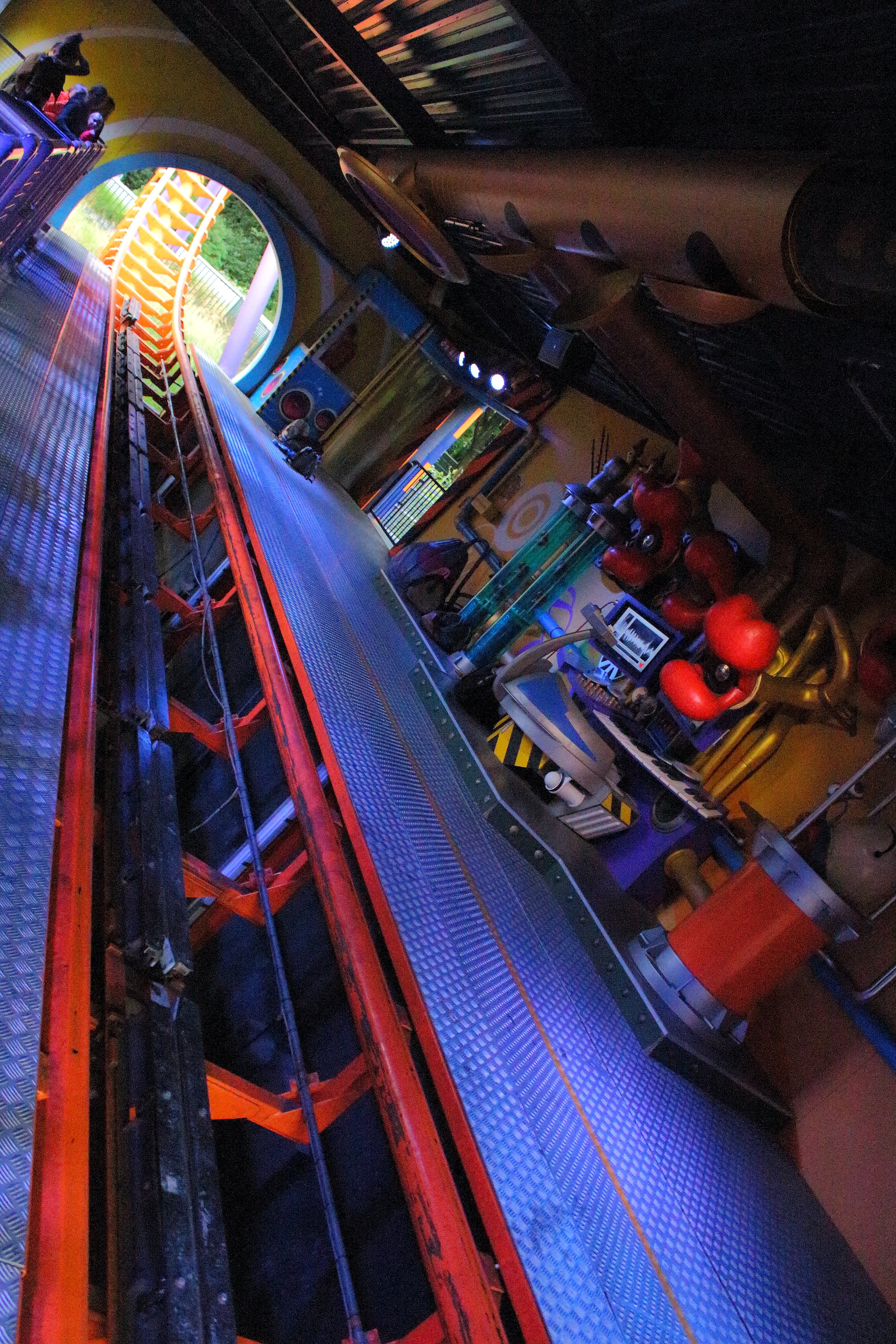 Blockbremse, bei der auch eine eingebaut ist, gibt dann einen schönen Kick nach rechts, der in Paris aber etwas mehr Würze hatte. Dafür ist der kleine Hügel vor der Einfahrt in die Schlussbremse aber auf beiden Bahnen super. Und um wieder die Illusion der U-Bahn aufleben zu lassen, gibt es direkt neben dem Verschiebegleis nochmal einen tollen Effekt, der aber nur im vorderen Teil des Zuges wahrgenommen werden kann. Der Ausgang führt anschließend direkt in den Parkshop, von wo aus ein Weg ...