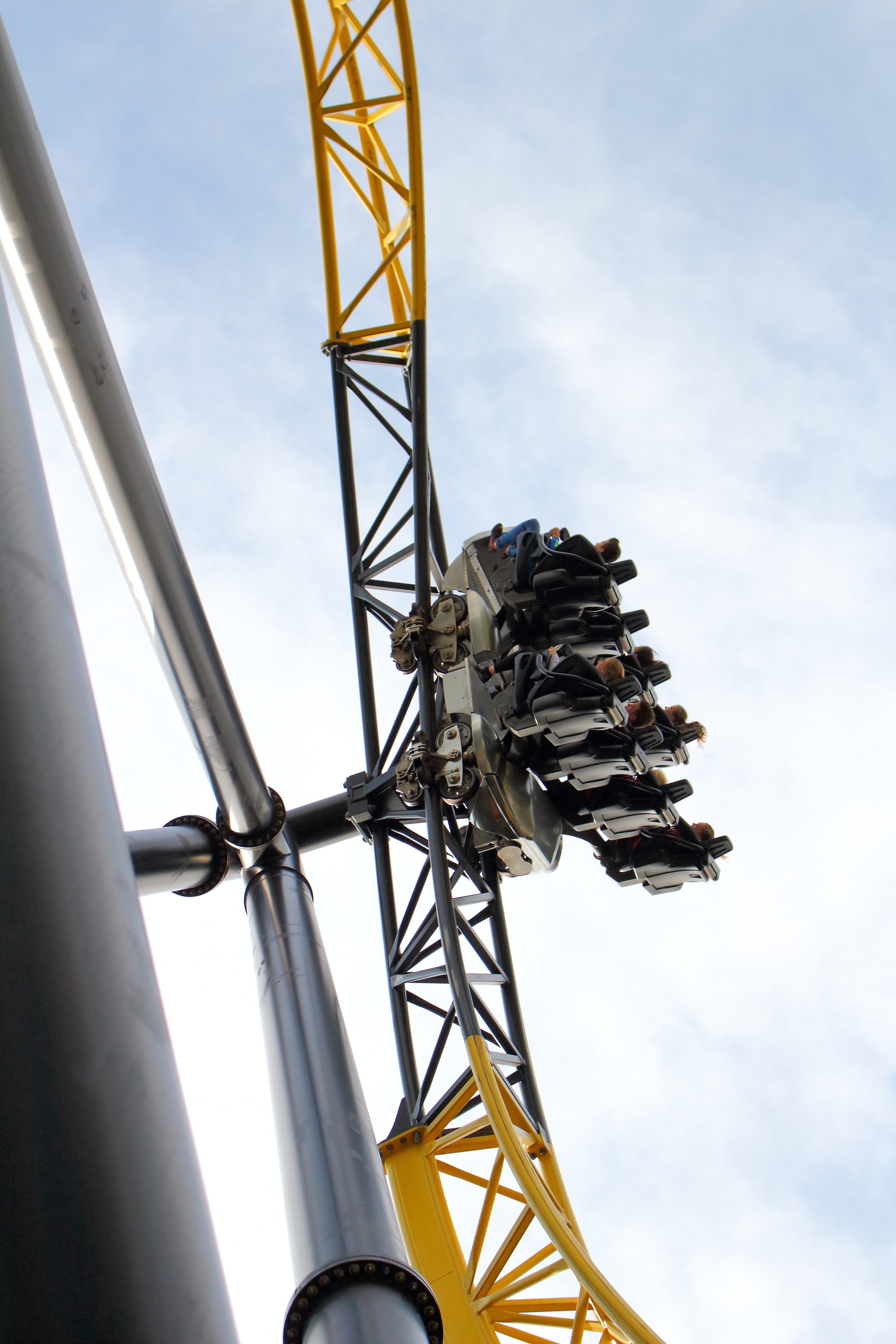 Auch wenn die Strecke ohne Drehung nur wenige Meter lang ist, so verlängert sich das Gefühl durch die ab diesem Zeitpunkt wieder nach unten führende Strecke, wodurch es sich wie ewig lange Sekunden anfühlt. Und das Highlight kommt erst noch: Anstatt einfach nur die 90° Drehung gegen den Uhrzeigersinn zu vollenden, werden stattdessen die 270° zurück in die Horizontale bergab und dadurch immer schneller werdend zurückgelegt. Auf dem besten Platz rechts hinten wandelt sich dadurch der Schwebezustand sehr angenehm zu einem