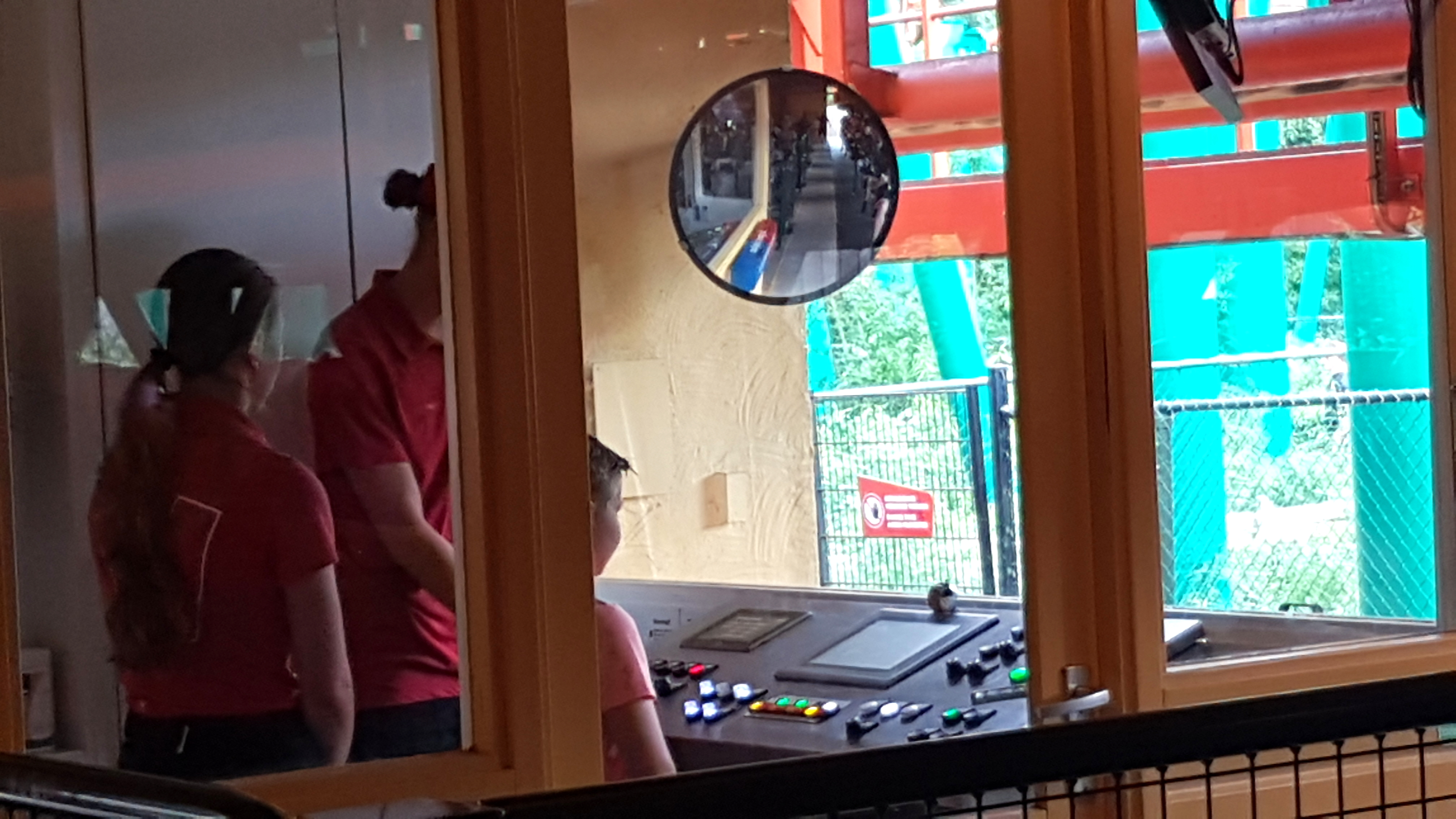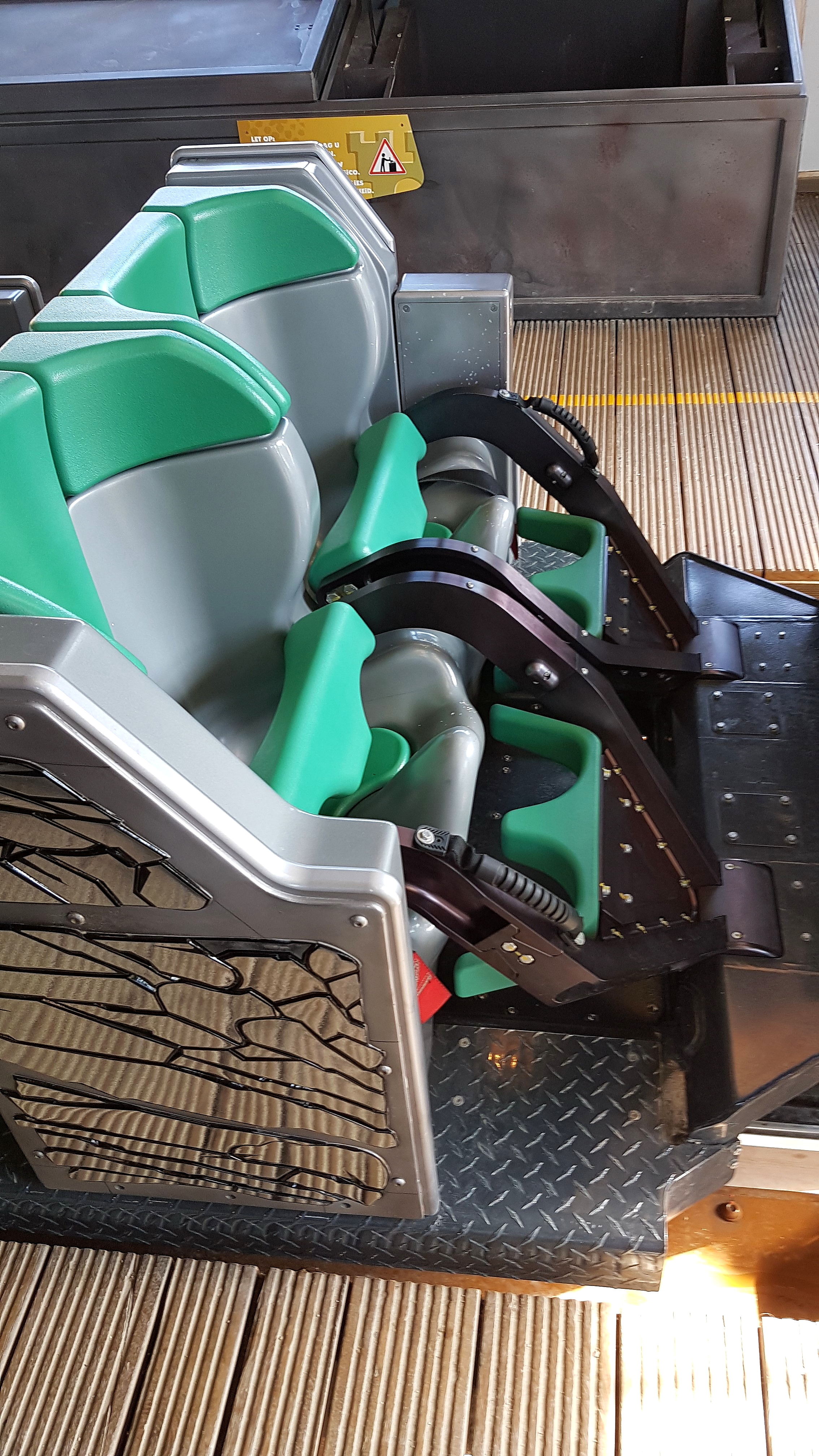 Zuvor wird über die Lautsprecher bei jeder Fahrt mitgeteilt, dass die Fahrgäste nur die Gurte schließen sollen und der Bügel von den Mitarbeitern geschlossen wird. Diese haben ein Gadget, das mir im Laufe der Fahrt noch ordentlich auf die Nerven gehen wird. In der Station führen sie zumindest dazu, dass ich zwischen Oberschenkel und Bügel noch einige Zentimeter Luft habe. Die sind dann wiederum an etlichen Stellen von großem Vorteil.