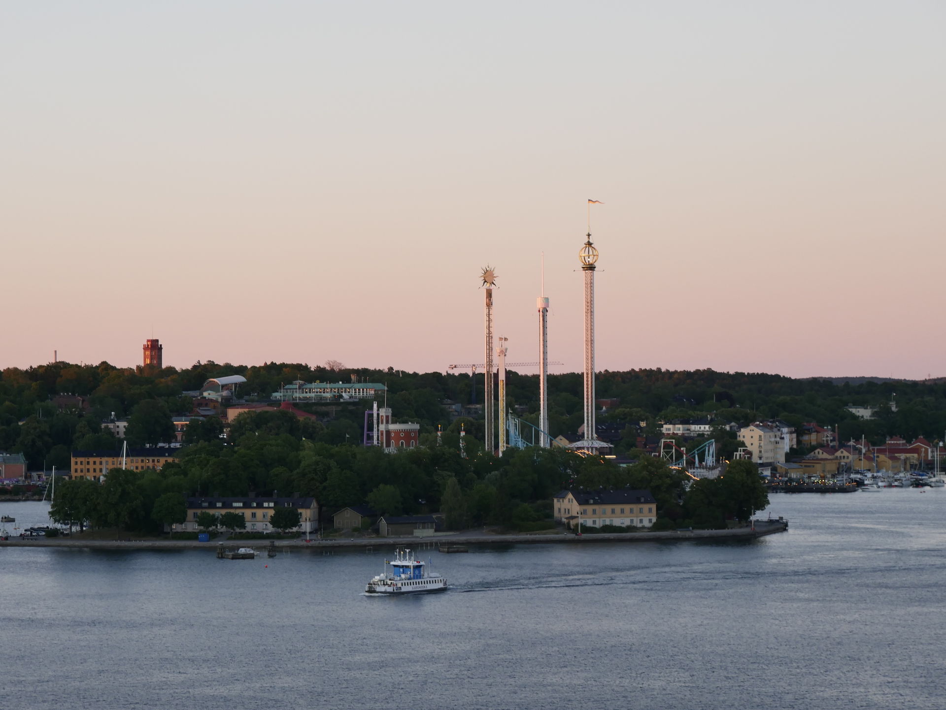 Die frisch gekauften 3-Tage-Nahverkehrstickets setzen wir gleich für eine Fahrt Richtung Djurgarden per Fähre ein. In wenigen Minuten ist der Djurgarden erreicht. Vom Wasser hat man einen tollen Blick auf die Skyline von Gröna Lund mit inzwischen 4 Türmen.