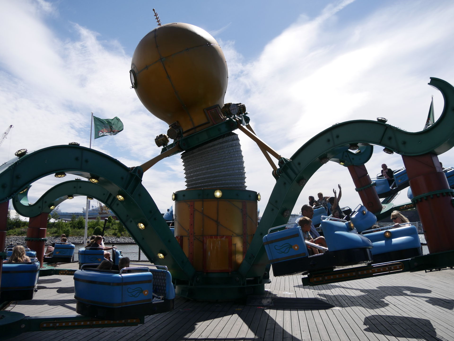 Sitzt man zunächst mit Blickrichtung zum Hafen, hat man das Gefühl am Ende der Strecke ins Wasser zu fallen, sehr spaßiges Gefühl. Doch es geht mit einem relativ intensiven Ruck Etage für Etage tiefer, ist meiner Meinung nach aber nicht so schlimm/schmerzhaft wie öfters im Vorfeld gehört. Leider hat es mit einer kompletten Drehung meistens nicht geklappt, wir sind nur ein bisschen hin und her gependelt. Alles in allem aber keine ERT-taugliche Bahn, ein-zwei Fahrten genügen dann doch. Für Zwischendurch aber ganz lustig, ist halt mal was anderes.