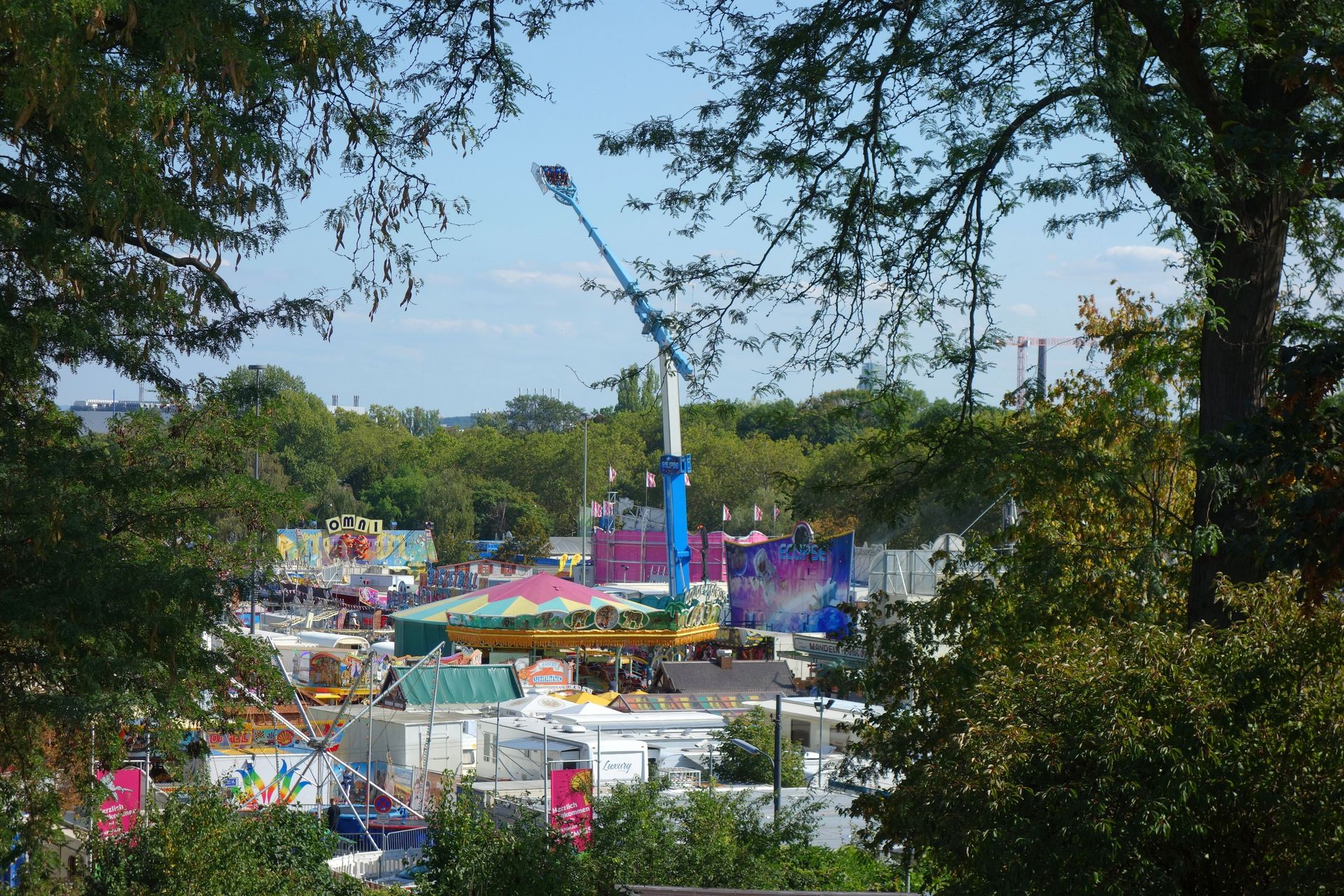 Damit hatten wir die ziemlich schwache Herbst-Dippemess nach einer guten halben Stunde auch schon komplett gesehen. Für das Übersichtsbild erklomm ich noch die kleine Anhöhe über der U-Bahn-Station, dann fuhren wir wieder retour. Ursprünglich sah mein Plan vor, sich kurz im Hotel frischzumachen und dann auf dem Weg zur Veranstaltung noch schick Essen zu gehen. Aber erstens waren wir dafür ja noch zu früh an, zweitens sollten die meisten Restaurants erst um 18 Uhr - und damit recht spät - wieder öffnen. Daher hatten wir das Essen vorgezogen und zu einer weniger schicken Location verlegt. Wir fuhren mit der U-Bahn weiter zur Messe. Die Klima-Demonstration anlässlich der gerade gestarteten IAA konnten wir so auch noch am Rande begutachten. Wir interessierten uns in diesem Moment aber weder fürs Klima, noch für die ausgestellten Autos, wir hatten einfach nur Hunger. Als Kompromiss hatten wir uns auf den Food Court des Einkaufszentrums Skyline Plaza geeinigt. So konnte rcmania als eingefleischte Vegetarierin einen Salat essen, während ich mir beim Asiaten Nudeln mit Ente besorgte. Unterdessen befand sich mein Personalchef wohl gerade auf dem nahen Maintower, wie ich später bei Facebook feststellte.