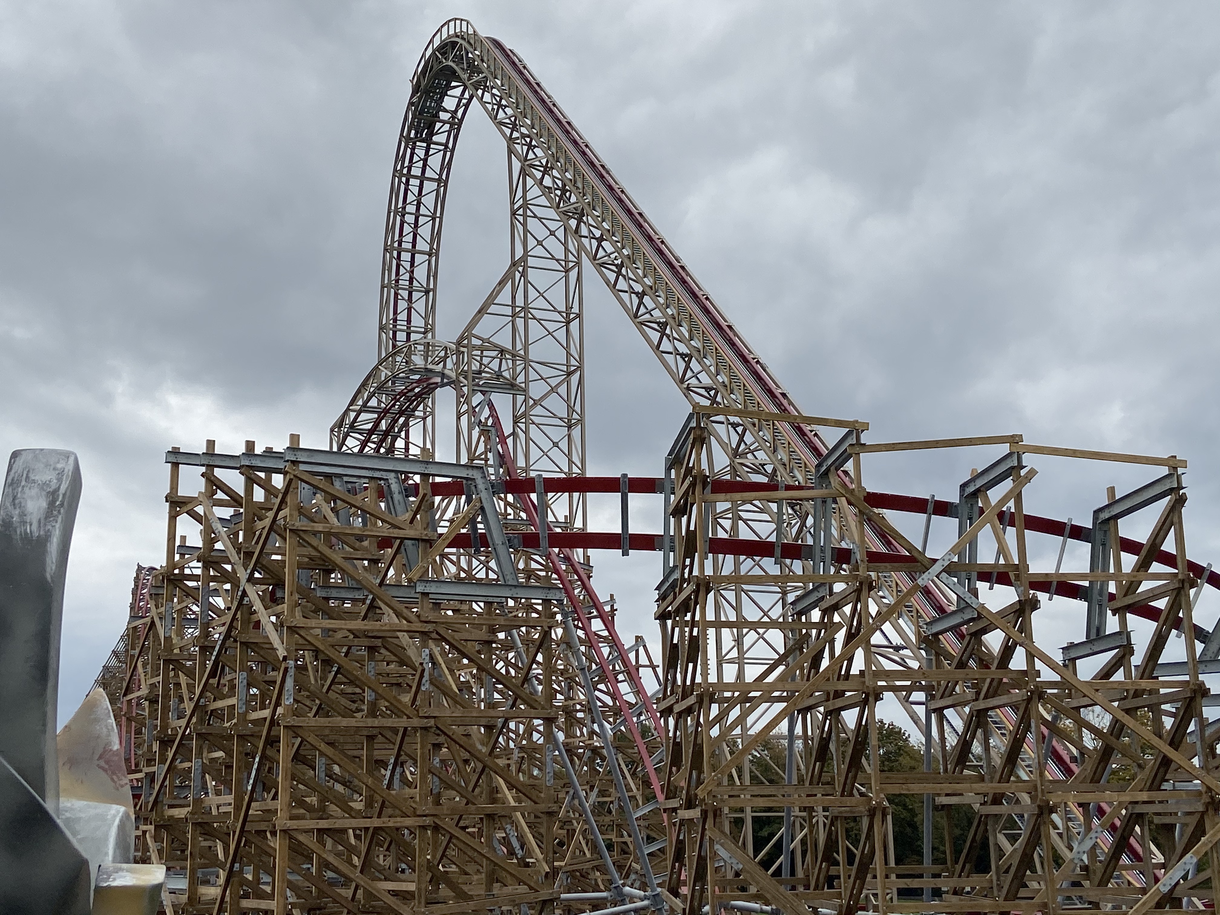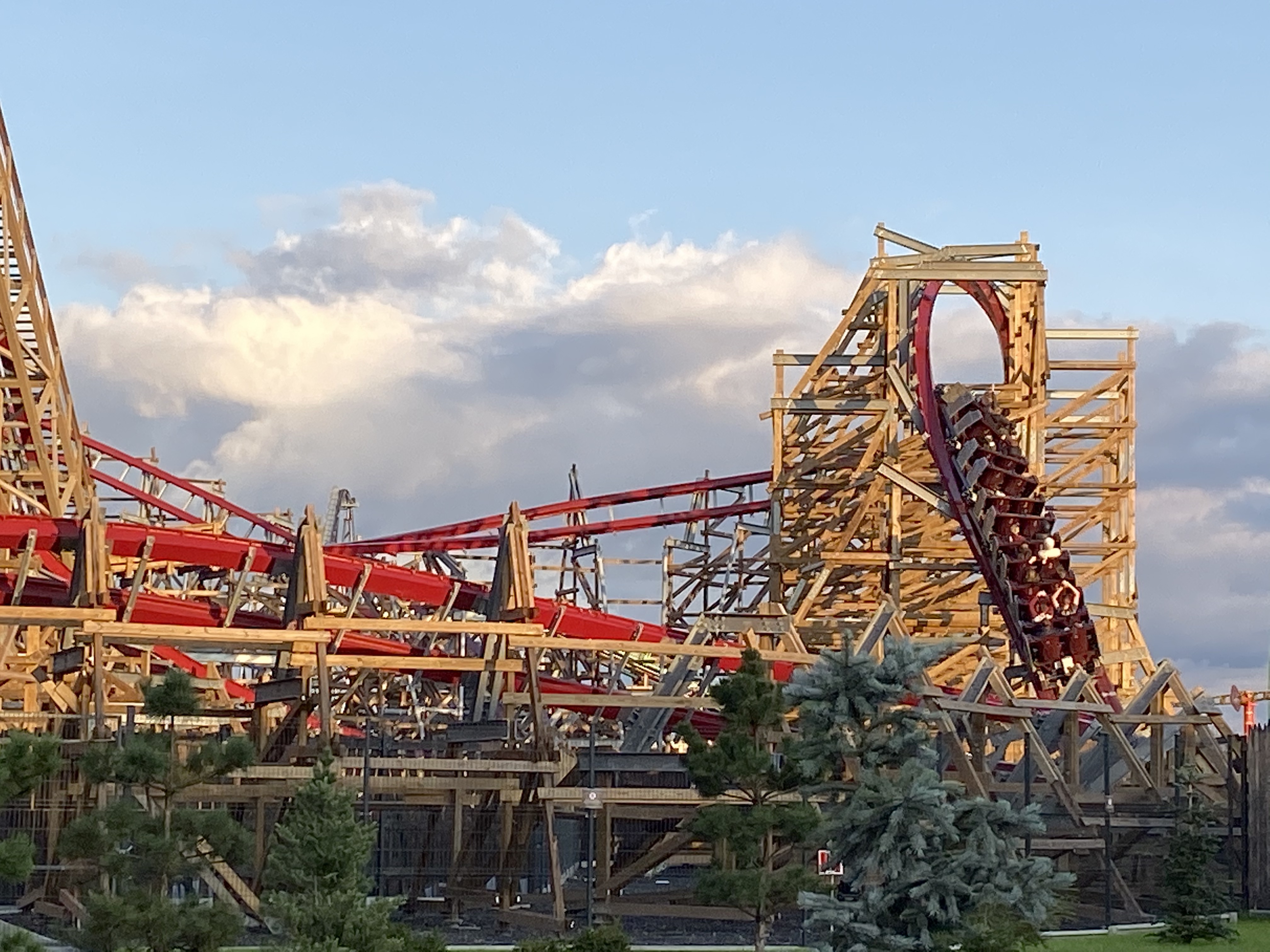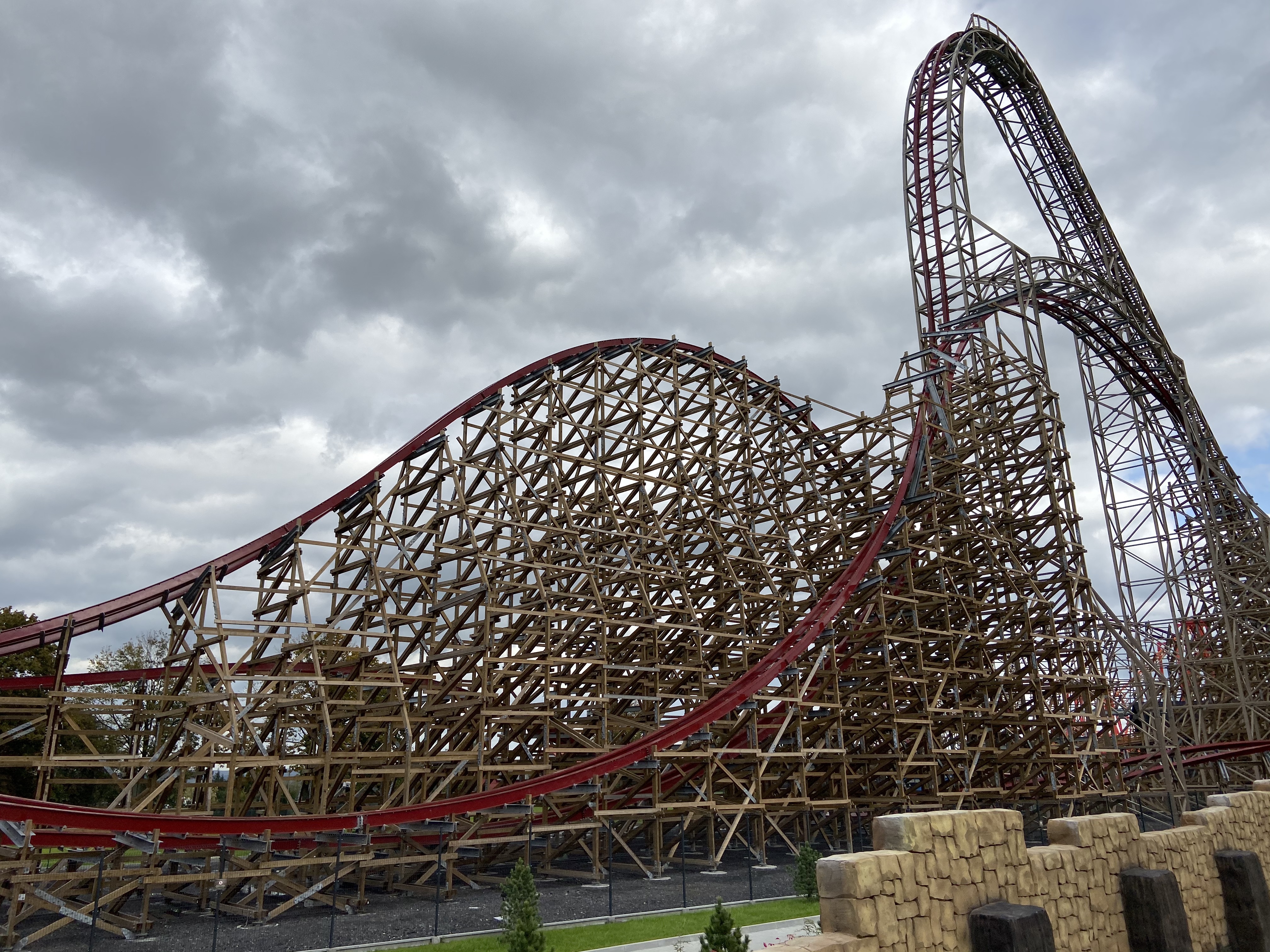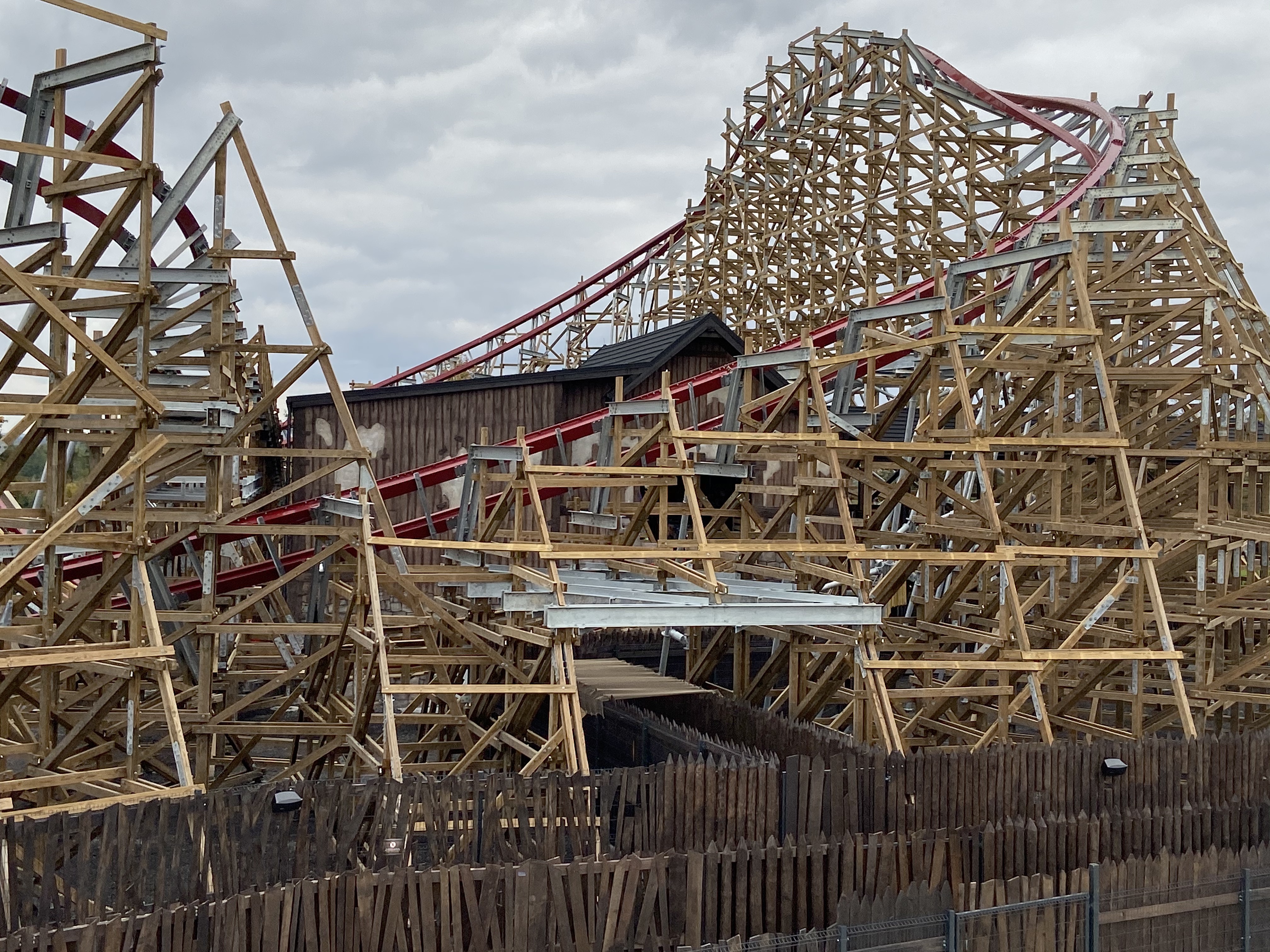 Wooden Coaster - wobei man feststellen muss - es ist Hybrid mit Stahl - also nicht alles nur Wooden Coaster. Aber das Holz ist hier schon hoch gestapelt und schaut verdammt lecker aus.