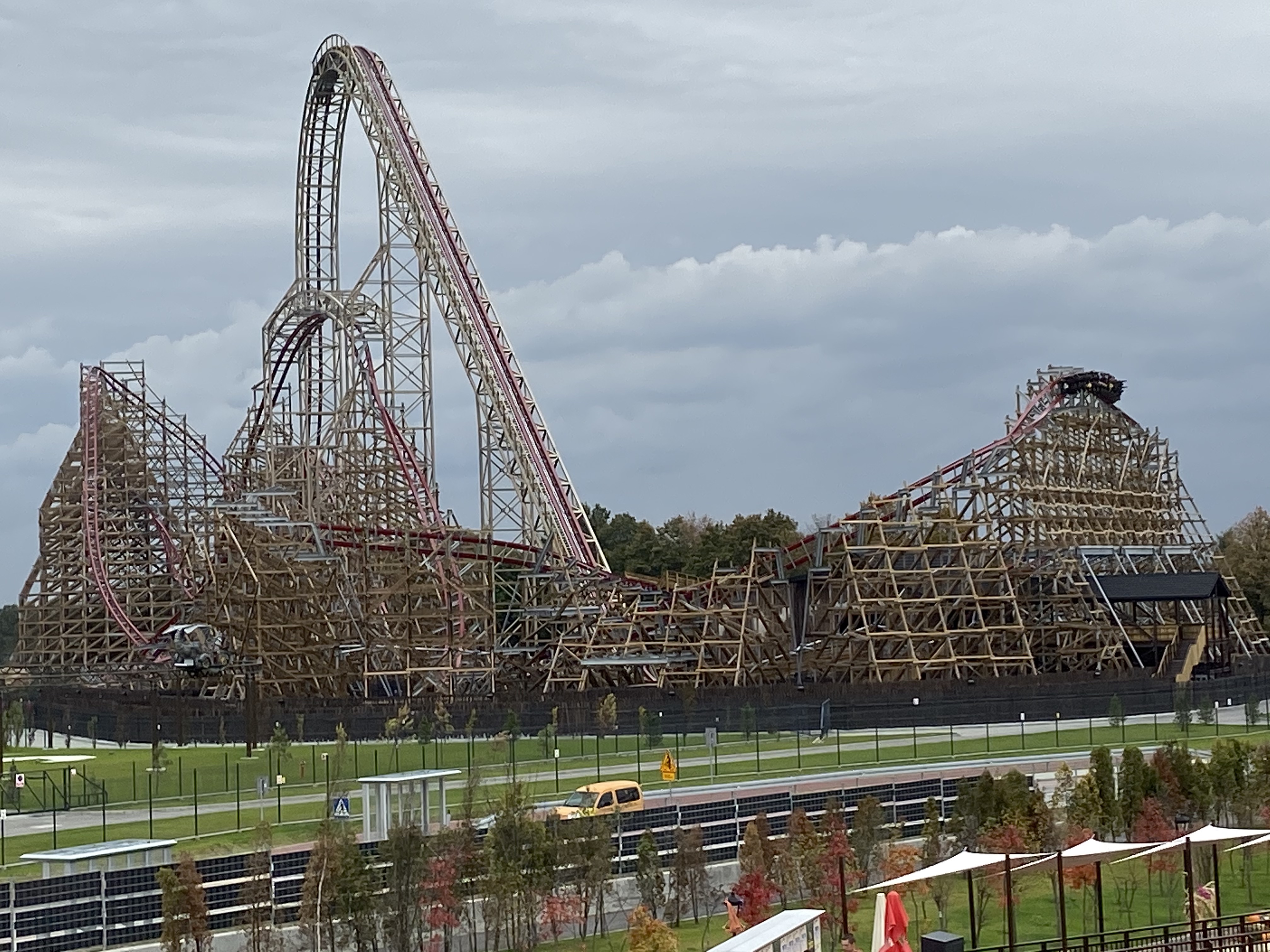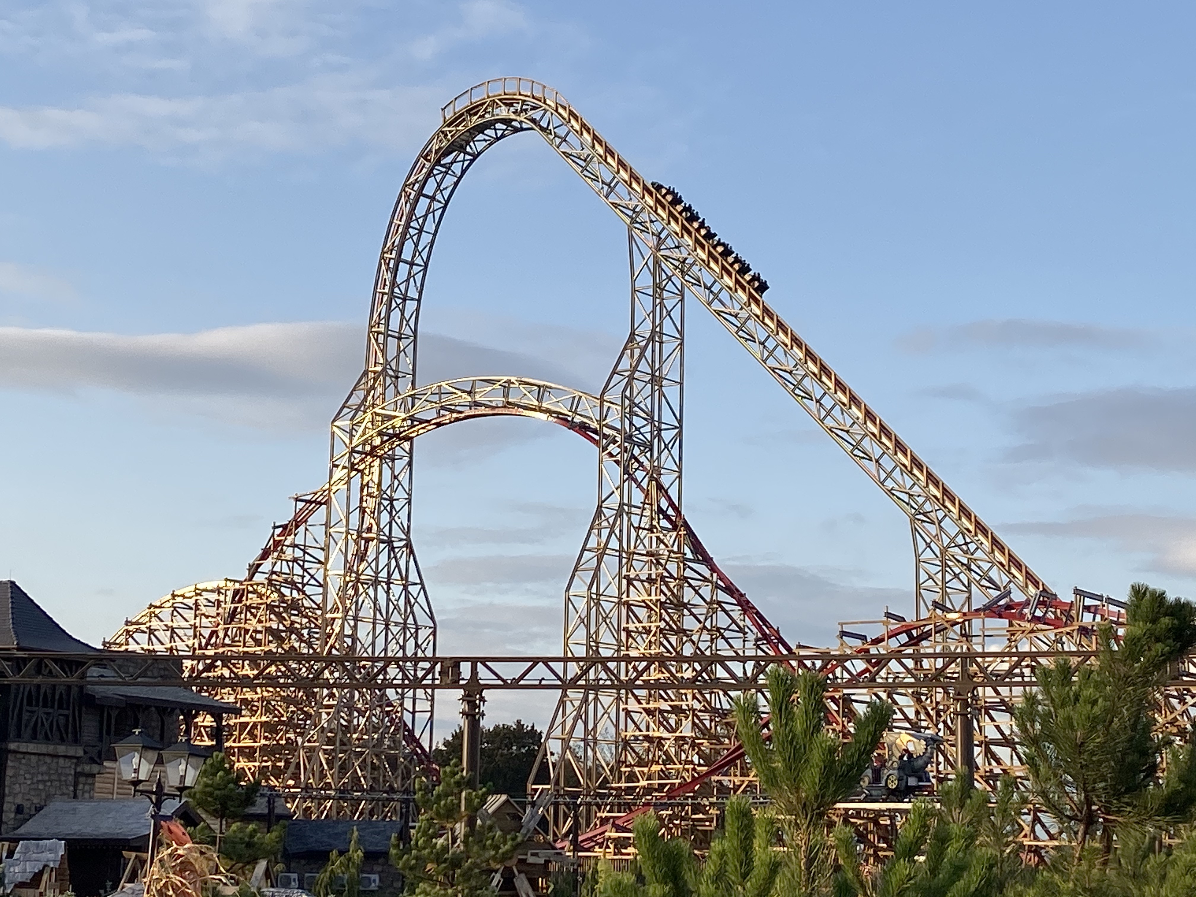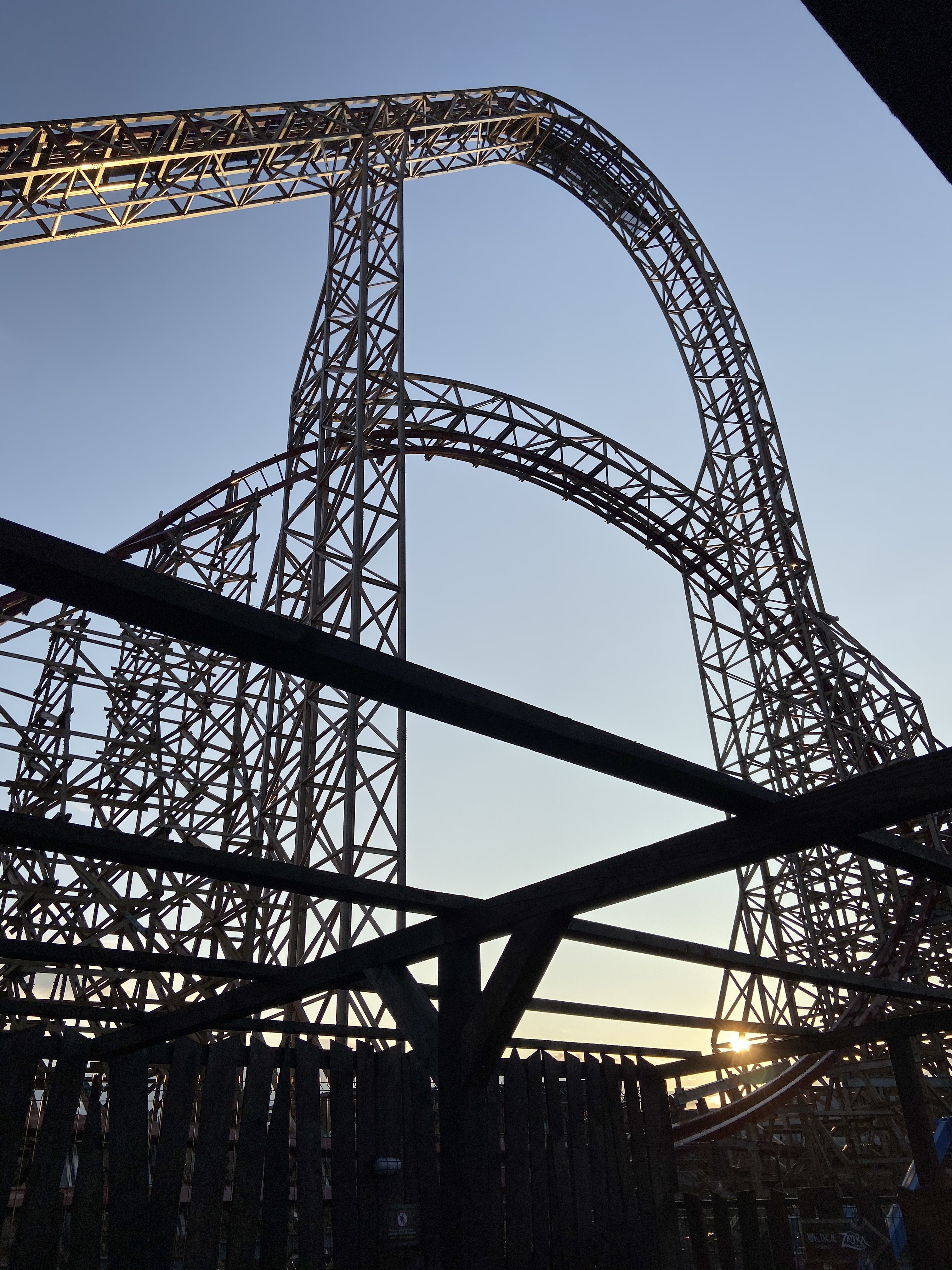 Wooden Coaster - wobei man feststellen muss - es ist Hybrid mit Stahl - also nicht alles nur Wooden Coaster. Aber das Holz ist hier schon hoch gestapelt und schaut verdammt lecker aus.