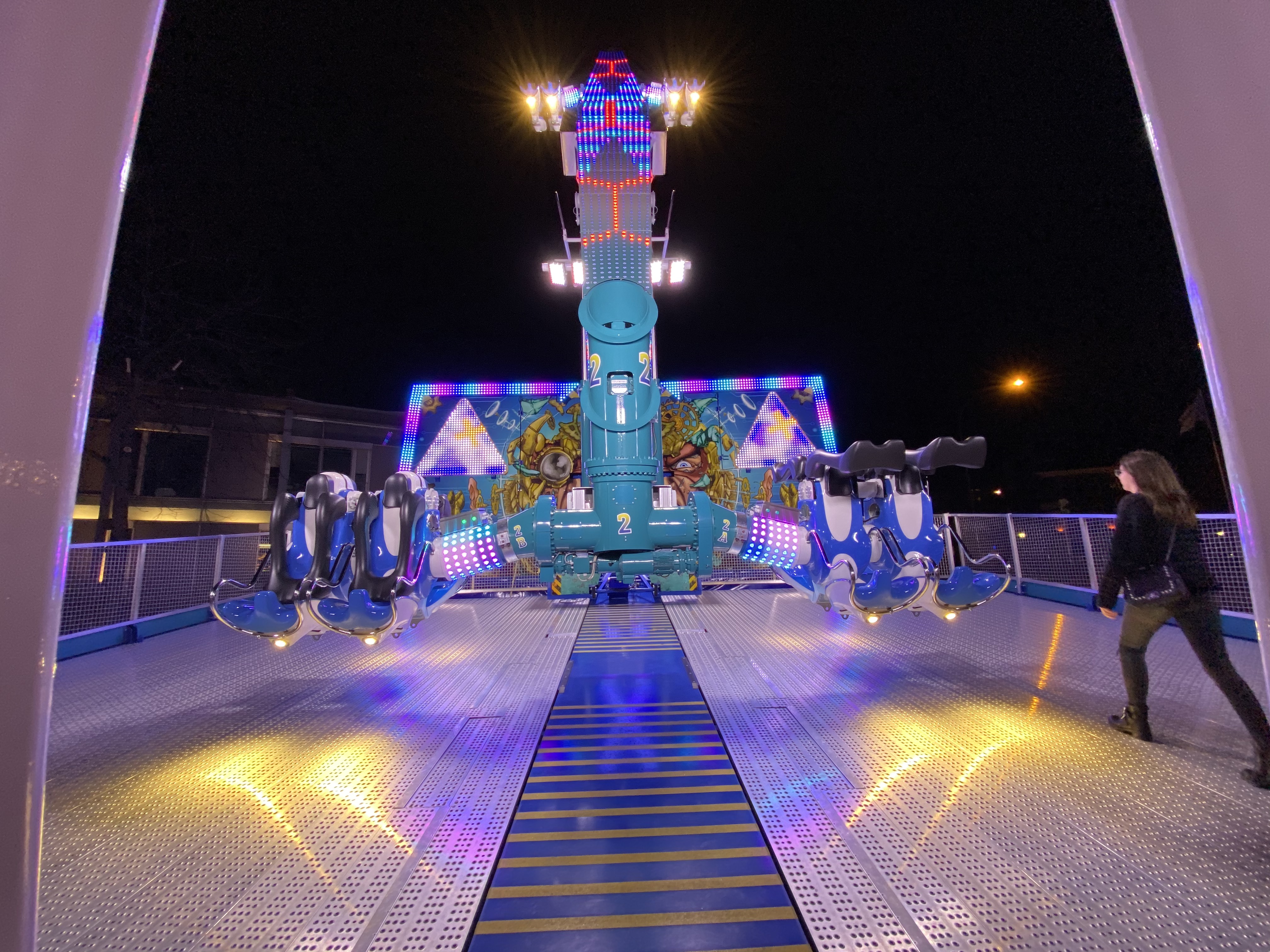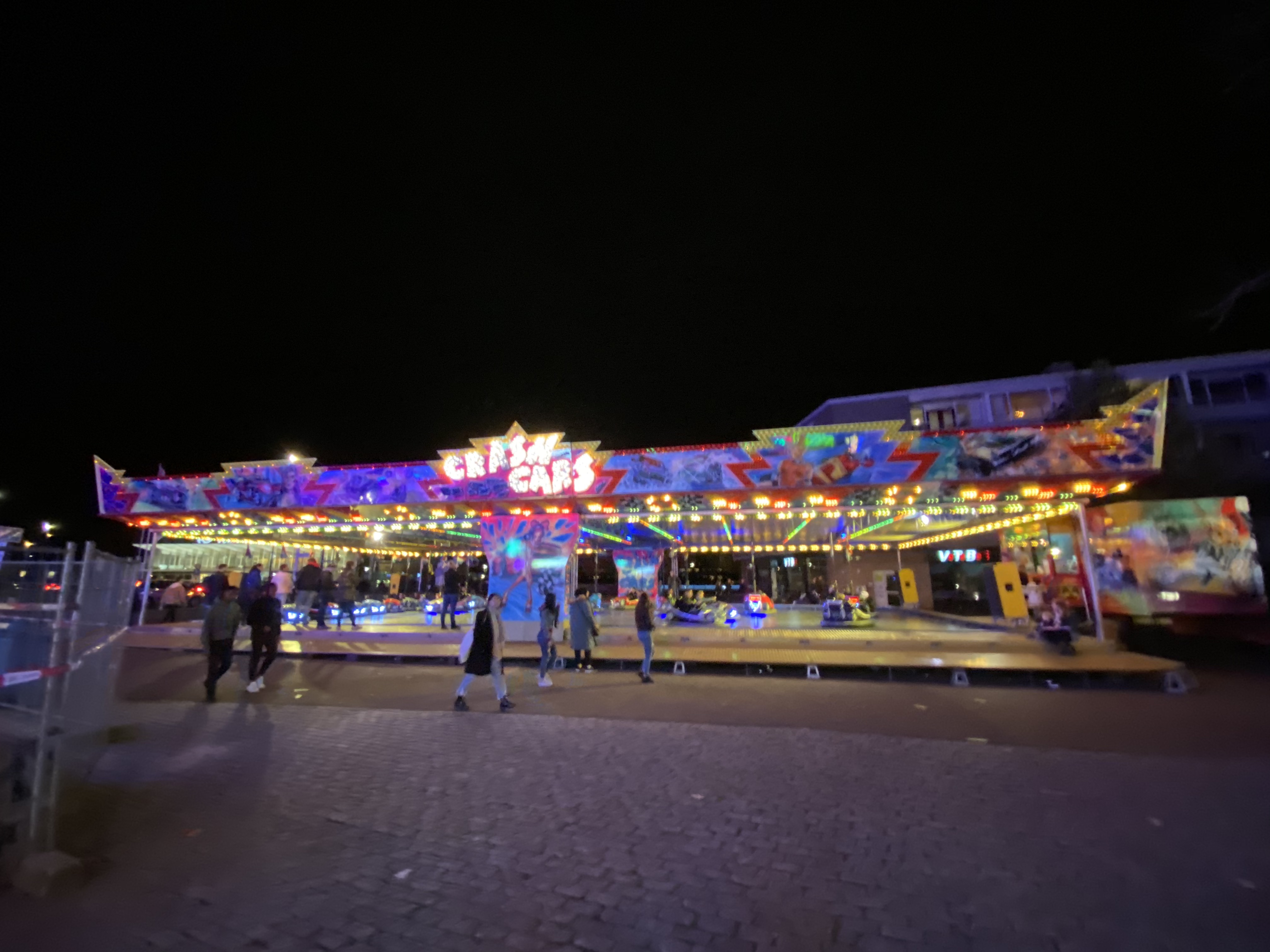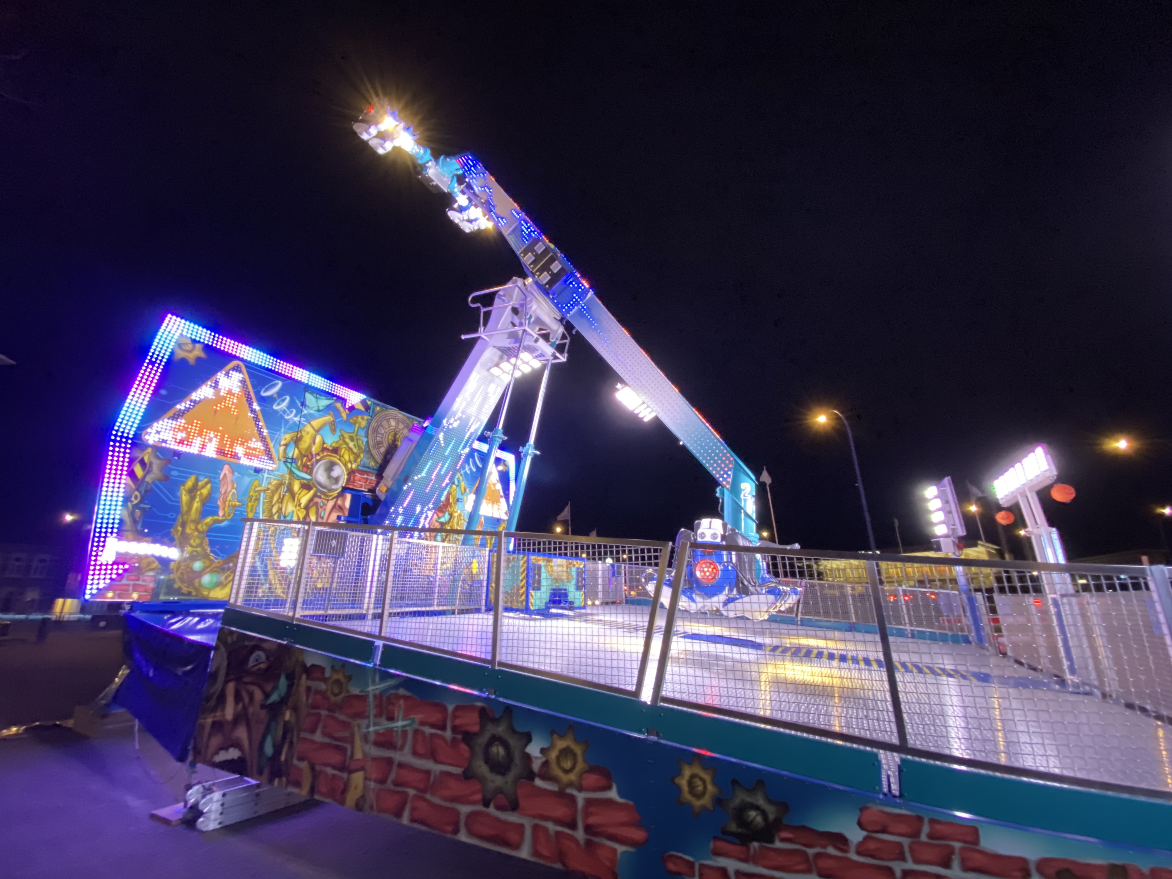 Hauptaugenmerk lag auf der KMG-Neuheit X-Drive, die hier unter dem Namen Dance-Mix unter dem Schausteller Otten den Startplatz der Kirmes am Bahnhof markiert.