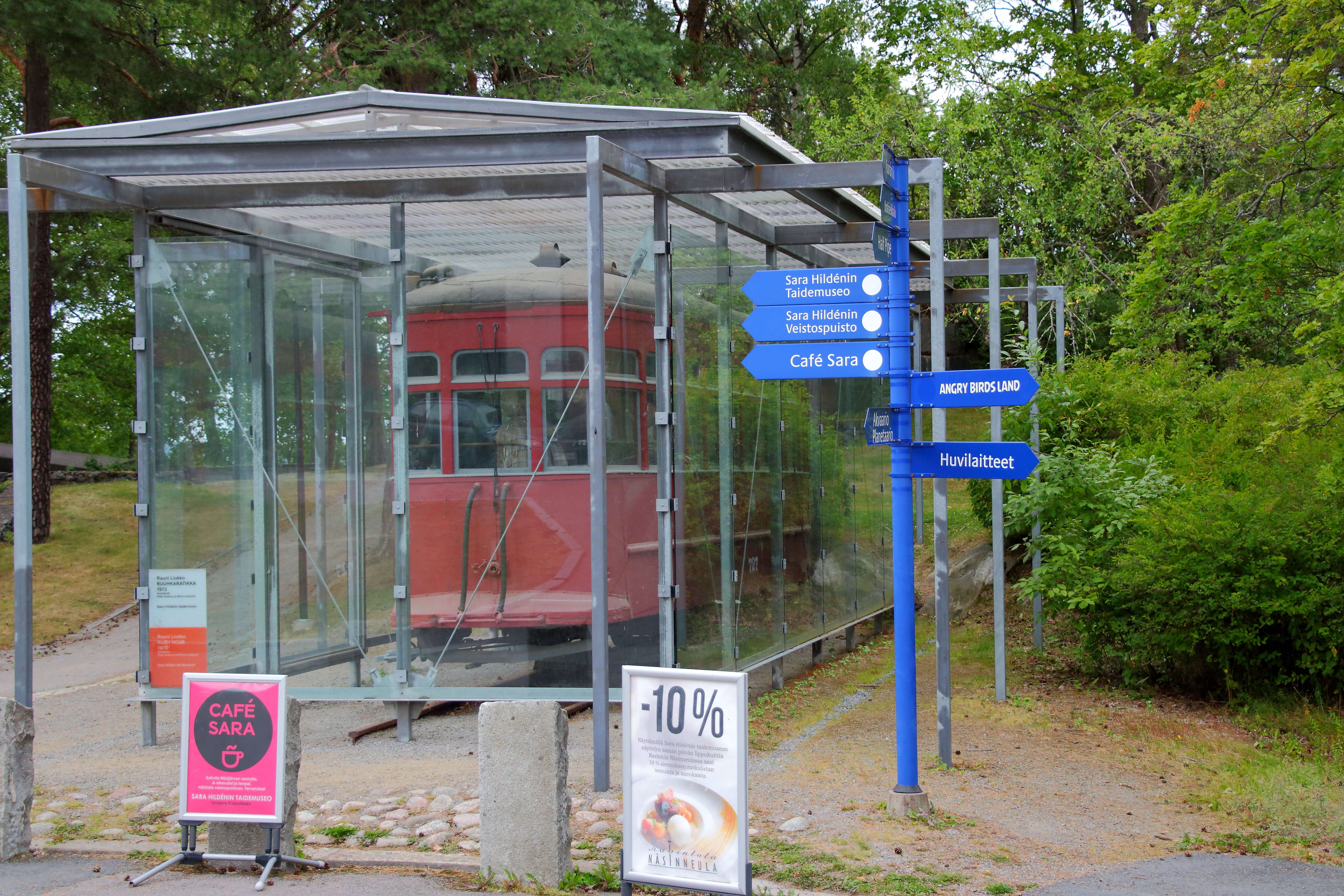 Ein Kunstprojekt von Rauni Liukko. Eine Straßenbahn, die bis 1971 in Helsinki unterwegs war und dort 1973 als Umweltprojekt ausgestellt wurde. Heute findet es sich hier in Tampere, wo, wie vorhin schon gezeigt, auch bald eine Tram unterwegs sein wird.