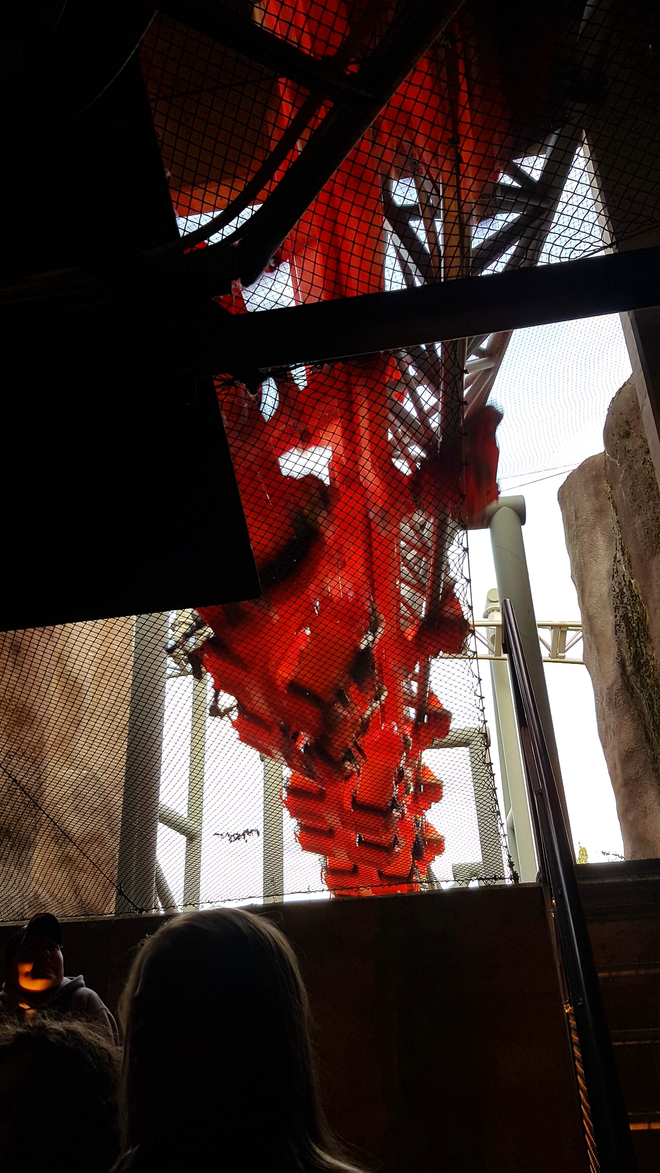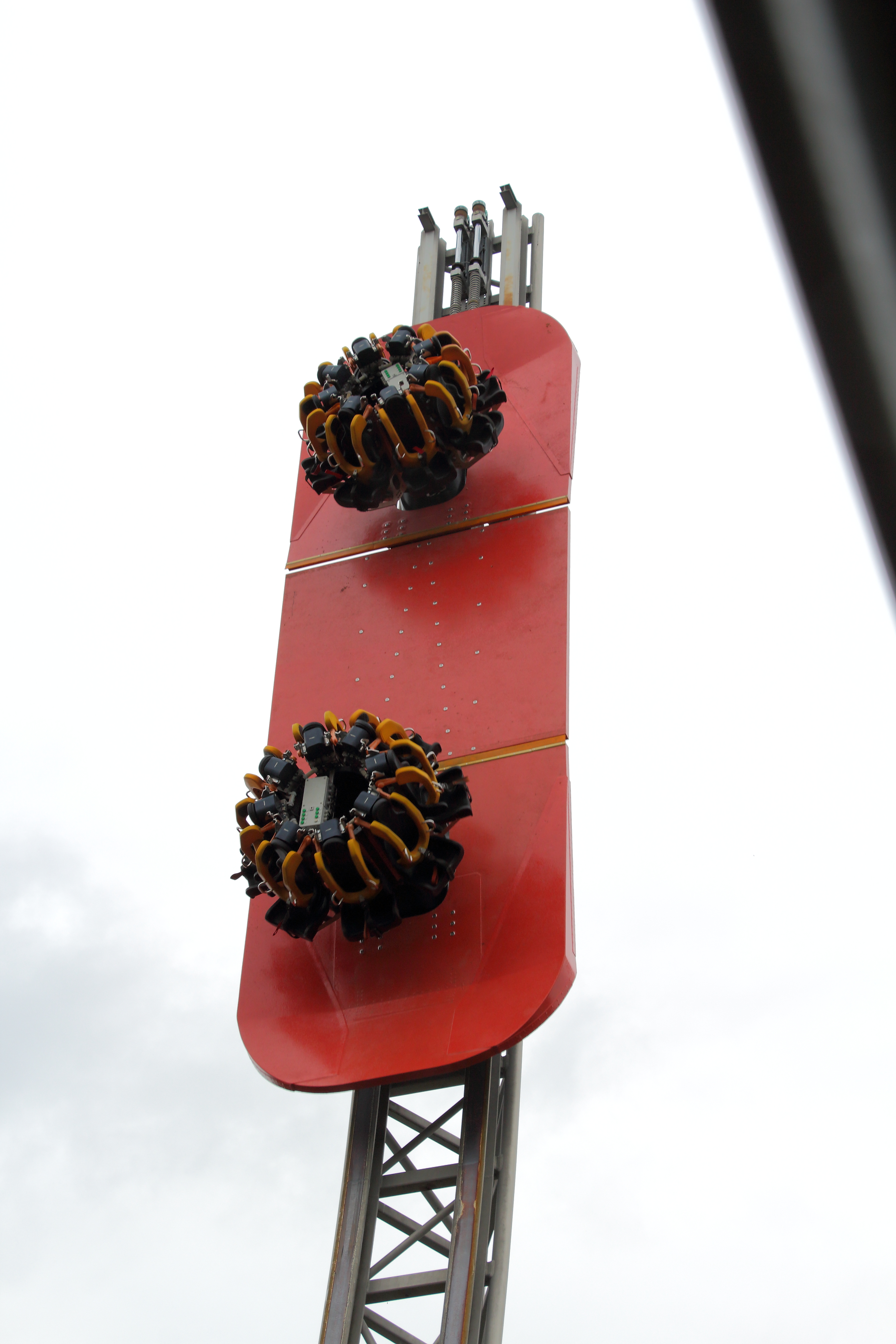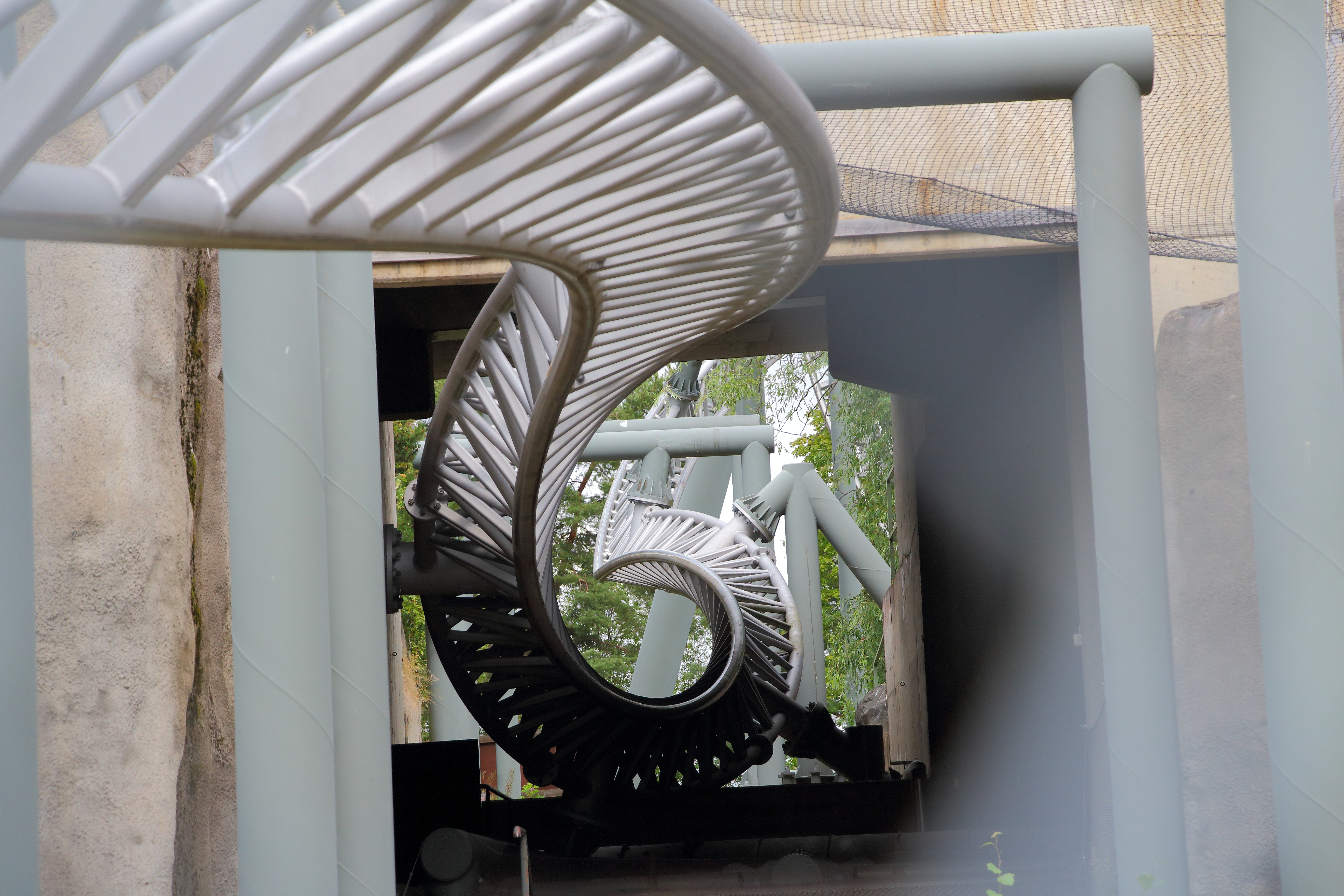 Wir haben unser Gewicht dann aber wohl so verteilt, dass wir uns nicht sonderlich gedreht haben. Gut für mich war die Drehung aber genau ausreichend, da ich so immer mit Blick nach oben die Abfahrt herunterfahren konnte. Ich hatte es schon in anderen Berichten angesprochen: Auf dem Rücken liegend so herunterzufallen ist sehr spaßig, v.a. wenn ich die Beine und Arme durch die freie Position weit von mir wegstrecken kann und der Körper langsam vom Bügel zurück in die Horizontale gezogen wird. Wäre ich gerne später nochmal gefahren, jedoch war mir der Weg dorthin zu weit, der Weg von Aus- zu Eingang noch viel weiter und bei der Kapazität wollte ich auch nicht wissen, wie hoch die Wartezeit ist.