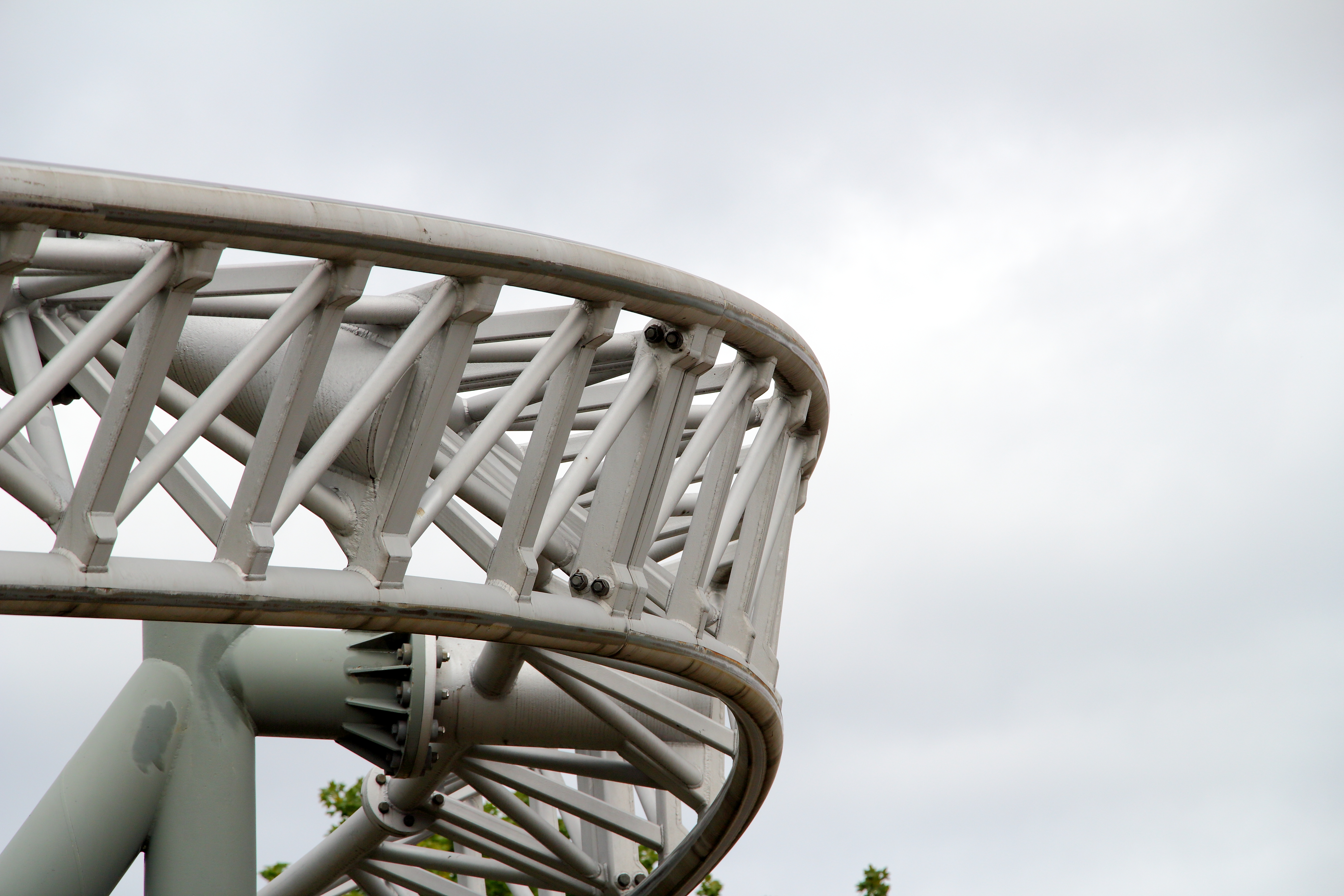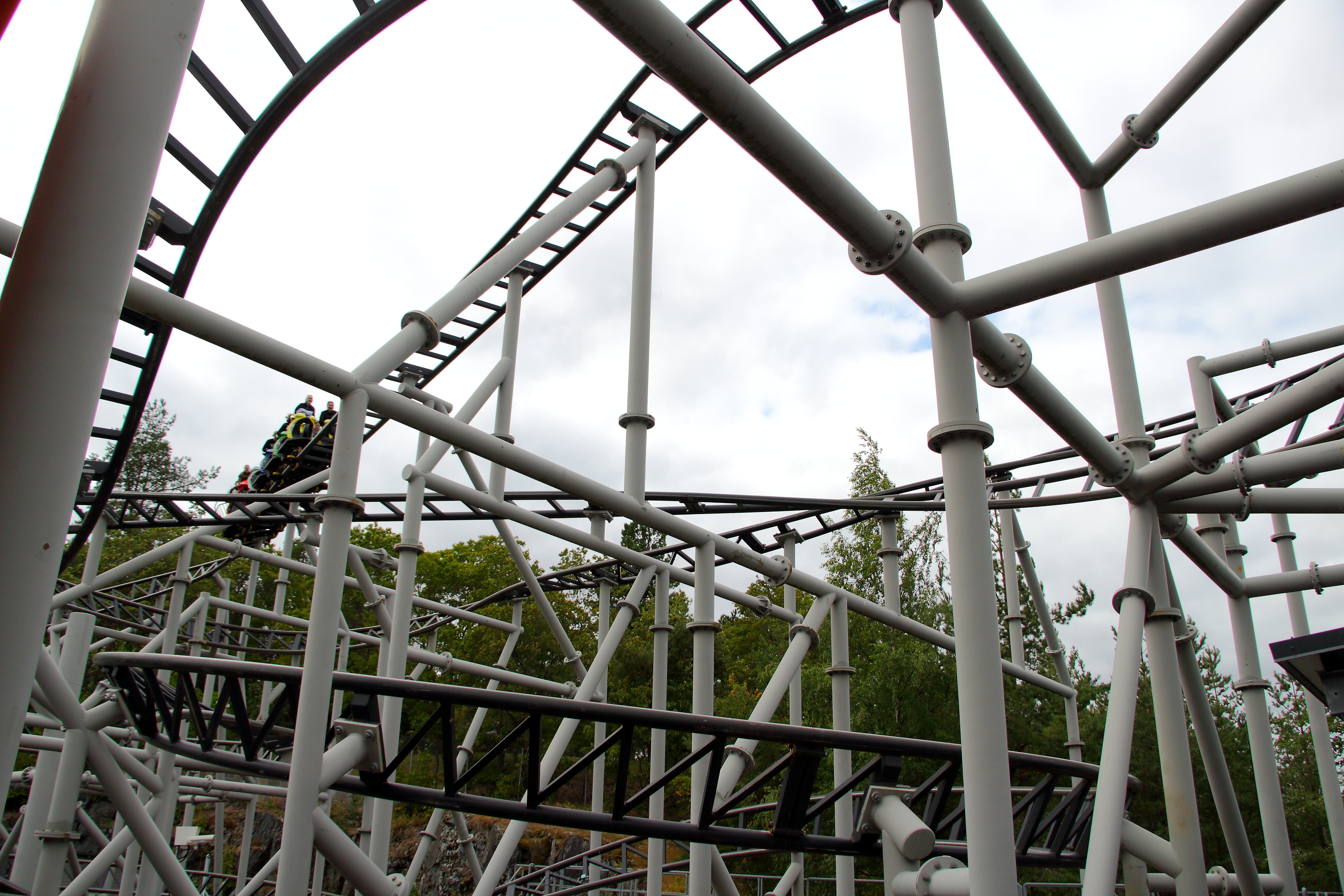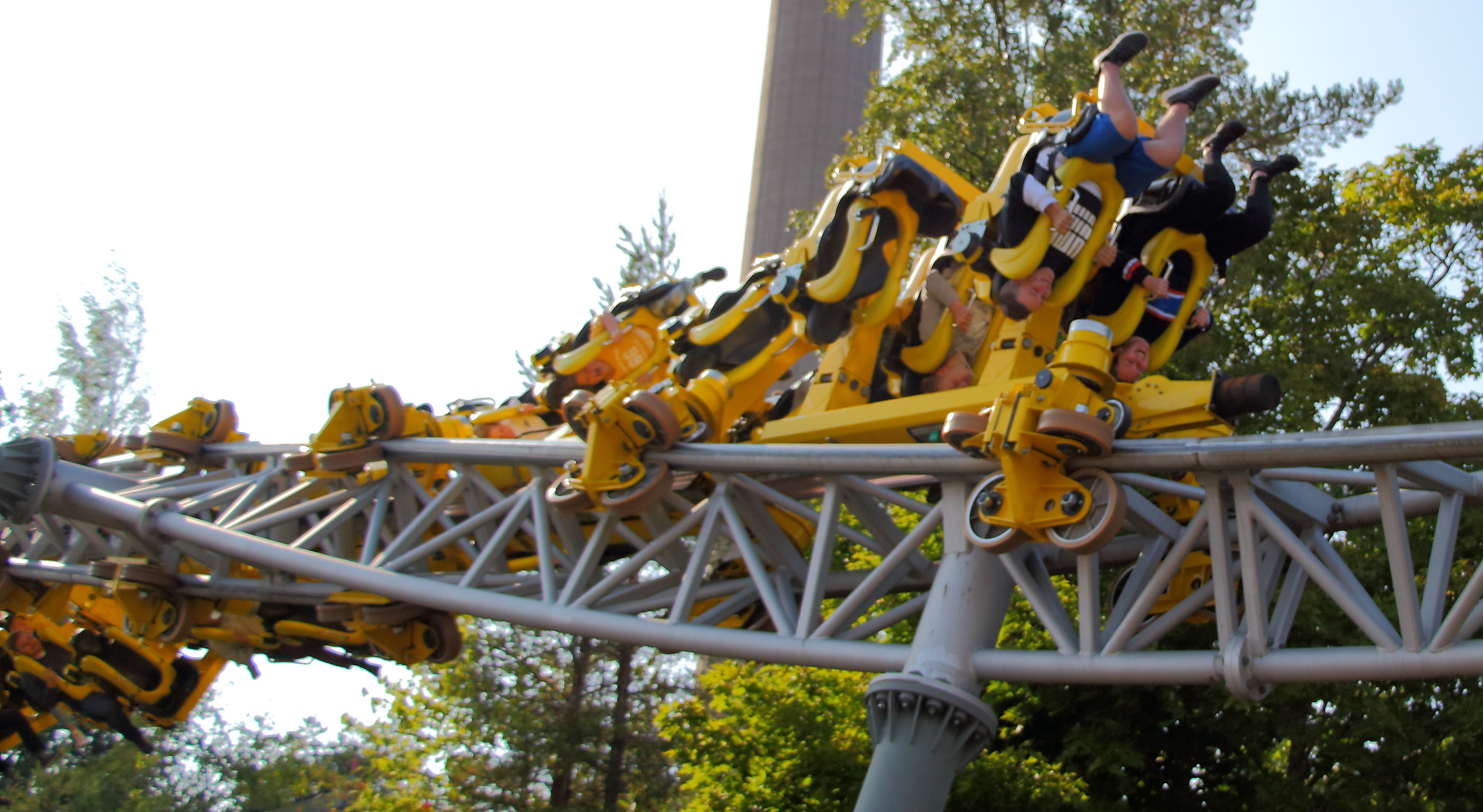 Wir haben unser Gewicht dann aber wohl so verteilt, dass wir uns nicht sonderlich gedreht haben. Gut für mich war die Drehung aber genau ausreichend, da ich so immer mit Blick nach oben die Abfahrt herunterfahren konnte. Ich hatte es schon in anderen Berichten angesprochen: Auf dem Rücken liegend so herunterzufallen ist sehr spaßig, v.a. wenn ich die Beine und Arme durch die freie Position weit von mir wegstrecken kann und der Körper langsam vom Bügel zurück in die Horizontale gezogen wird. Wäre ich gerne später nochmal gefahren, jedoch war mir der Weg dorthin zu weit, der Weg von Aus- zu Eingang noch viel weiter und bei der Kapazität wollte ich auch nicht wissen, wie hoch die Wartezeit ist.