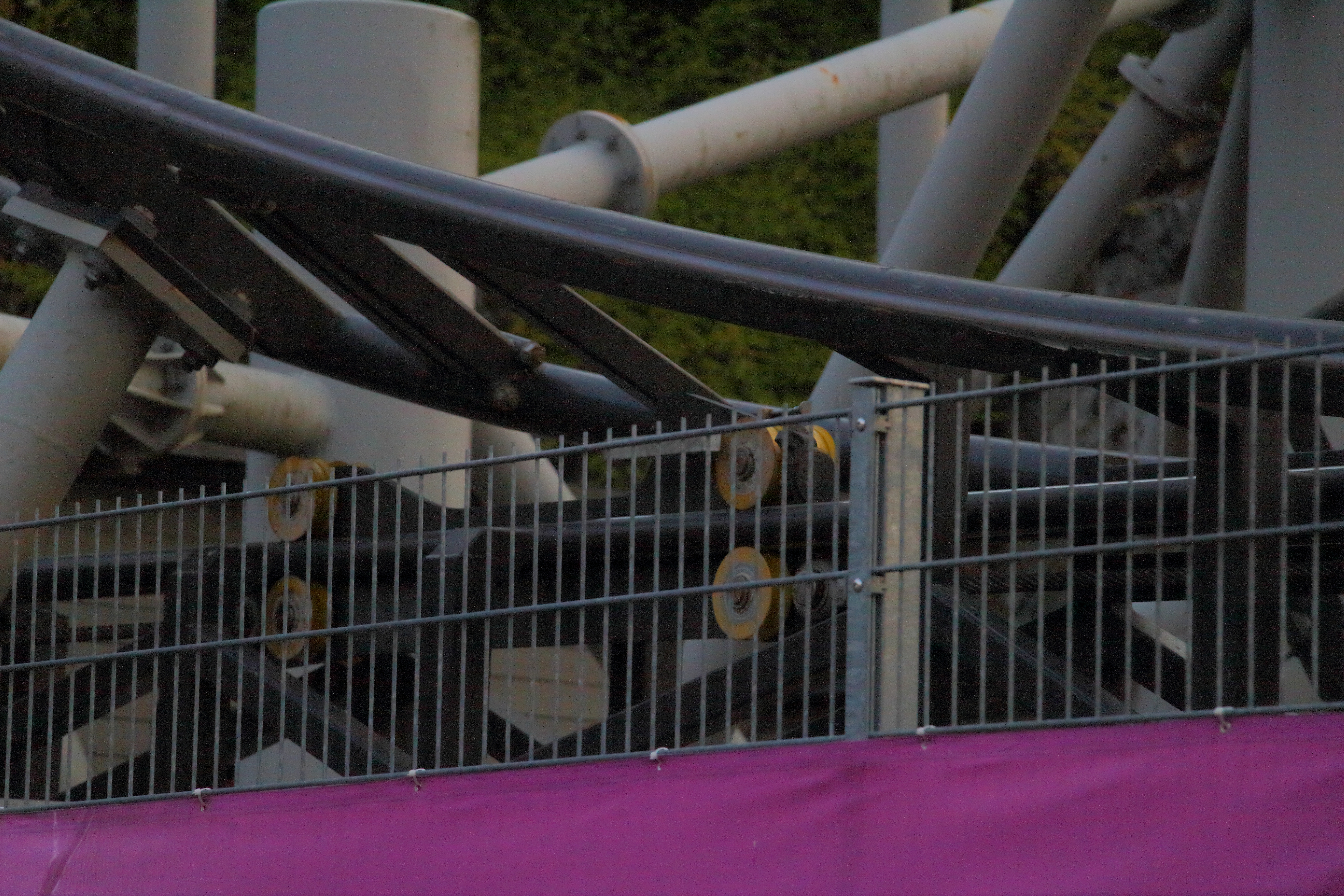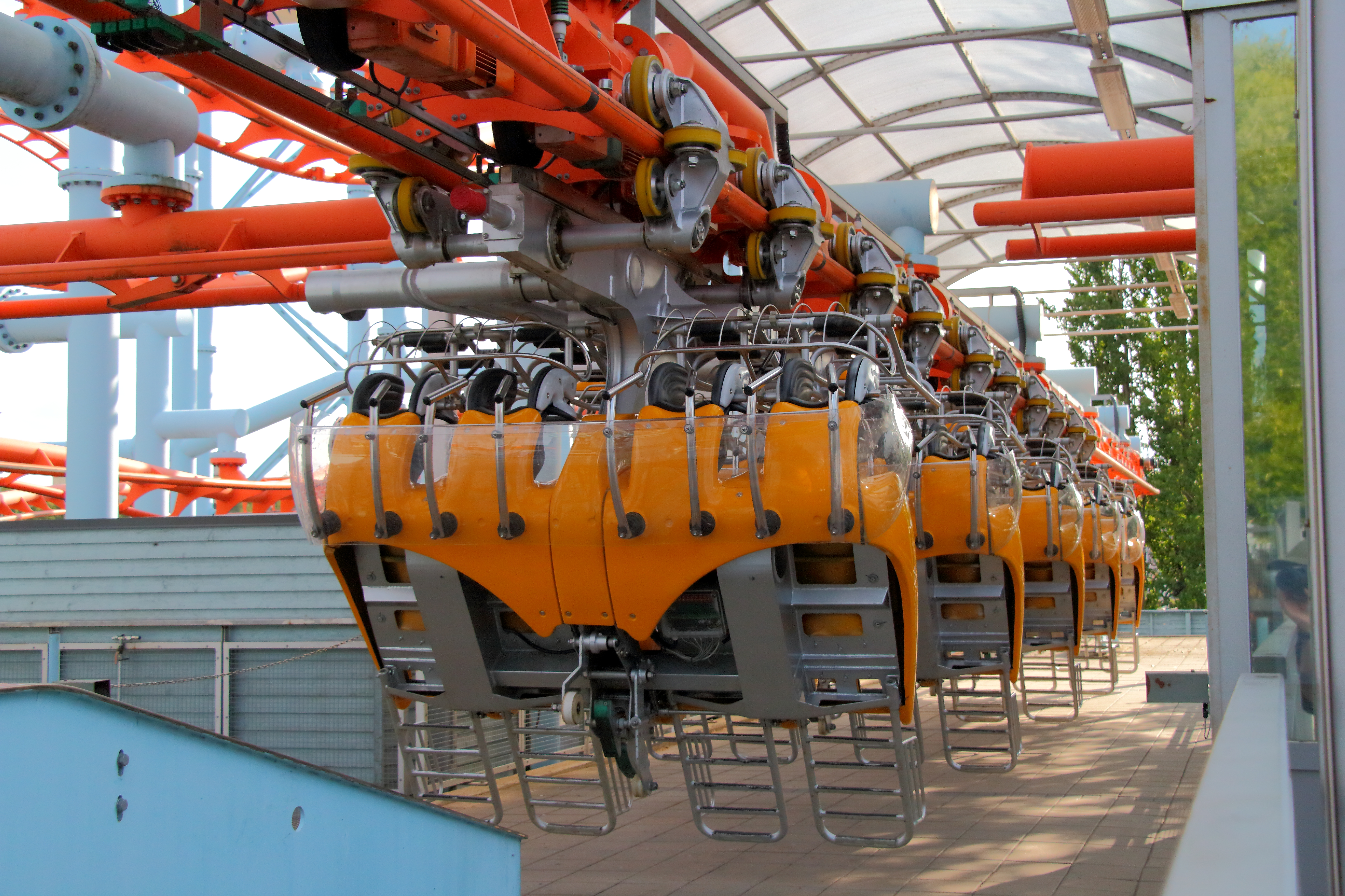 Auf der einen Seite ist die Sitzposition etwas aufrechter, wodurch der Druck auf den Brustkorb niedriger ist. Auf der anderen Seite liegen hier das Knie und der obere Teil des Schienbeins auf einem harten Polster auf. Zusätzlich kommt von hinten ein kleines Plastikstück in die Kniekehle, die verhindert, dass ich das Bein etwas nach hinten ziehen könnte, weswegen mir nach den zwei Fahrten doch etwas meine sowieso schon lädierten Knie schmerzten. Das finde ich beim Motorbike-Modell besser gelöst. Interessant finde ich aber die Abdeckung, die in der Station langsam herunterfährt und den Zwischenraum zwischen den Wagen abdeckt.