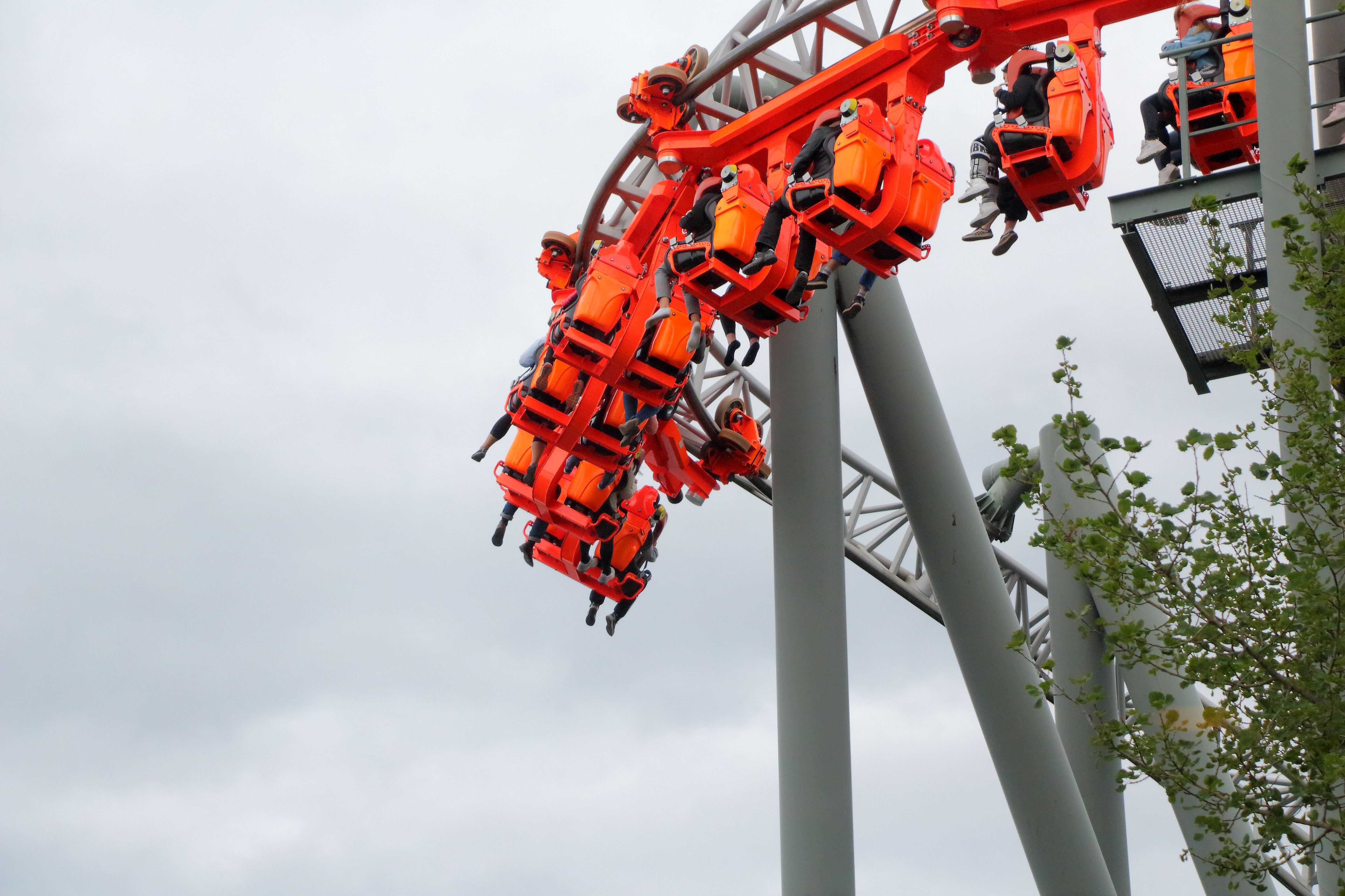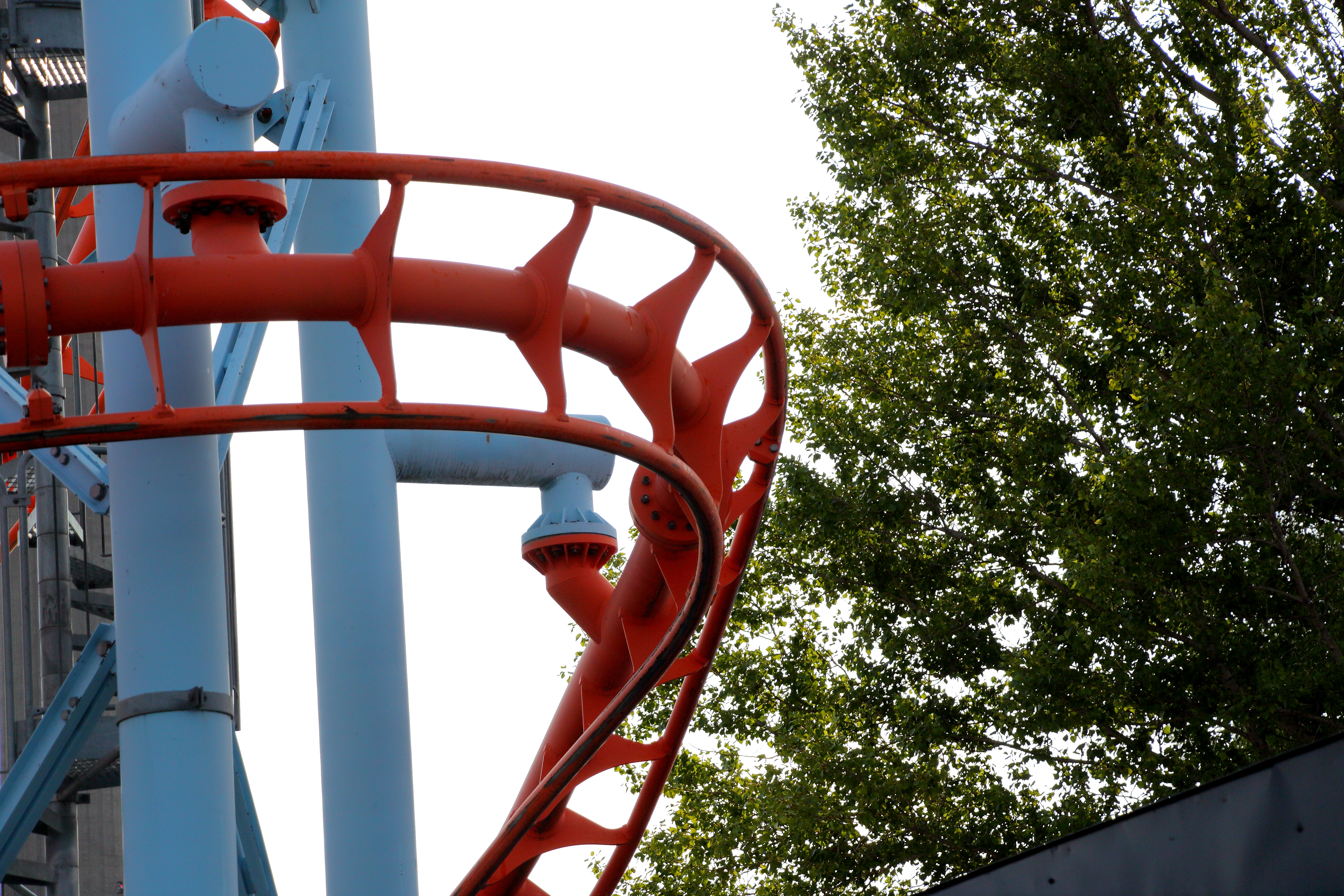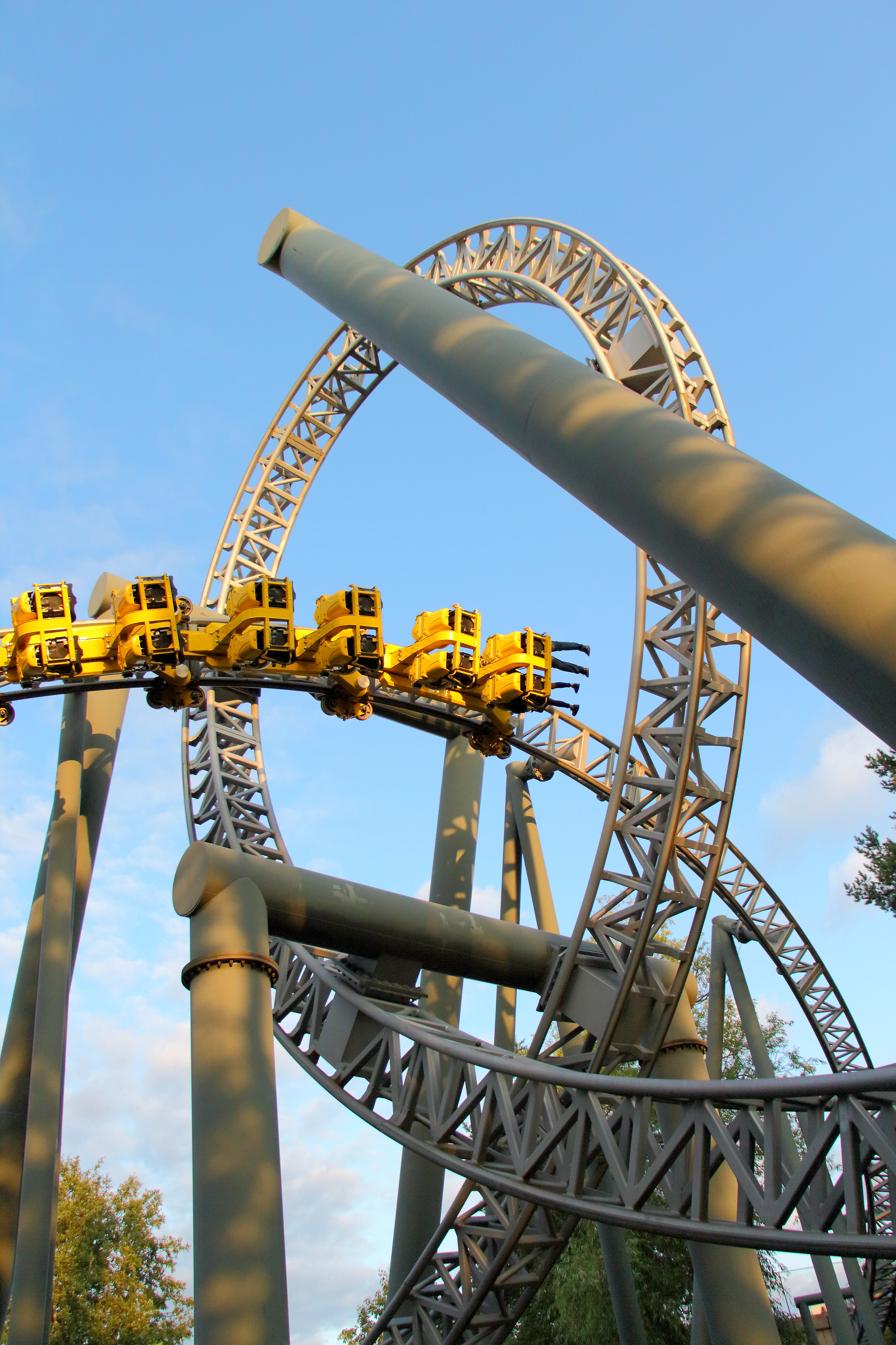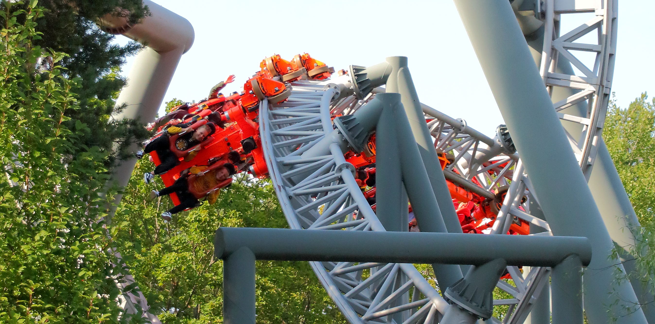 Leider zeigt sich hier aber auch eine Eigenschaft des so viel schöneren orangenen Zugs: Er rappelt. In der Cobra Rolle gibt es genau in der Mitte einen kleinen Ruckler von links nach rechts, der nach der überaus smoothen Erstfahrt doch etwas überraschend kam. Nichts Schlimmes, aber ohne jegliche Körperspannung ob des Schwebens in einer hinteren Reihe überraschend.