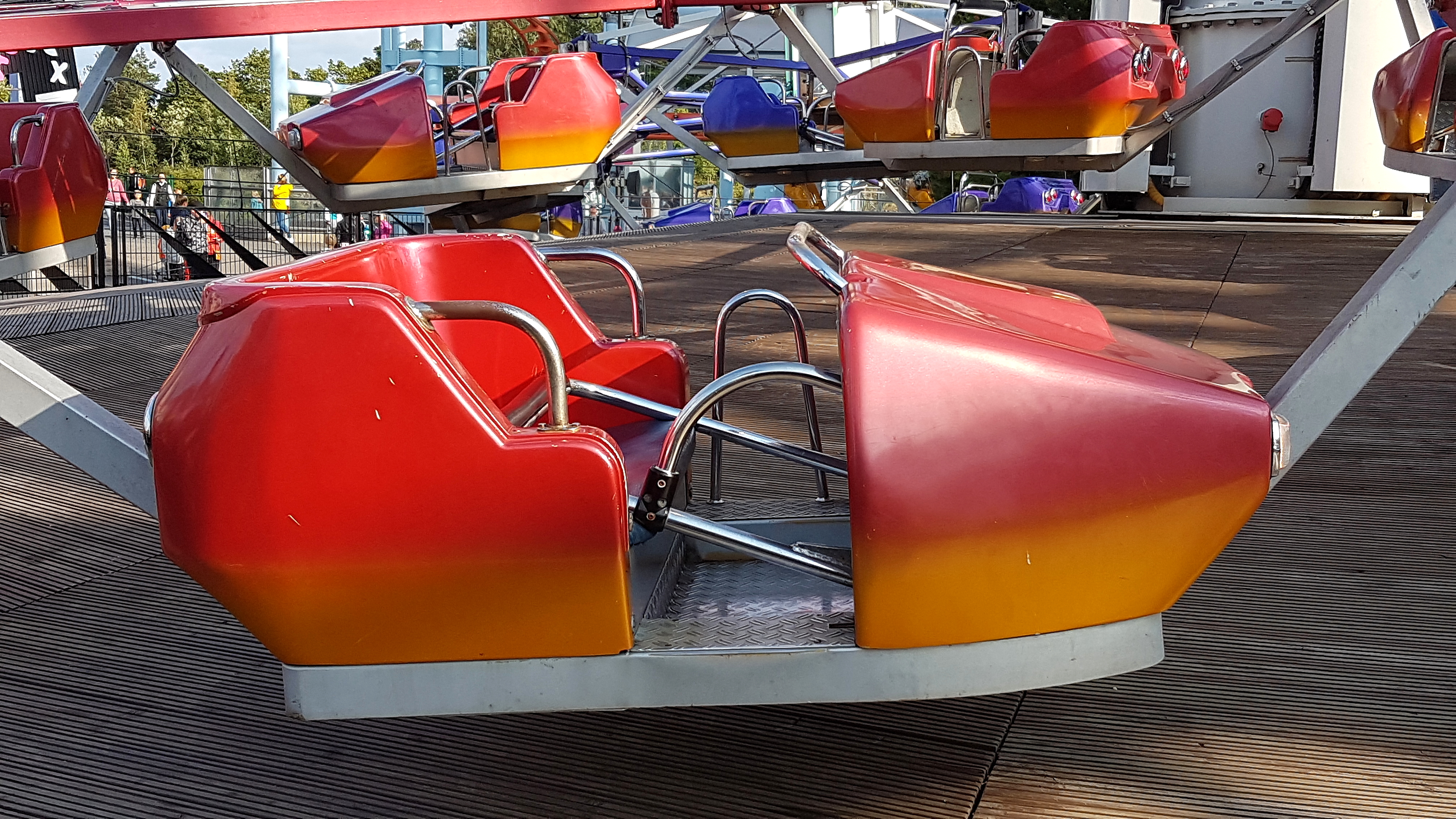 Fahrtechnisch war für mich leider nur der erste Schuss nach oben wie sonst von den Zamperla-Türmen bekannt. Dieses neue Modell, bei dem sich der Turm drehen kann, zimmert einen leider nur dort in den wuchtigen Bügel, der mit etwas Gegendruck ein wenig Platz zum Schweben lässt. Bei der ersten Abfahrt noch ordentlich Druck am Umkehrpunkt. Das war's dann aber leider auch schon. Während sich im Dennly's Parc dieses Spiel noch 2x wiederholt, folgen hier nur noch entspannte Auf-und Abfahrten.