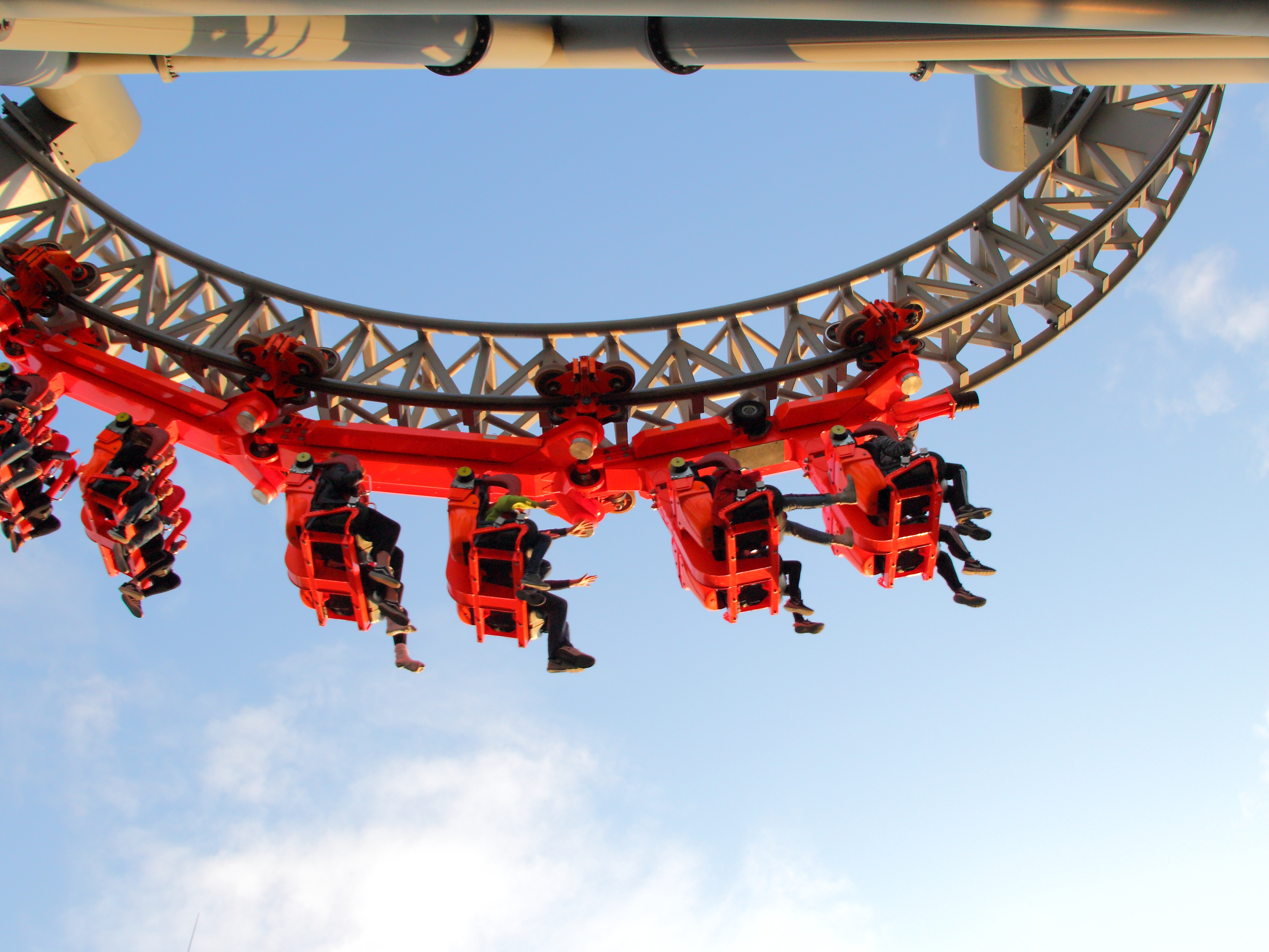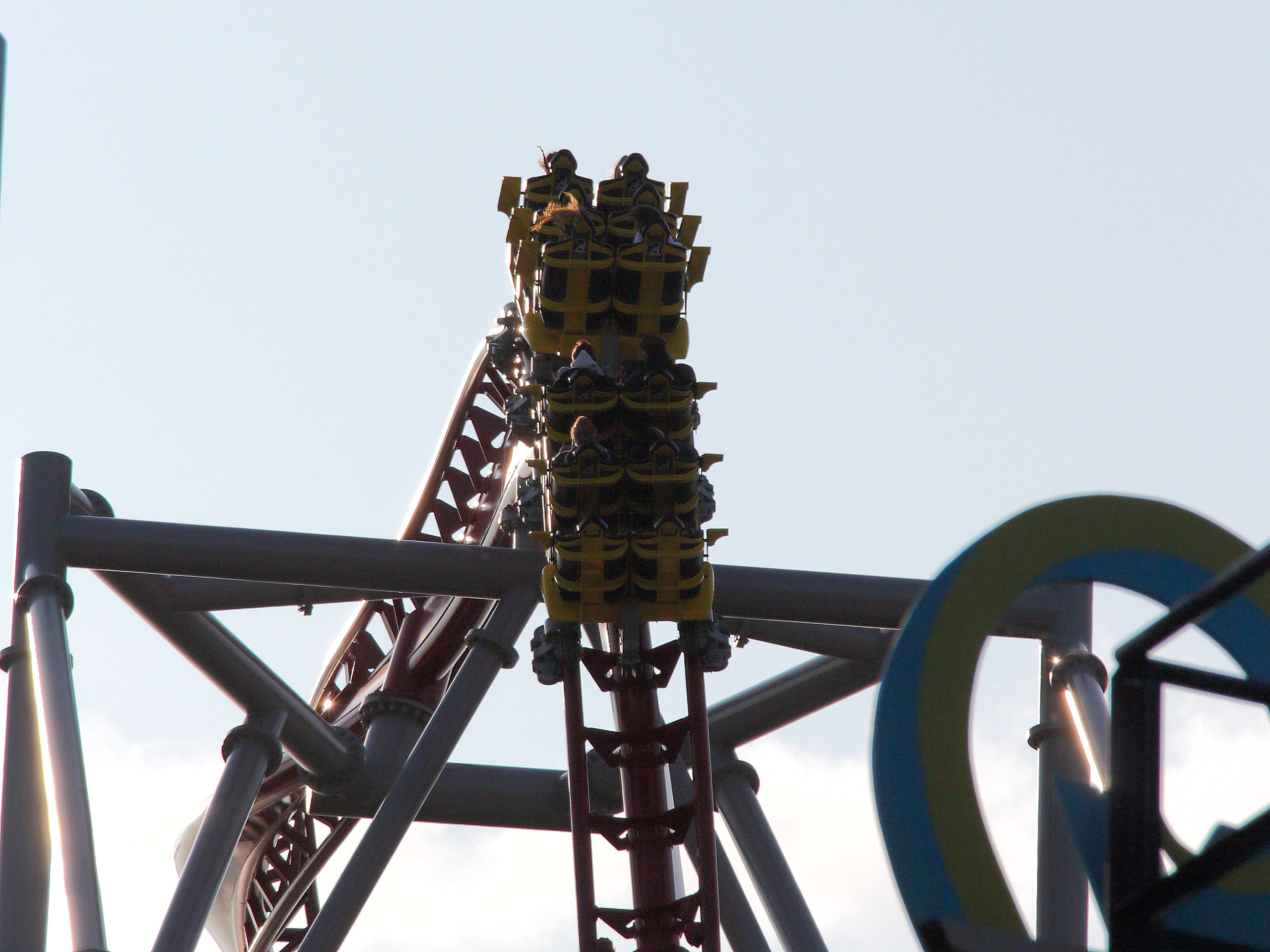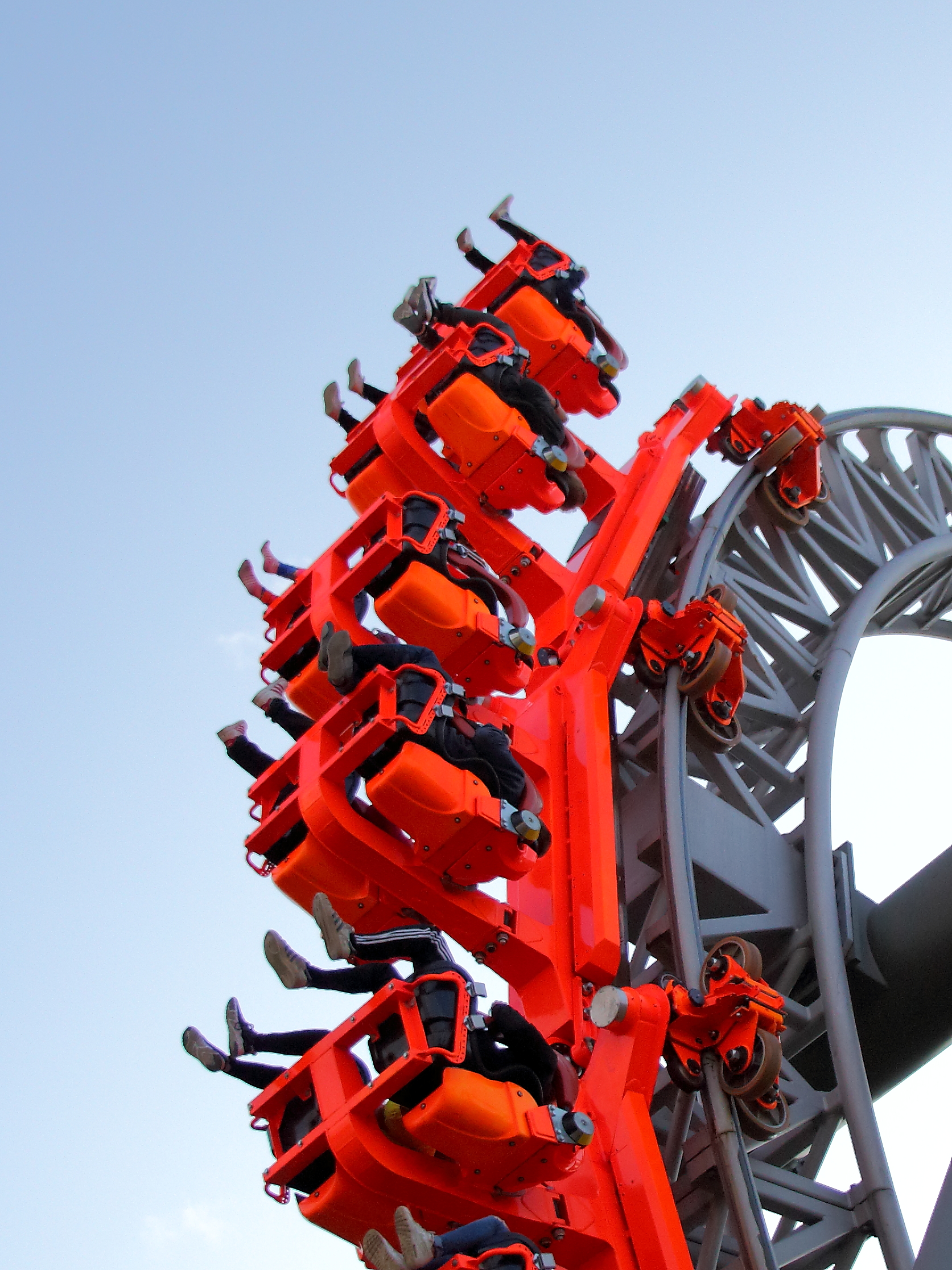 Hinten hingegen findet dies erst kurz vor dem Scheitel statt. Dadurch verliert der Hintern minimal Sitzkontakt bevor der Zug wieder Fahrt aufnimmt und aufgrund der noch folgenden halben Drehung einen zurück in den Sitz holt.