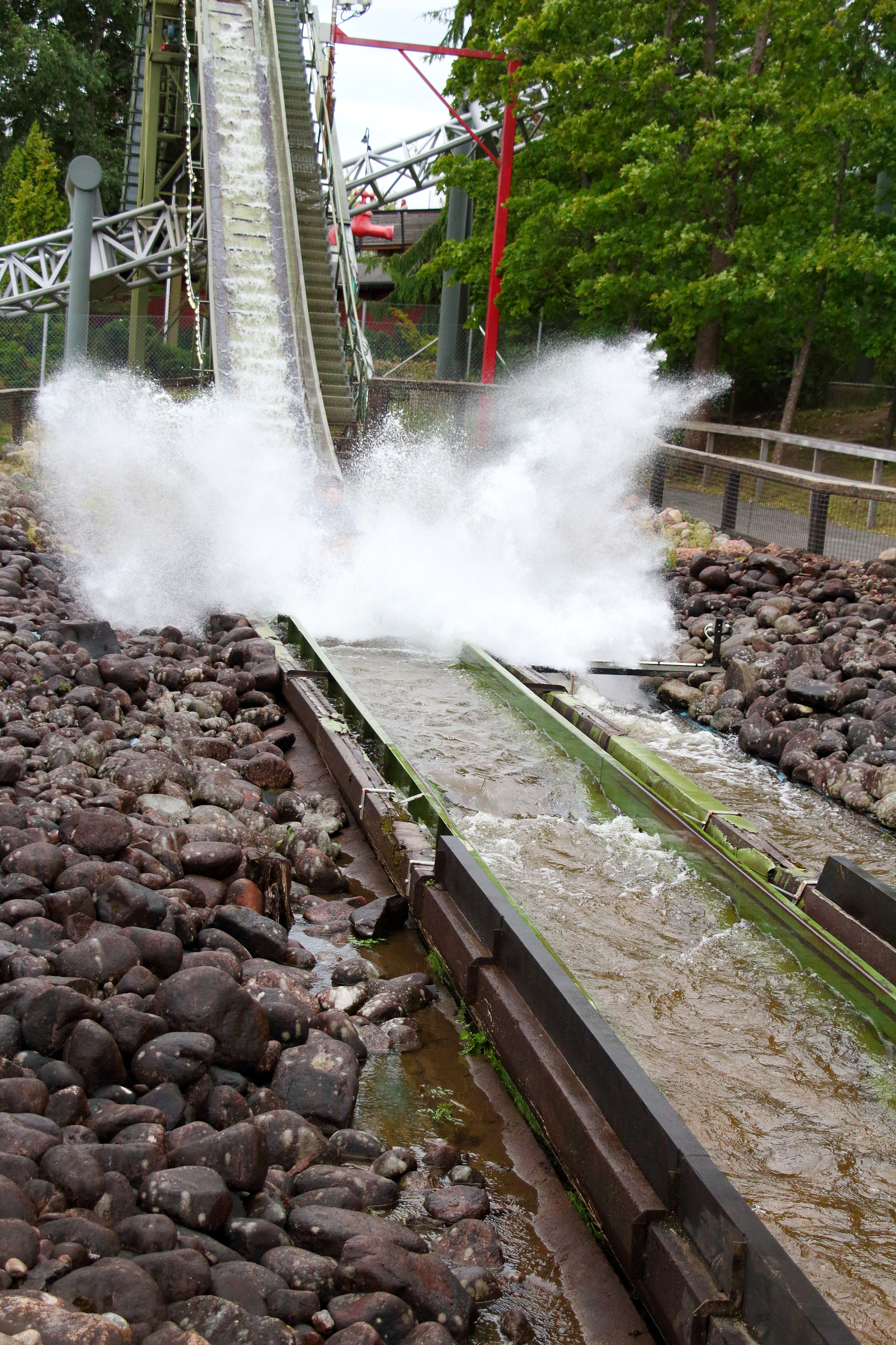 ... den in den mittleren Reihen durch die Rückrollsperre sehr lauten Lifthill hinauf. Genau zwischen einer Schleife der Wildwasserbahn hindurch gequetscht.
