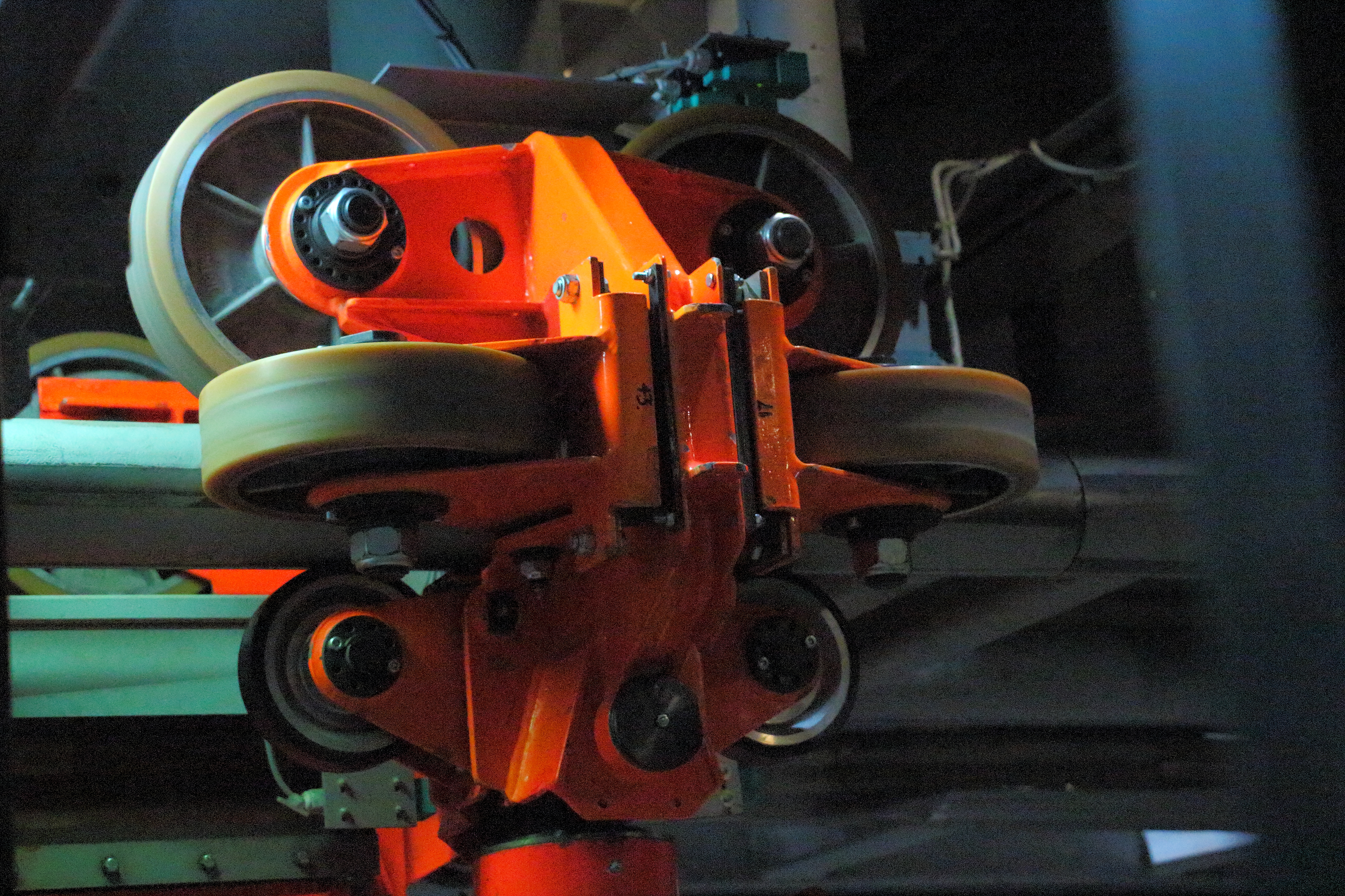 Und noch überraschter war ich, dass die Beschleunigung auch bis in den Übergang in die Kurve hinein anhält. Denn hier ist zu sehen, dass das Catch-car unter der Schiene hindurch fährt und nicht mitten auf der Beschleunigungsstrecke anhält.