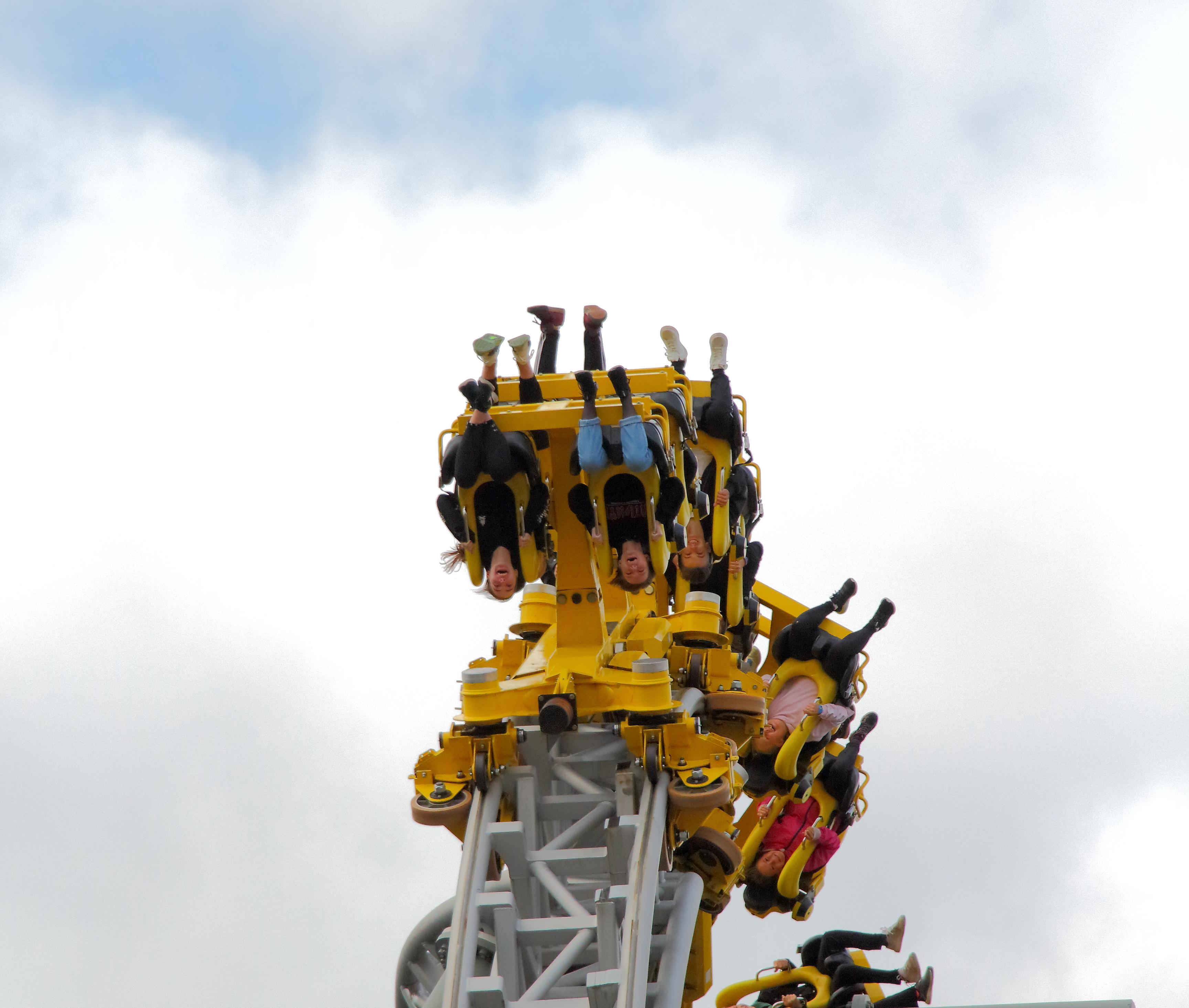 Die Haare fliegen hoch. Auf meiner Sky Scream gibt es in der 4. Reihe durch die Drehung und dem Weg zur Horizontalen ein Katapulteffekt in den Bügel, mit dem aufgrund dem Abknicken gefühlt ewig Kontakt gehalten wird. Im Gegensatz zu vorne nicht zu stark und nicht zu schwach wie hinten.