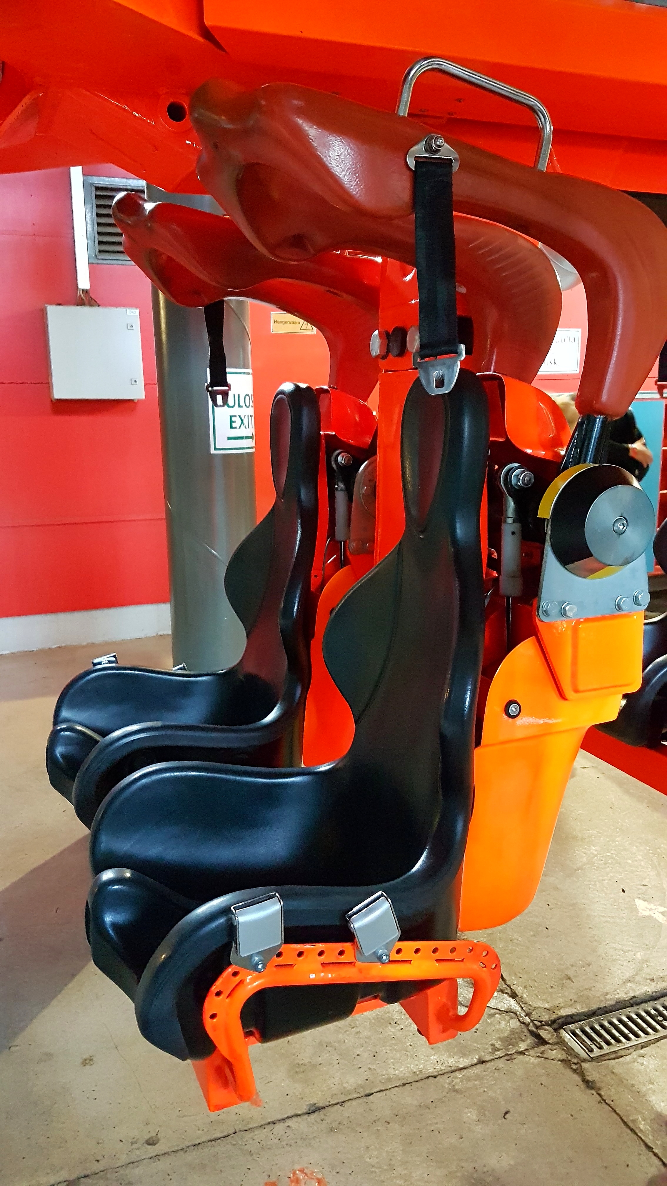 Im Vergleich zur heimischen Sky Scream sind die Beineinzwänger etwas steiler eingestellt, wodurch sie beim normalen Sitzen glücklicherweise nicht mit den Schienbeinen in Kontakt kommen. Falls ich also mal wieder Lust auf 233 Runden an einem Tag habe (der letzte Öffnungstag 2015), hier wär es eindeutig angenehmer. Dafür waren gefühlt die Beckenbügel etwas anders geformt, was ein komisches Gefühl beim Sky Scream Dauerfahrer hinterließ. Mit einem Rasten Freiheit zum Bügel (bloß nicht mehr, sonst macht die Abfahrt Aua am Rücken) und auf meinem Lieblingsplatz 4R L ging es zusammen mit einem Herrn mit ECC-Brillenband los, wobei ohne den tiefen Ton aus der Box samt leisen Gedudel zwischendurch fehlt mir etwas ...