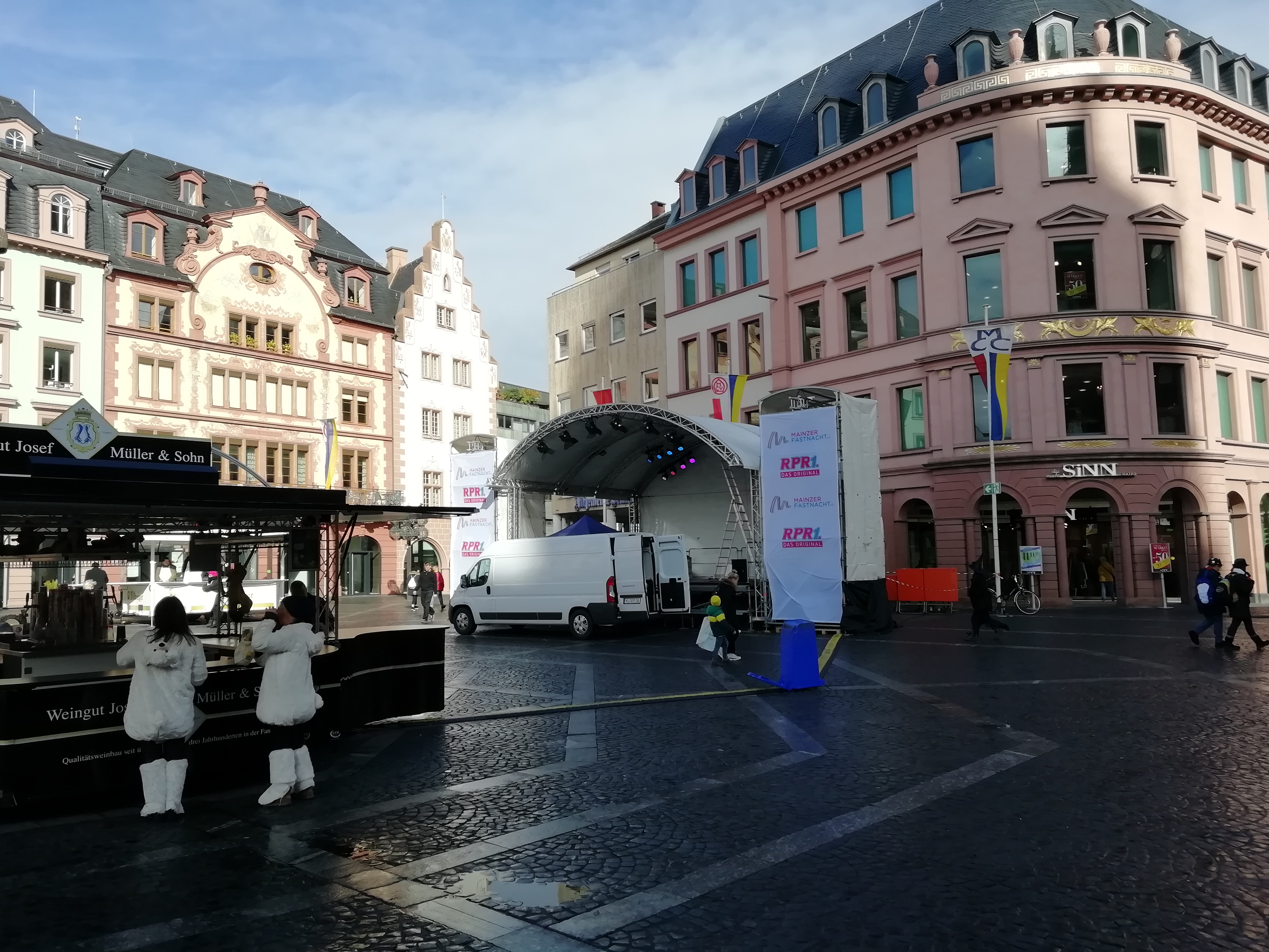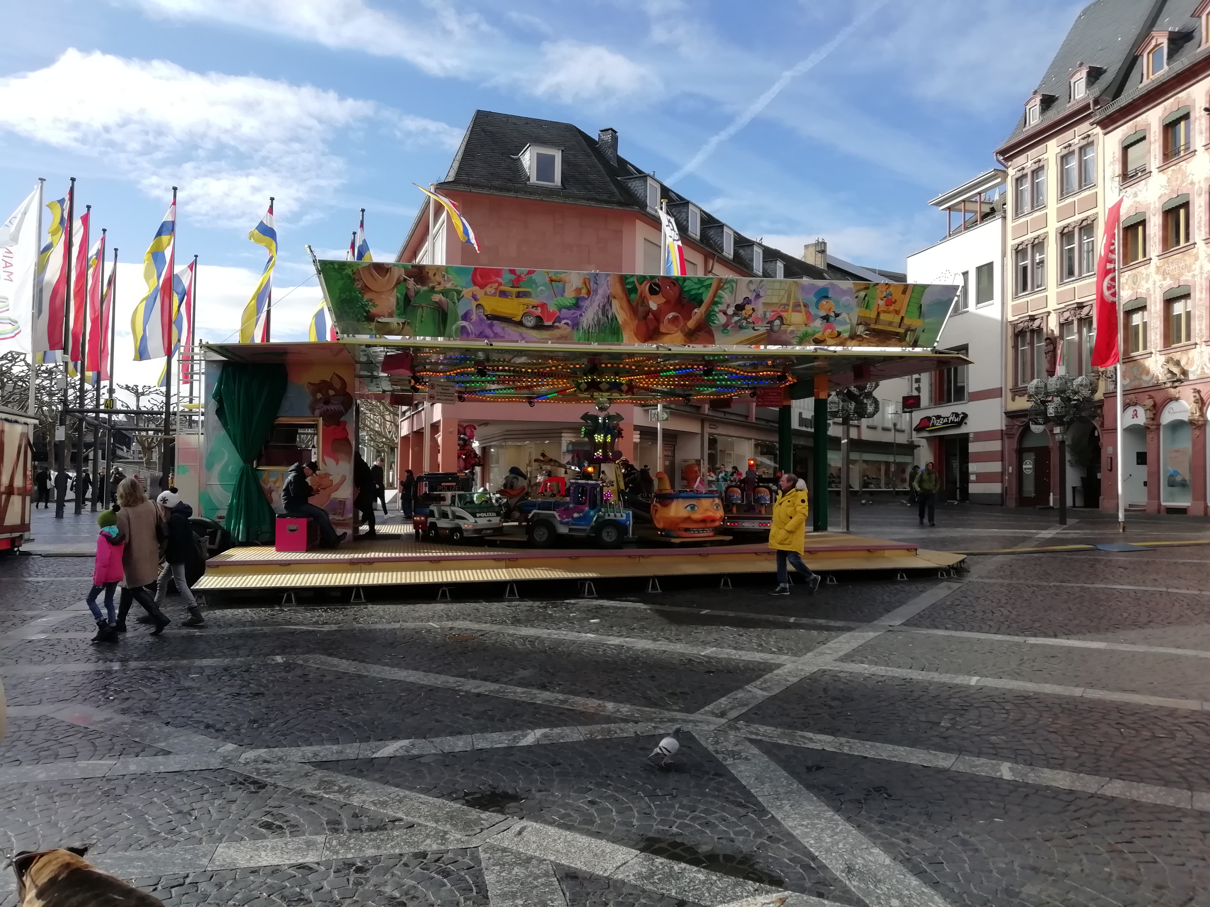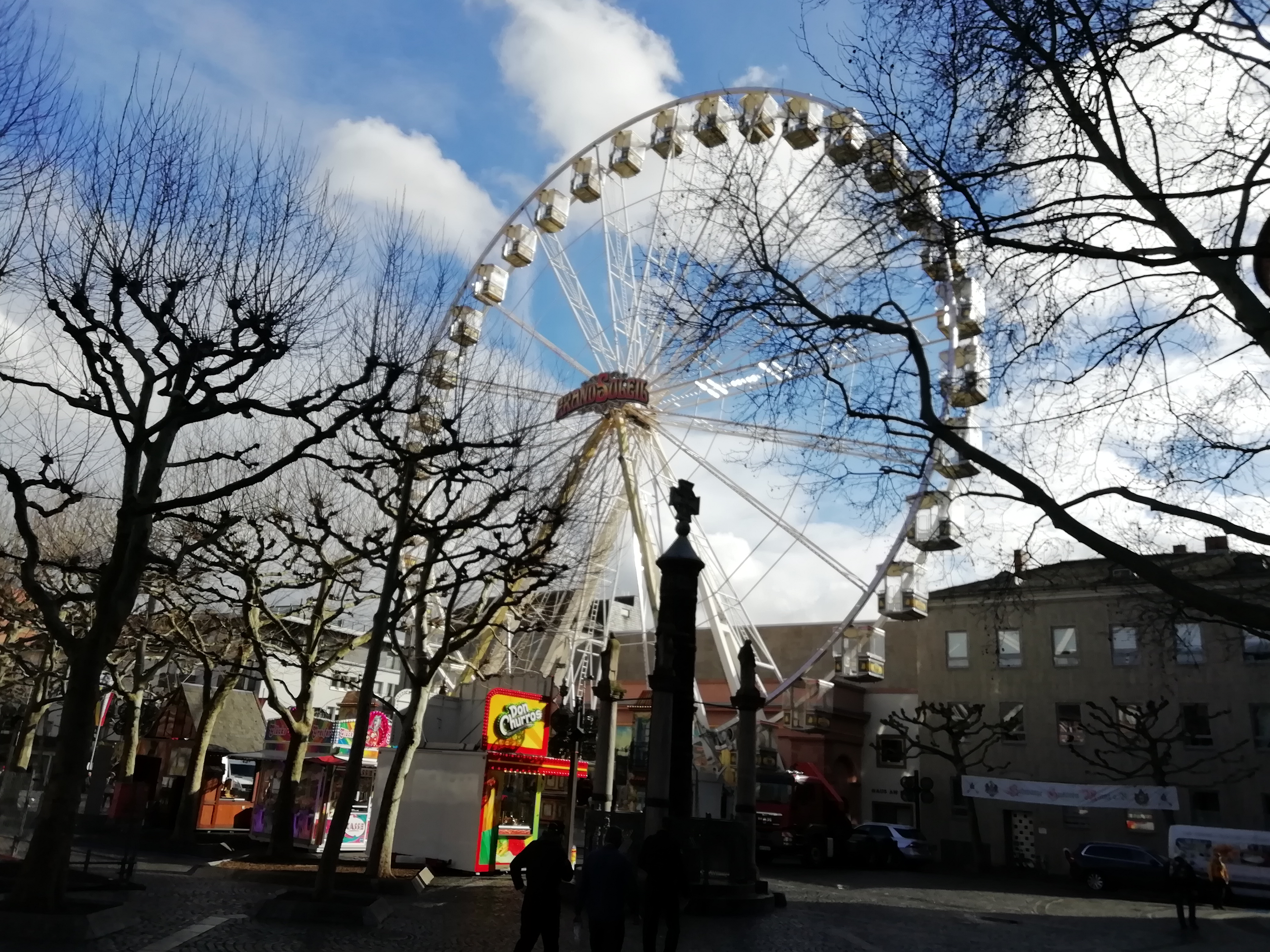 Die fastnachtsmess ist Mal wieder geschrumpft. Das Riesenrad nimmt den Platz des autoskooters ein, dafür steht auf dem Markt jetzt eine Bühne, so dass dort nur noch ein Kinderkarussell übrig geblieben ist. Außerdem ist die Tribüne am Gutenbergplatz nur noch einseitig und die Alm am kleinen Haus ist einer kleinen Partyfläche gewichen.