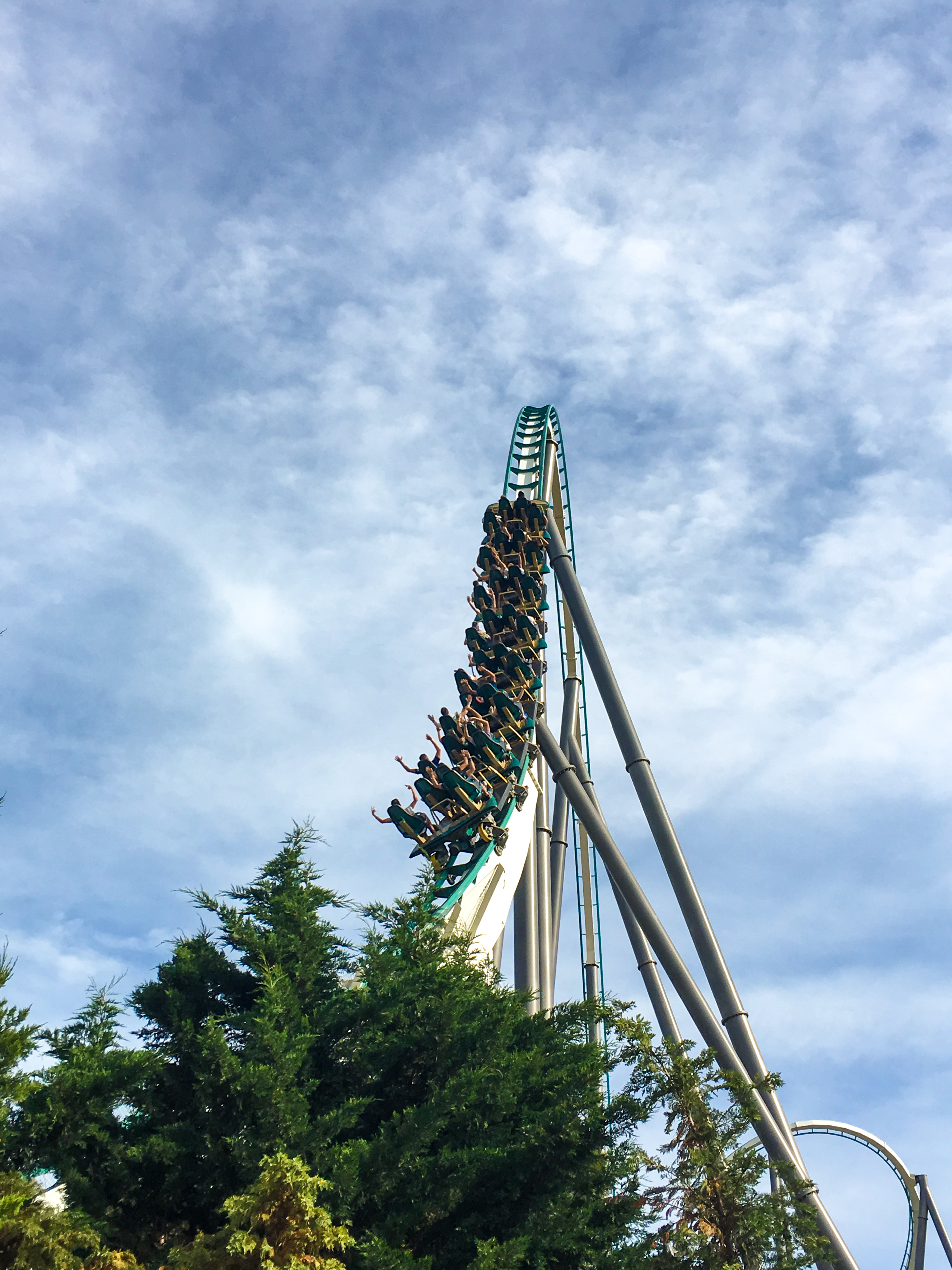 Alles, was nach dem Scheitelpunkt passiert, ist ein einziger „Oh Shit“-Moment, denn die Kiste muss ja wieder runter. Der Drop fühlt sich an, als hätten Kärnan und GeForce ein straffälliges Kind gezeugt. Ich schwebe im Sitz, schaue 100m in die Tiefe. Dabei drehen wir uns um die eigene Achse und ich lasse mich nochmal seitlich aus dem Zug reißen, sodass unter mir nichts mehr scheint, was mich hält. Der Kick ist genial, ehe wir uns wieder in die Waagrechte bewegen und stark abgebremst werden. Der Speed Bump fühlt sich an wie der letzte Sketch eines Comedians und jeder - aber auch wirklich jeder - in der Schlussbremse hat ein Grinsen auf dem Gesicht, lacht oder klatscht Beifall. Was für ein Ritt!