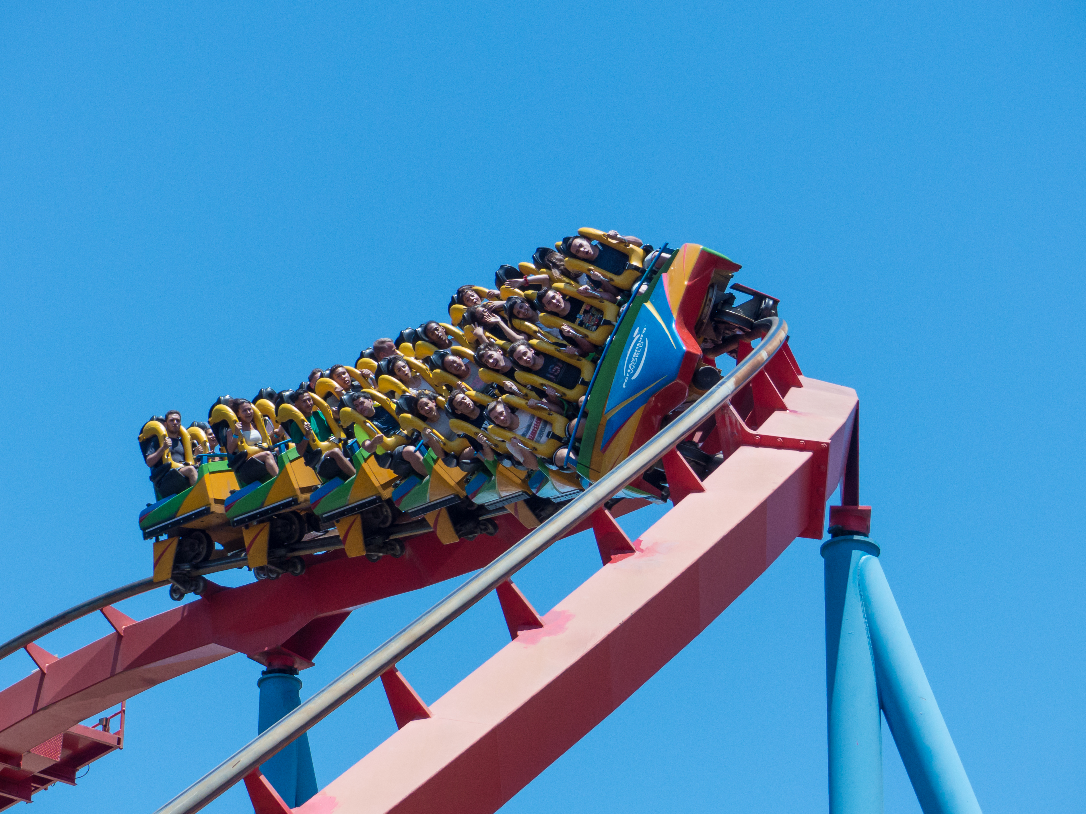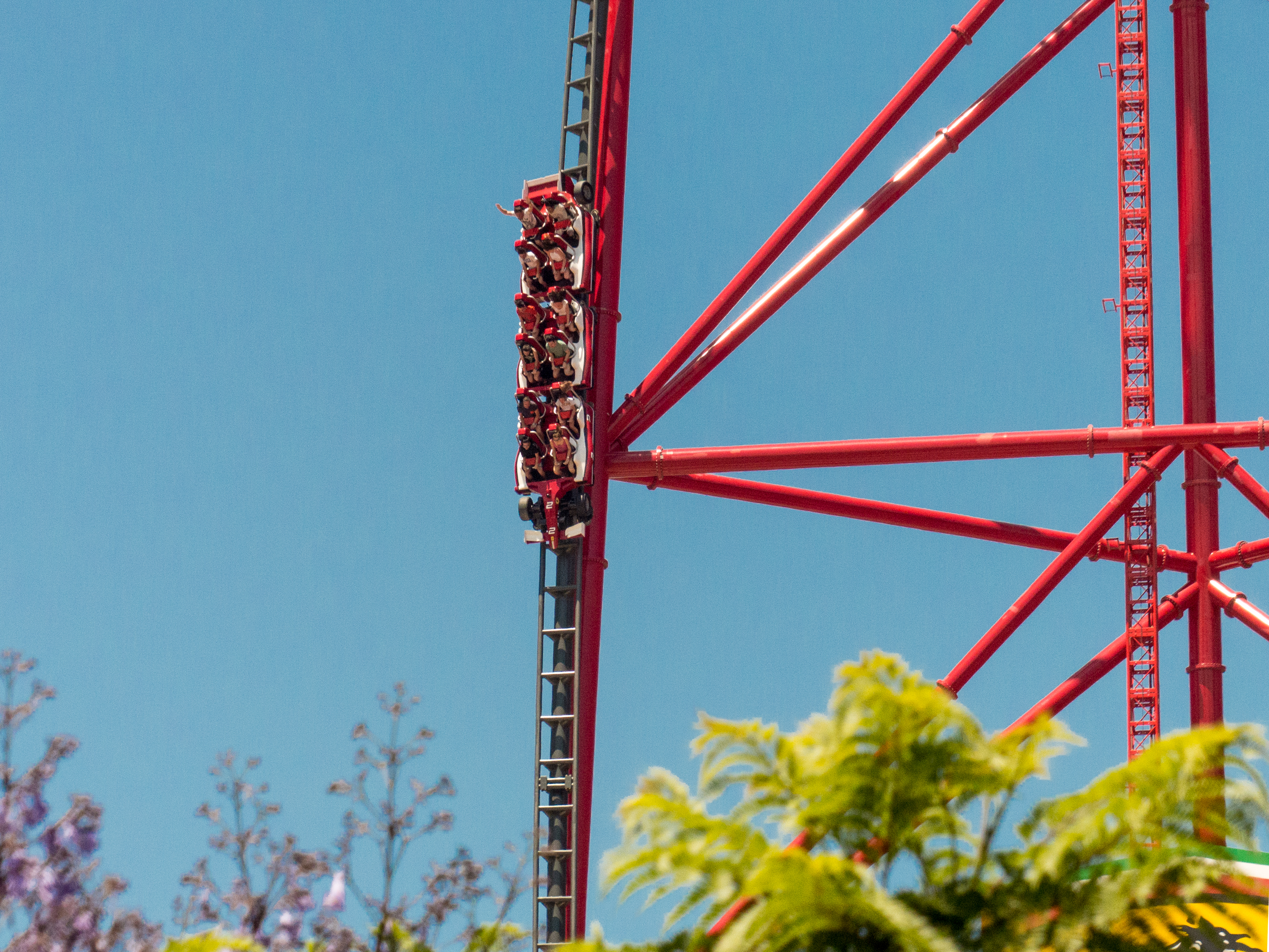 Das „One-Trick-Pony“ hat mich positiv überrascht. Der Launch ist alles andere als weichgespült, obwohl es ein LSM-Antrieb ist. Die hydraulische Variante kann zwar mehr, dennoch bietet Red Force einen kraftvollen Auftakt. Gegen Ende der Launchgeraden beginnt der Dreisitzer jedoch ordentlich auf der Schiene zu tanzen. Egal wie frei und offen die Bügel da auch sein mögen: Wenn es rappelt, dass der Kopf an die Lehne knallt, ist es zu viel. Die Unruhe hält zum Glück aber nur eine lange Sekunde an, ehe man sich den 112m hohen Turm empor windet. Und hier gibt es nichts zu meckern: Man kann seitlich aus dem Wagen raushängen und nach unten schauen, man kann einfach geradewegs in die Ferne blicken oder man kann enthusiastisch die Arme nach oben werfen und (bei einigen Fahrten) richtig satte Airtime genießen.