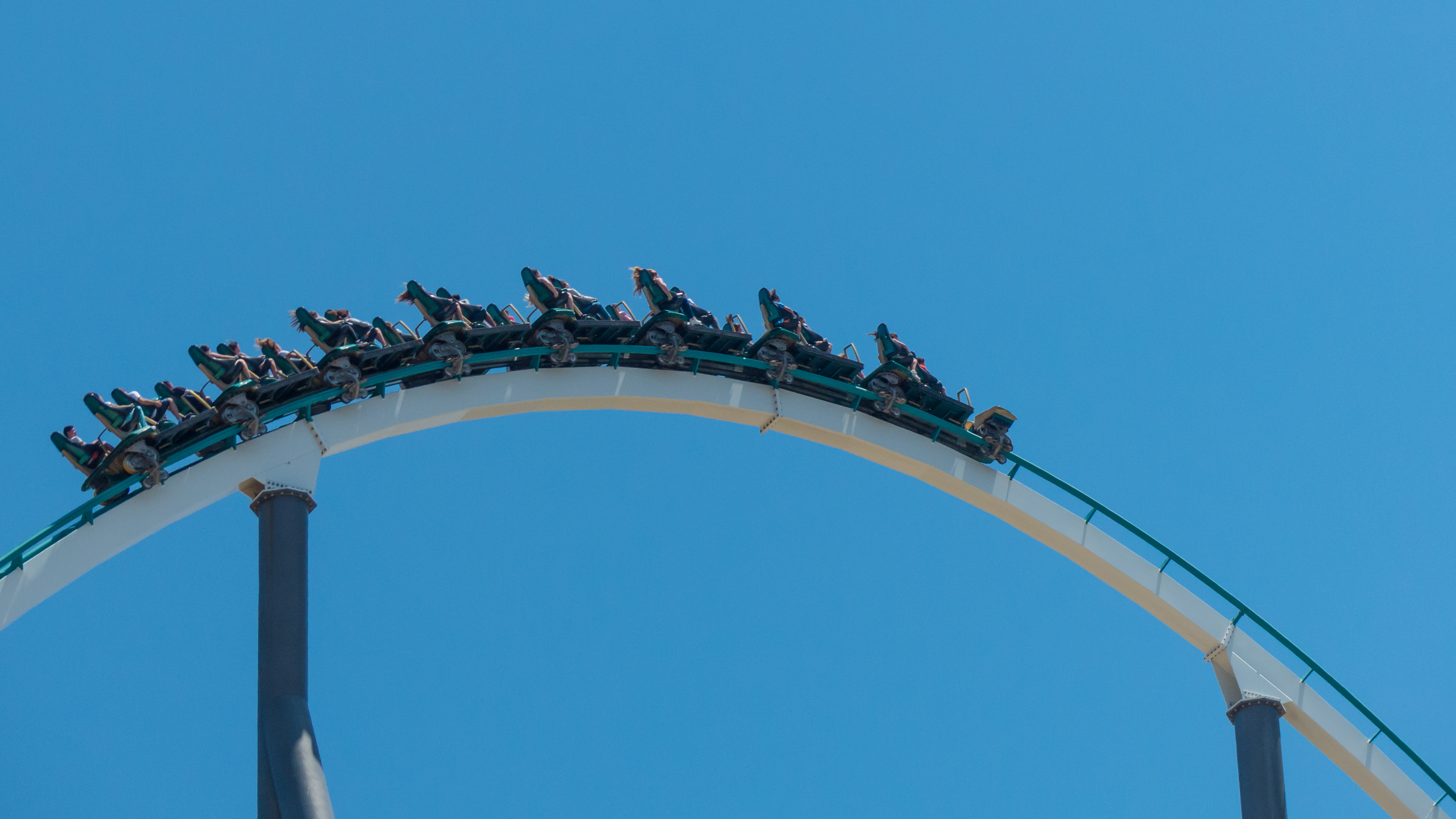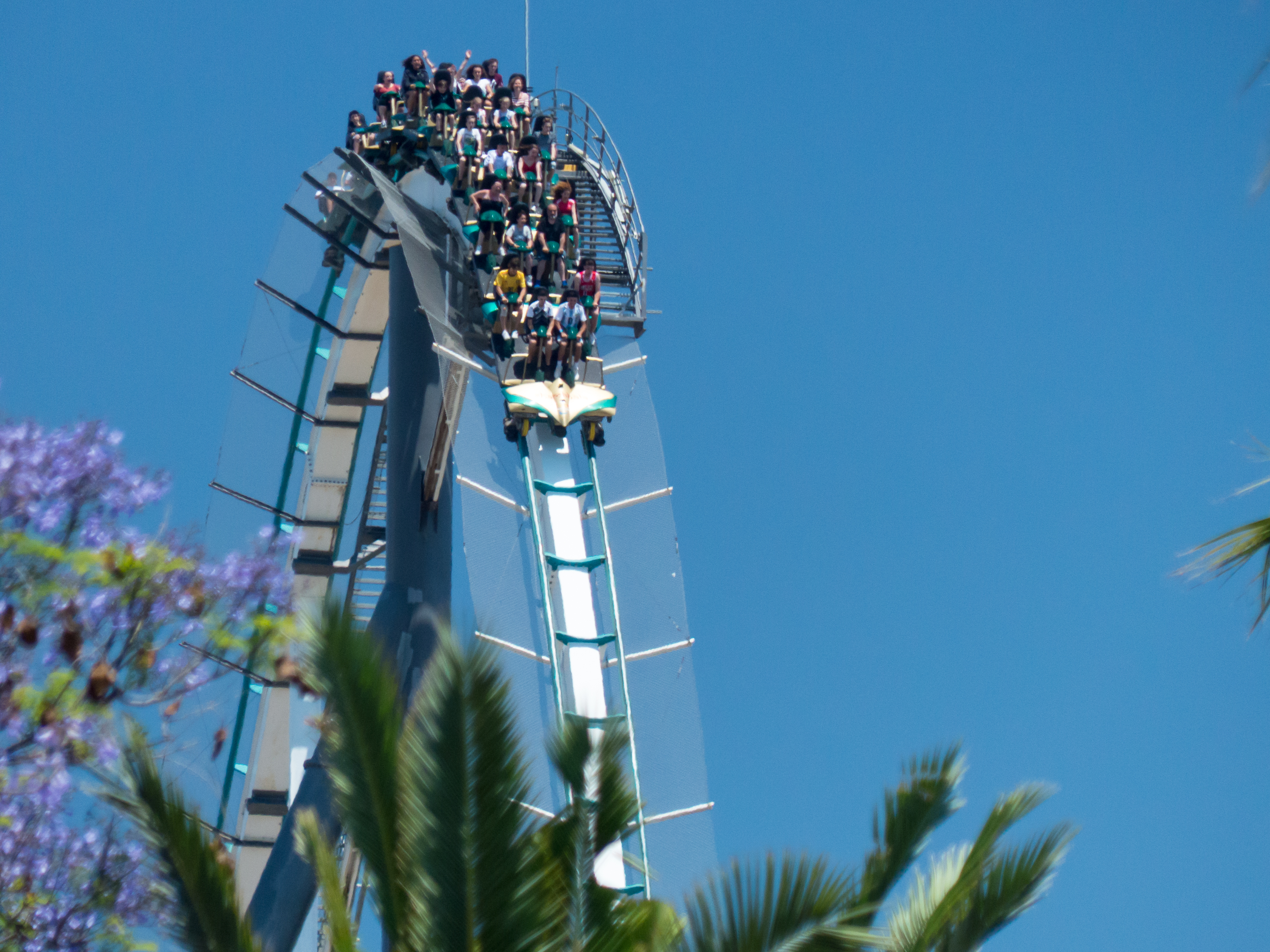 Shambhala war als erste Fahrt etwas ungeplant, spontan. Ehrlich gesagt haben wir den Eingang von Dragon Khan gesucht bis schließlich die Ungeduld und die Lust, endlich etwas zu fahren, überhand nahm. Da wir ohne FastPass verkehrten, entschieden wir uns für die Single Rider Line und ich durfte neben einem freundlichen Besucher in der ersten Reihe Platz nehmen. Mit dem Blick direkt aufs Meer habe ich mich vor Vorfreude nicht mehr eingekriegt und lehnte mich genussvoll in den Schalensitz, während wir nach oben kletterten. Der Kettenlift verlangsamt sich, die erste Reihe hängt über und der Blick fällt automatisch nach unten, wo die Schiene nahezu wegbricht. Trotz der Platzwahl kam hier schon eine nette Prise Airtime auf. Bei späteren Fahrten auf hinteren Plätzen hörte der First Drop allerdings gar nicht mehr auf zu ziehen. Gefühlte drei Sekunden schwebt man den Weg ins Tal, bis man allmählich in den Sitz gedrückt wird.