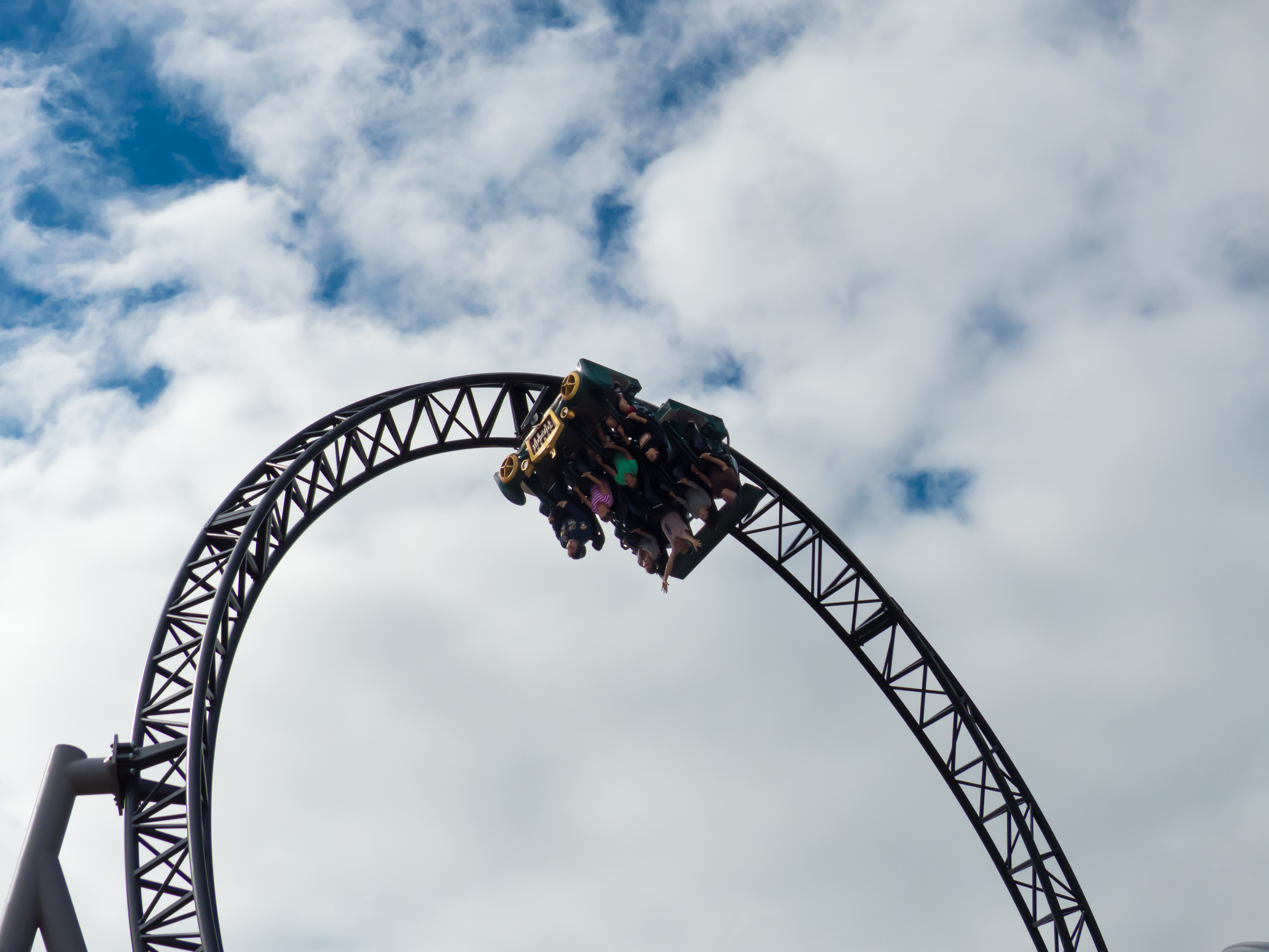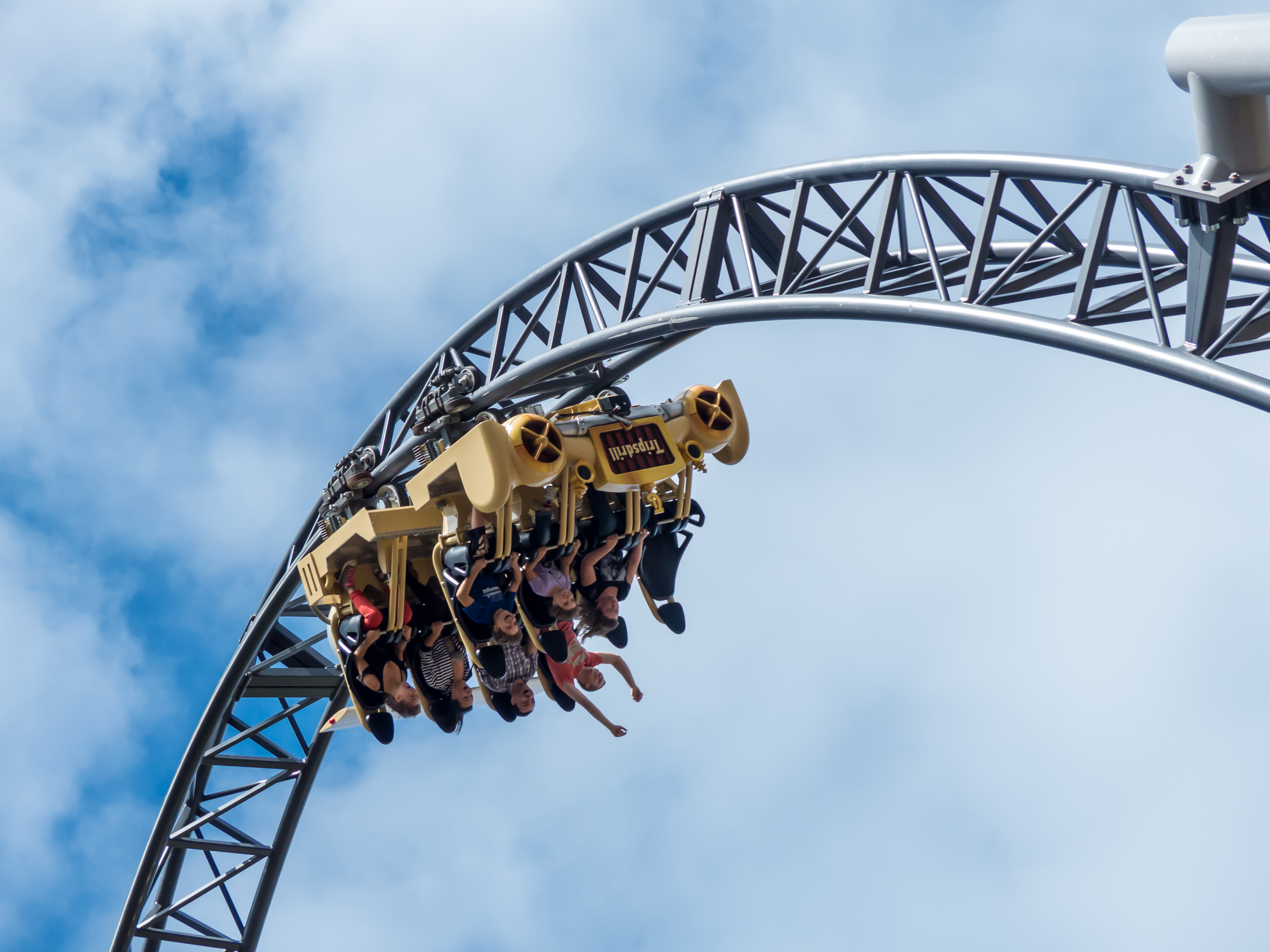 Top Hat, der nur bis circa zwei Drittel seiner Höhe von Schienenstützen getragen wird. Auf dem vermeintlich höchsten Punkt des Parks angekommen neigt sich der Zug sofort wieder steil nach links unten: Im Blickfeld erscheint der Erdboden, während dieser bereits um 90° rotiert wird. Die Schiene flacht allmählich aus und der Flitzeschlitten saust nur knapp über den Erdboden hinweg, ehe er ein zweites Mal Höhe aufnimmt. Dieses Mal schraubt sich der Wagen jedoch nach rechts und findet sich schließlich kopfüber unter der tragenden Schiene wieder. Für einen kurzen Moment hängen wir im Schoßbügel und können mit ausgestreckten Armen die auf den Kopf gestellte Freiheit genussvoll wirken lassen. (Auf den Schulterbügel-Varianten ist man in seiner Gestik dagegen stark eingeschränkt und kann die Arme in etwa so viel bewegen wie Bernd das Brot.) Der Himmel findet sich wieder in der oberen Sichtfeldhälfte ein und in einem schwungvollen Rechts-Links-Manöver mit Steilkurve ändert der Zug seine Richtung und fährt deutlich verlangsamt durch die erste