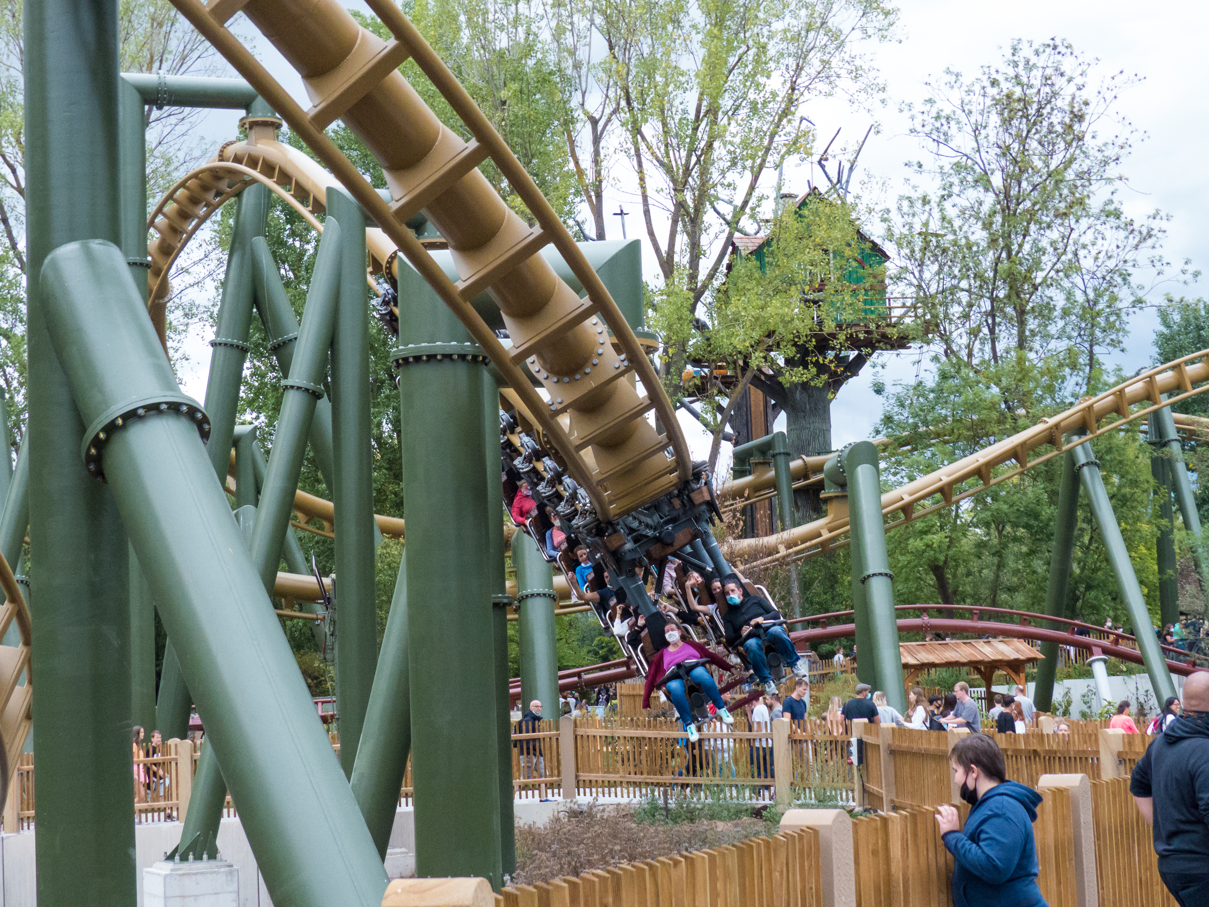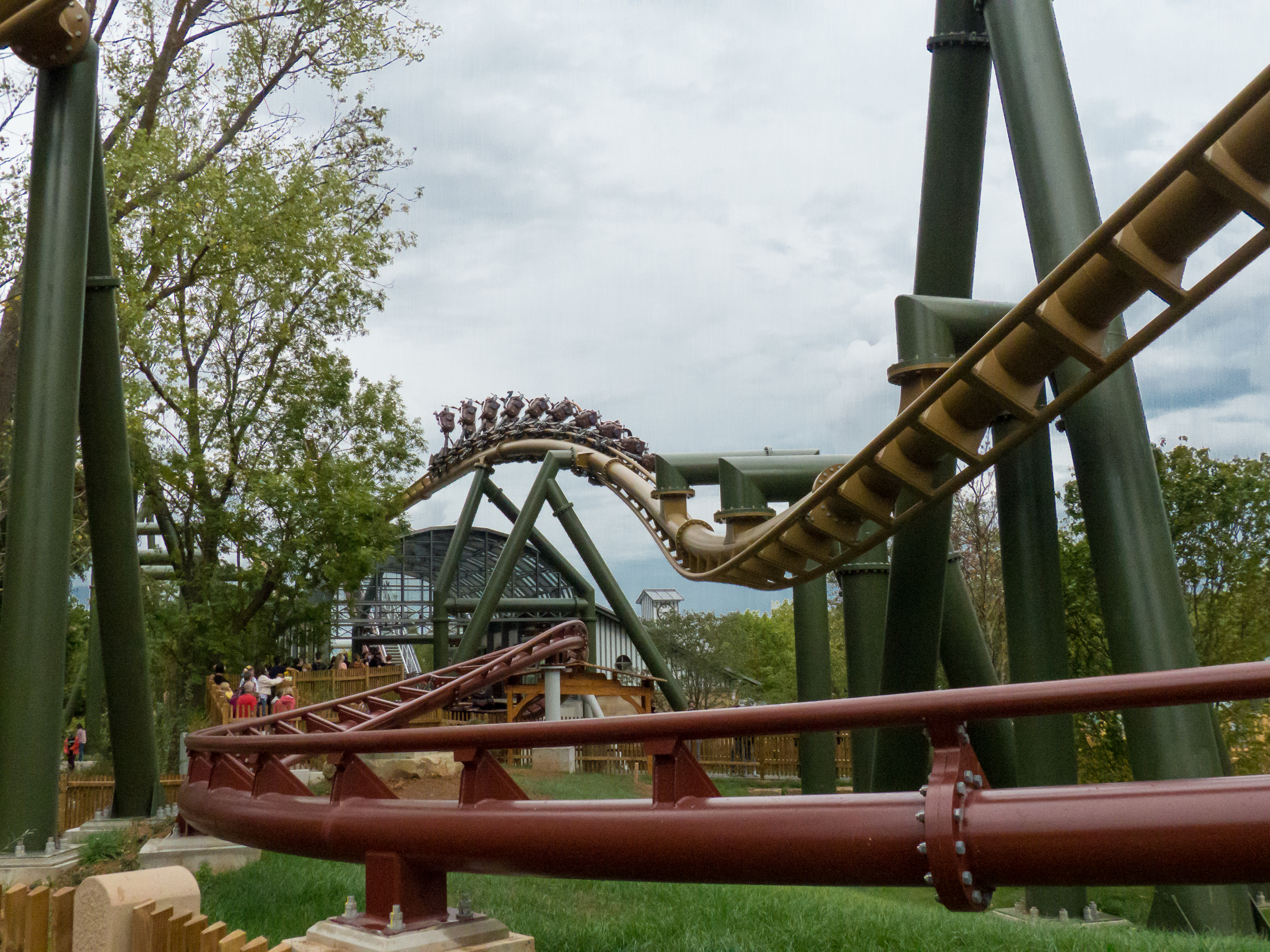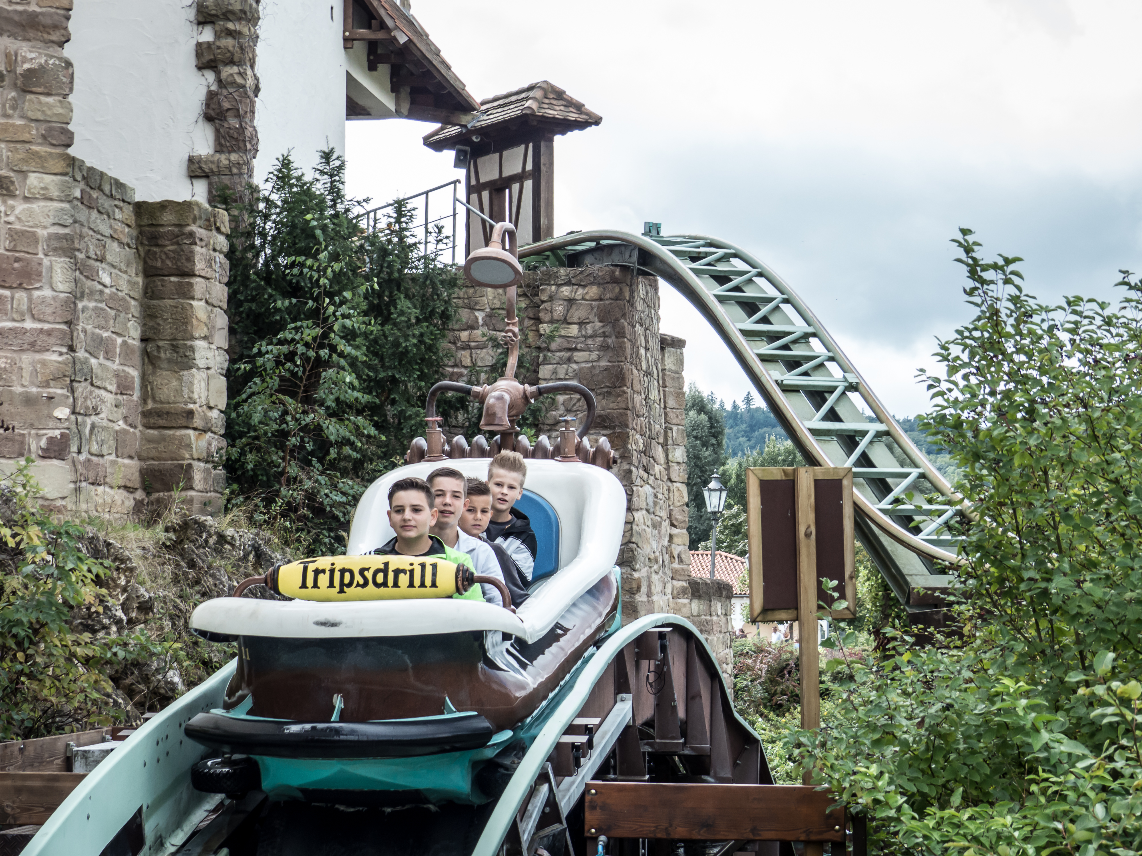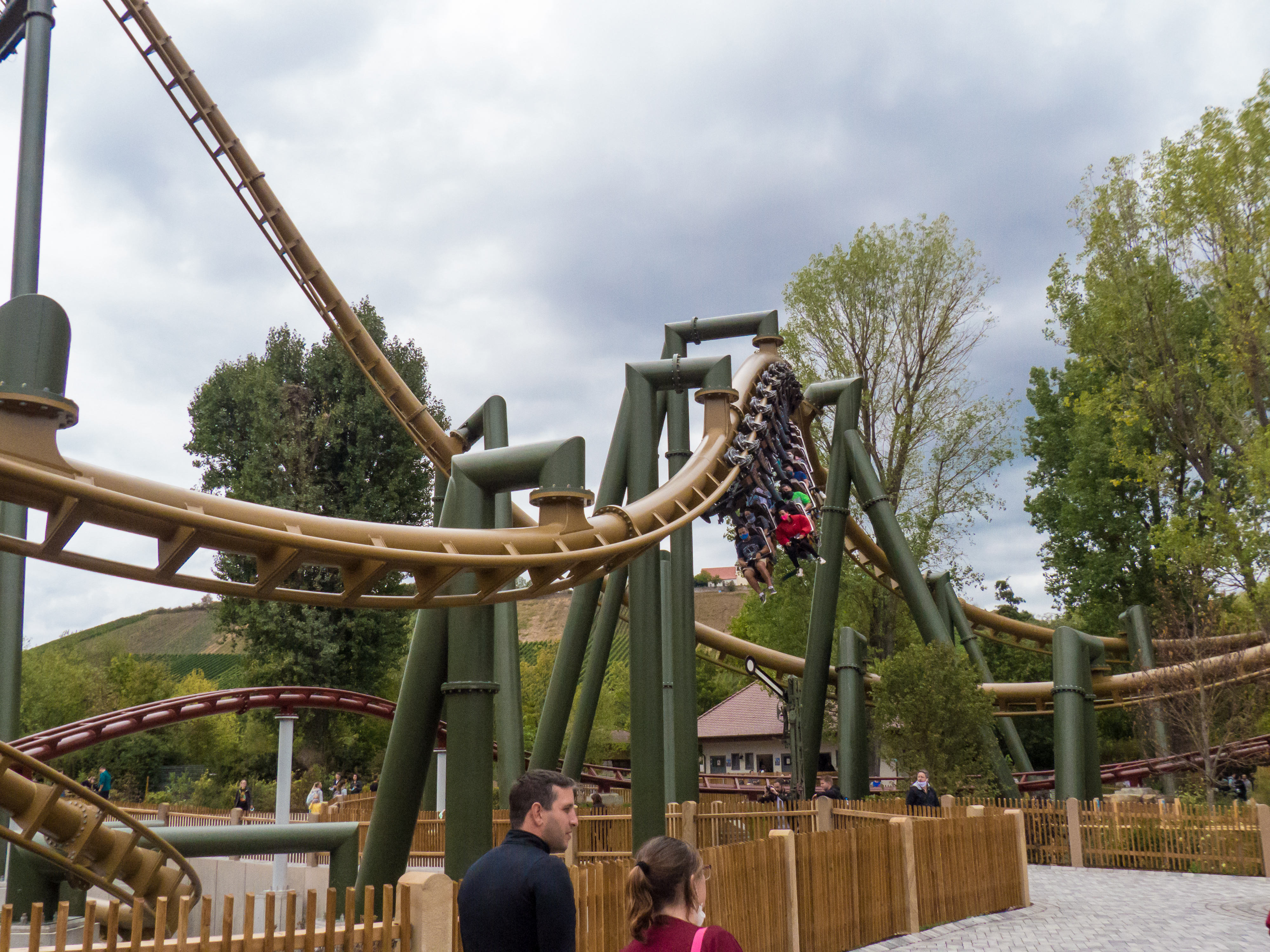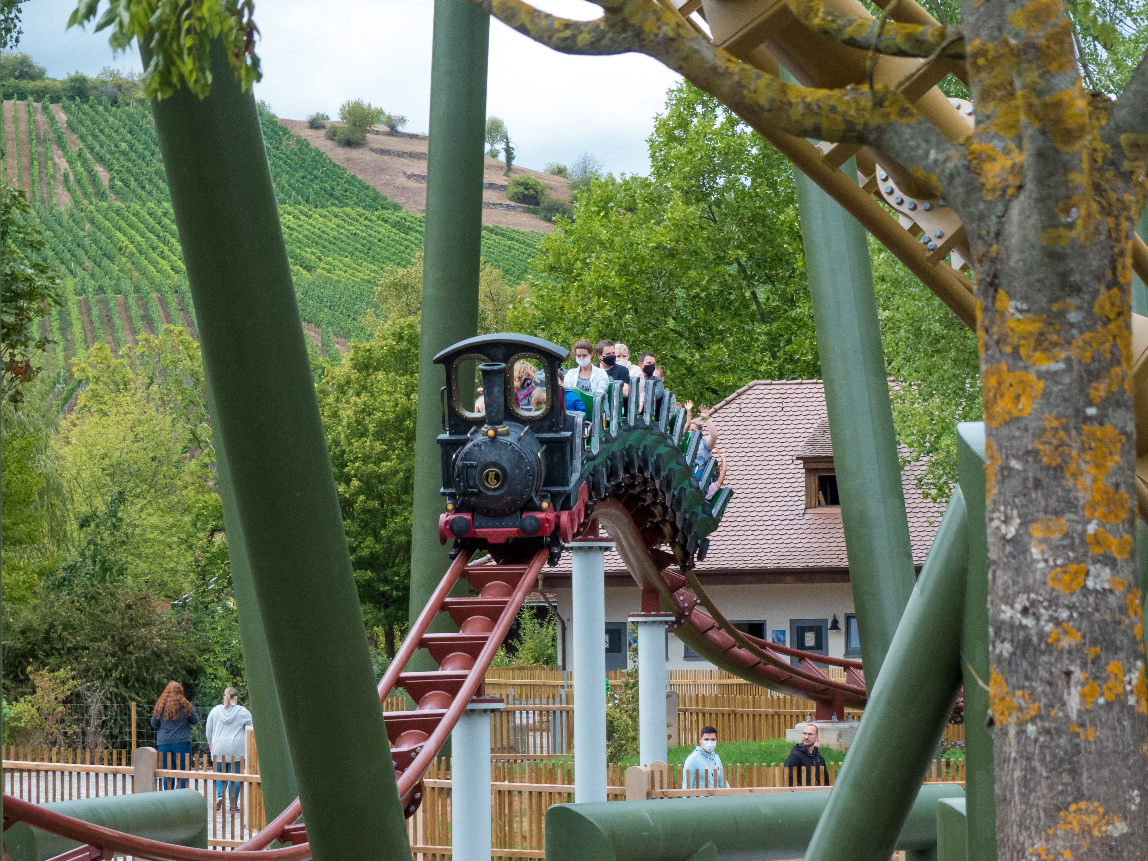 g-Kräfte. Dabei präsentiert sich diese Achterbahn mit feinsten Fahreigenschaften: Es gibt zwar eine geringe Laufunruhe und ich bin mir sicher, dass sich der Lack auf der Schiene an einigen Stellen schneller abnutzen wird als an anderen. Wer sich jedoch hieran stört, hat sich das falsche Hobby rausgesucht. Ich bin heilfroh, dass sich die Holländer zurück ins Invertergeschäft trauen und sich dabei mehr trauen, als Loopings, Immelmänner und Flatspins aneinanderzureihen. Die Rechnung geht in Tripsdrill in jedem Fall auf. Ich bin gespannt, was in der Saisonpause noch alles geschieht – insbesondere der letzte Graben mit dem anschließenden Flatspin fühlt sich bereits ohne fußnahe Thematisierung verdächtig nach Black Mamba an. Noch dazu ist bereits jetzt offensichtlich, dass der Park großen Wert darauf gelegt hat, auch Außenstehende zu beeindrucken, sodass die Züge immer wieder sehr nah an die umliegenden Wege herangeführt werden oder diese in sausendem Tempo überfahren. Apropos Interaktion: Tripsdrill ist auf den Zug aufgesprungen, sich gleich zwei Achterbahnen zu bestellen, sodass wir direkt im Anschluss zur kaminroten Schwesteranlage wechseln.