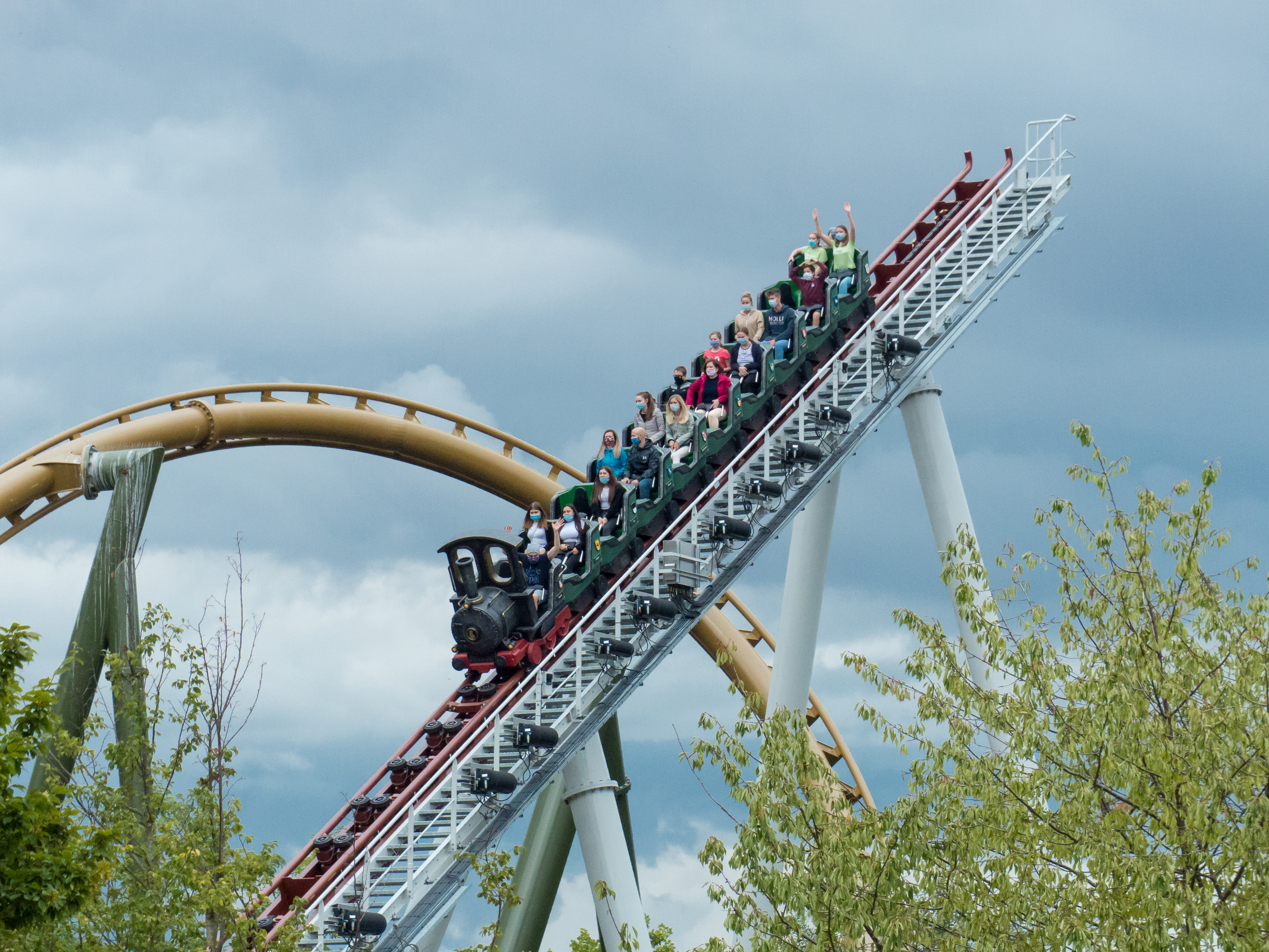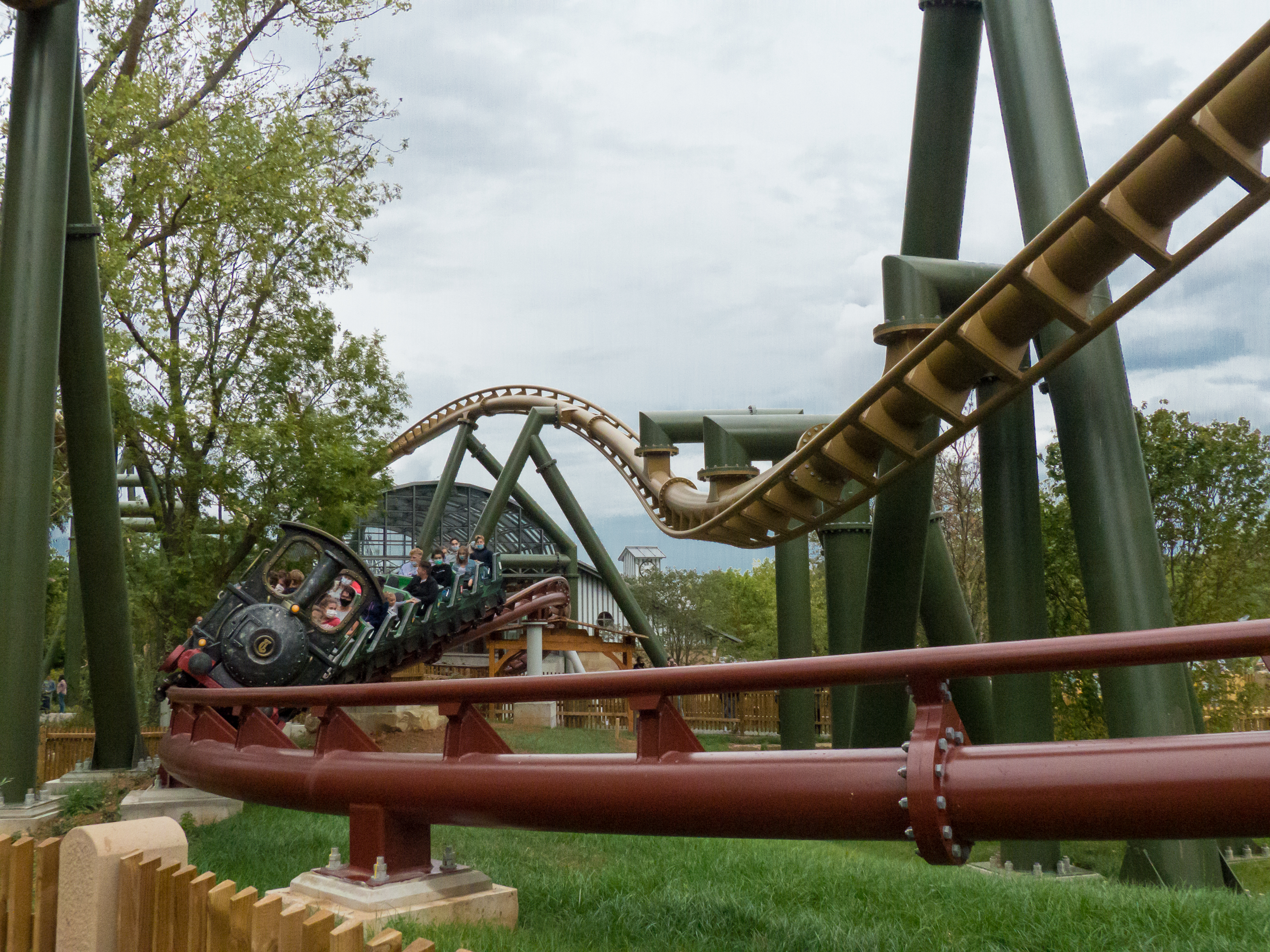G-Roll von Hals über Kopf und es finden sich beispielsweise im Zugdesign viele kleine Spielereien wie eine Anleitung zum Mitsingen oder besonders kreativ benannte Wagenreihen. In meinen Augen ist Volldampf nettes Beiwerk – eine Chance für die Kleineren oder weniger Tapferen ein Wörtchen mitzureden bei dem Geflecht zweier Achterbahnen. Offen gesagt war ich nach der ersten und einzigen Fahrt ein wenig enttäuscht, da selbst für einen Junior Coaster etwas zu wenige Kräfte am Werk waren. Volldampf lebt meines Erachtens von der Interaktion mit seinem Gegenspieler und beherrscht dieses Gegenspiel hervorragend. Das Fahrterlebnis wird sicherlich in absehbarer Zeit durch den fertigen Station-Fly-Through nochmals deutlich aufgewertet, zaubert aber bereits in der jetzigen Form ein fröhliches Lächeln in viele Kindergesichter.