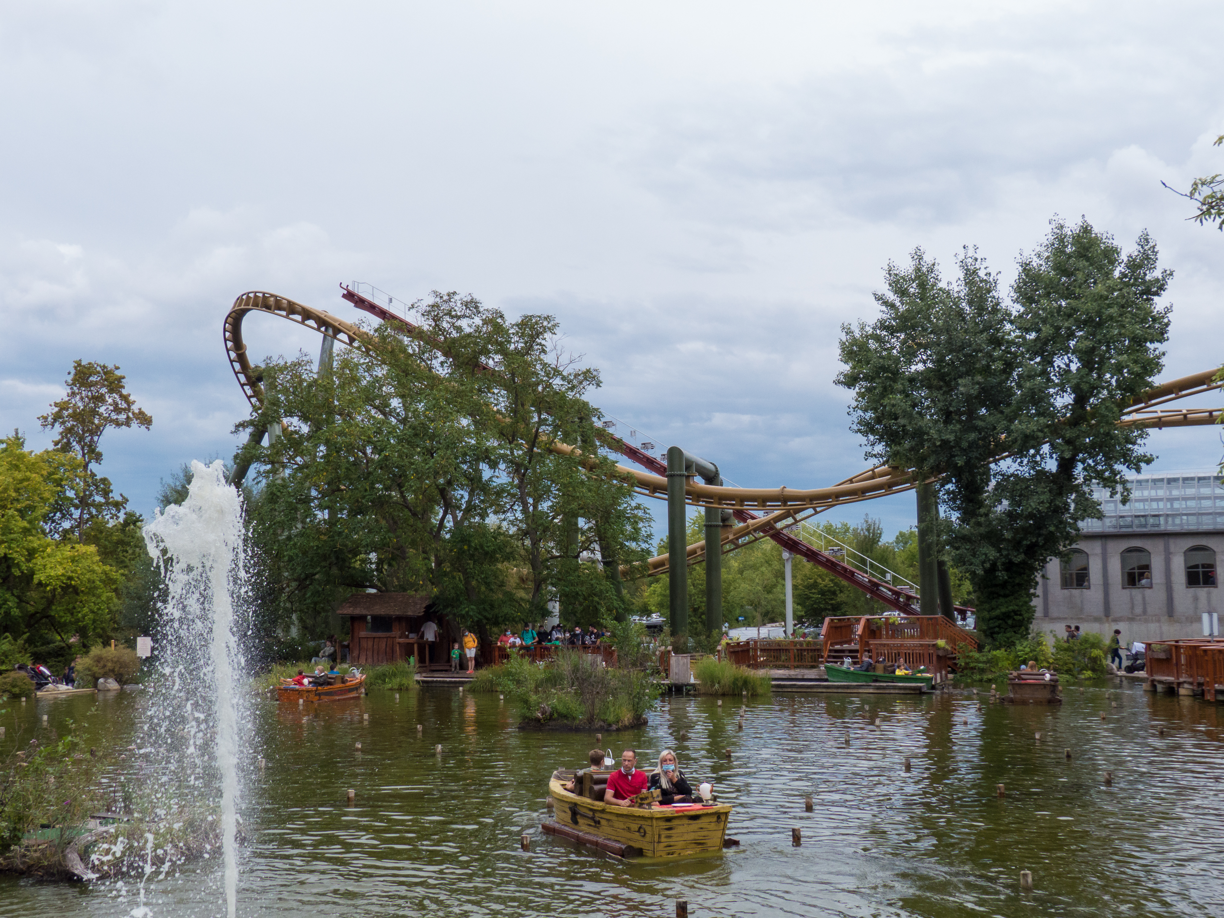 Die beiden werkfrischen Vekoma-Anlagen liefern einen guten Hintergrund für die Bootsfahrt ab