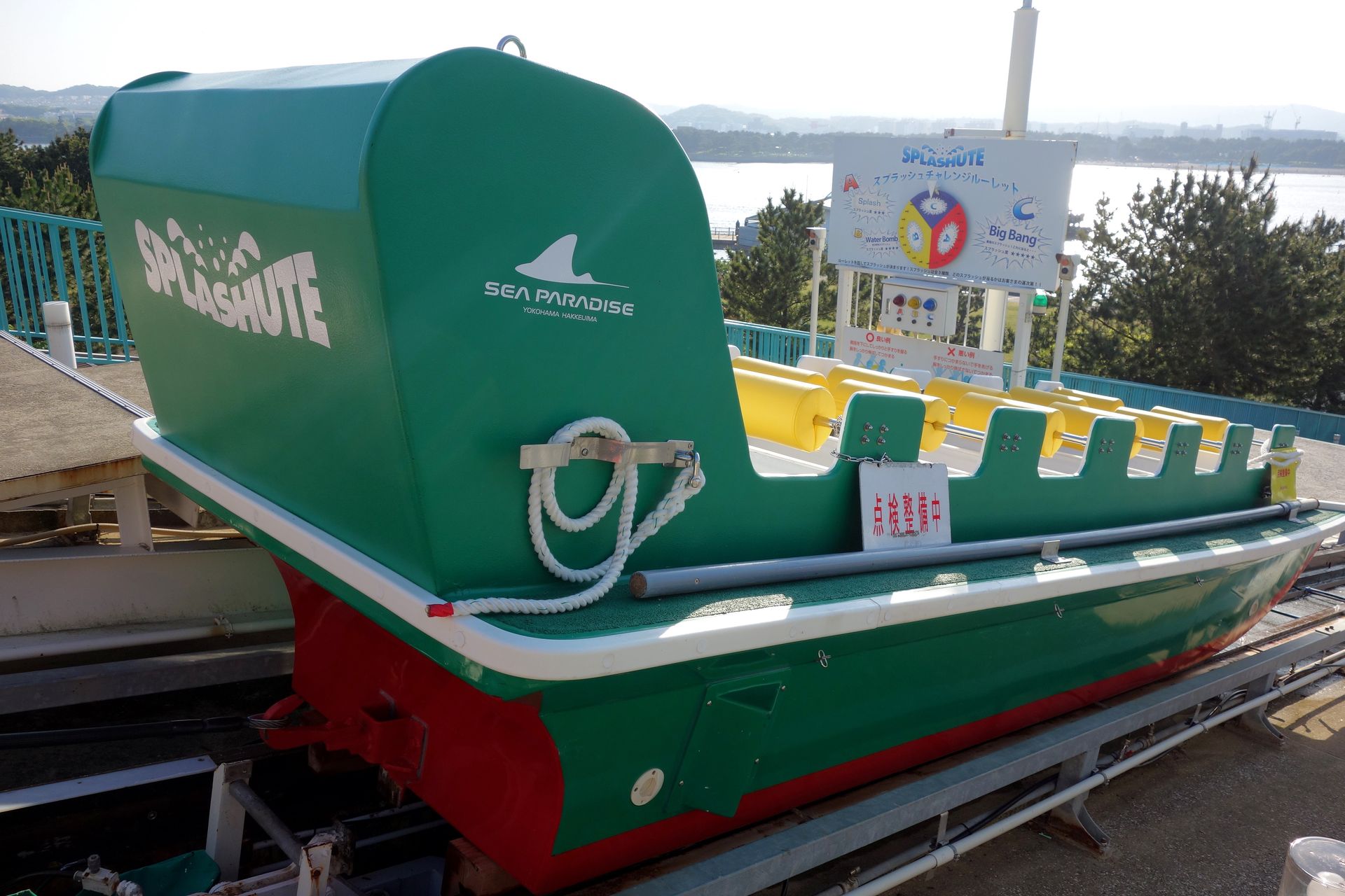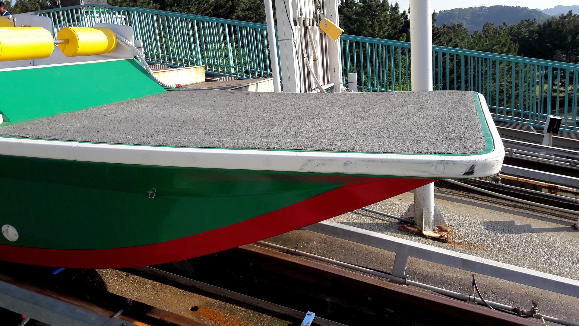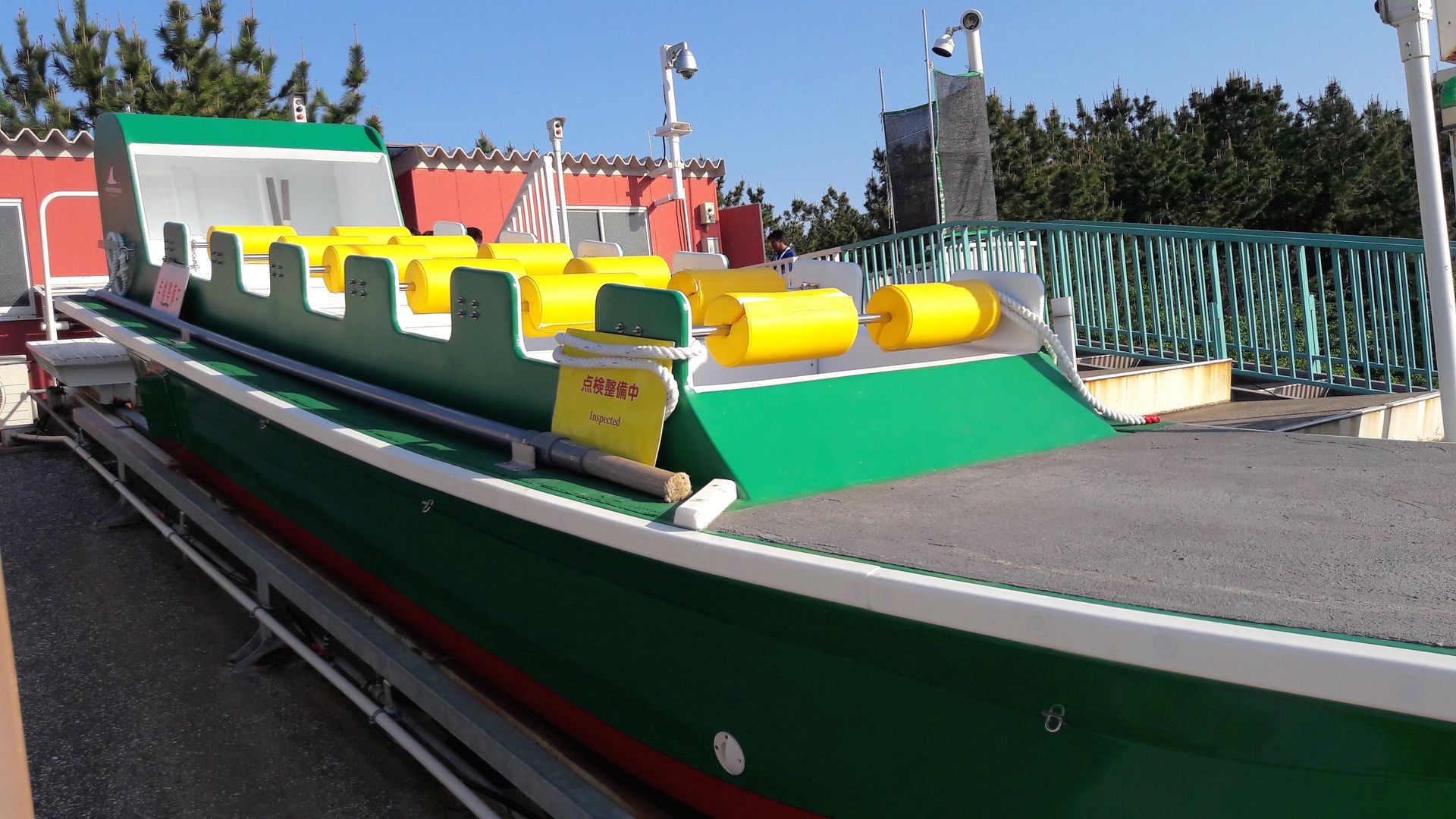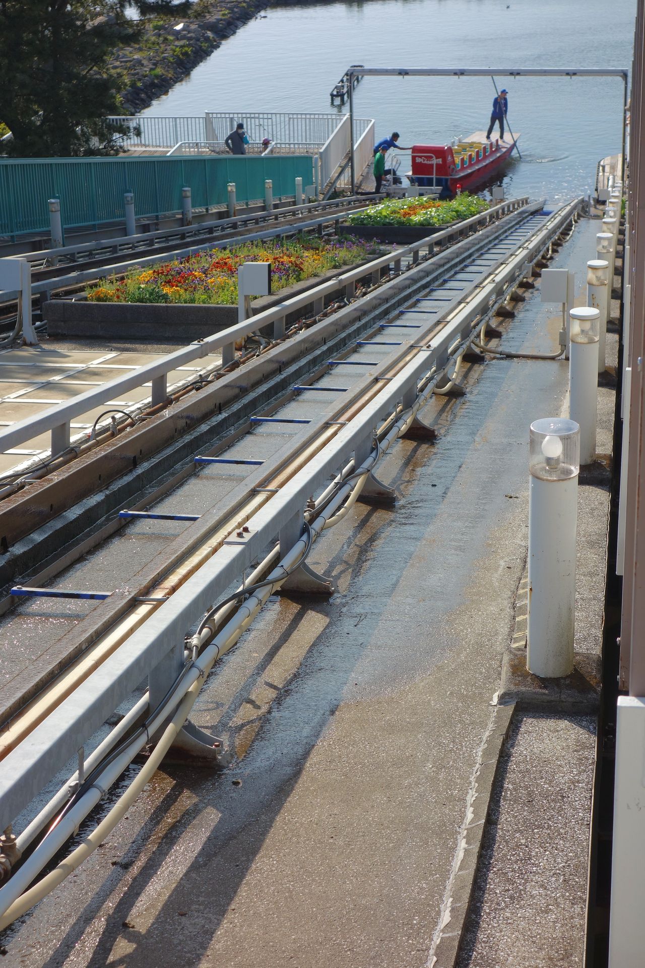 Dieses ist wiederum nur durch einen Schotterwall vom Meer - also den Ausläufern der Bucht von Tokio - abgegrenzt. Schienen gibt es dort nicht mehr, am Ende der Rampe schwamm das Boot einfach auf und ein mitgefahrener Mitarbeiter zwang es mittels Gewichtsverlagerung in eine Kurve, womit gleichzeitig auch das Tempo abgebaut wurde. Für den Fall der Fälle war der Schotterwall in einer Ecke mit Autoreifen ausgelegt, damit ein auflaufendes Boot nicht beschädigt wurde. Mithilfe einer Stange steuerte der Mitarbeiter das Boot dann zur Plattform neben der Rampe, wo die Besucher das Boot verließen.