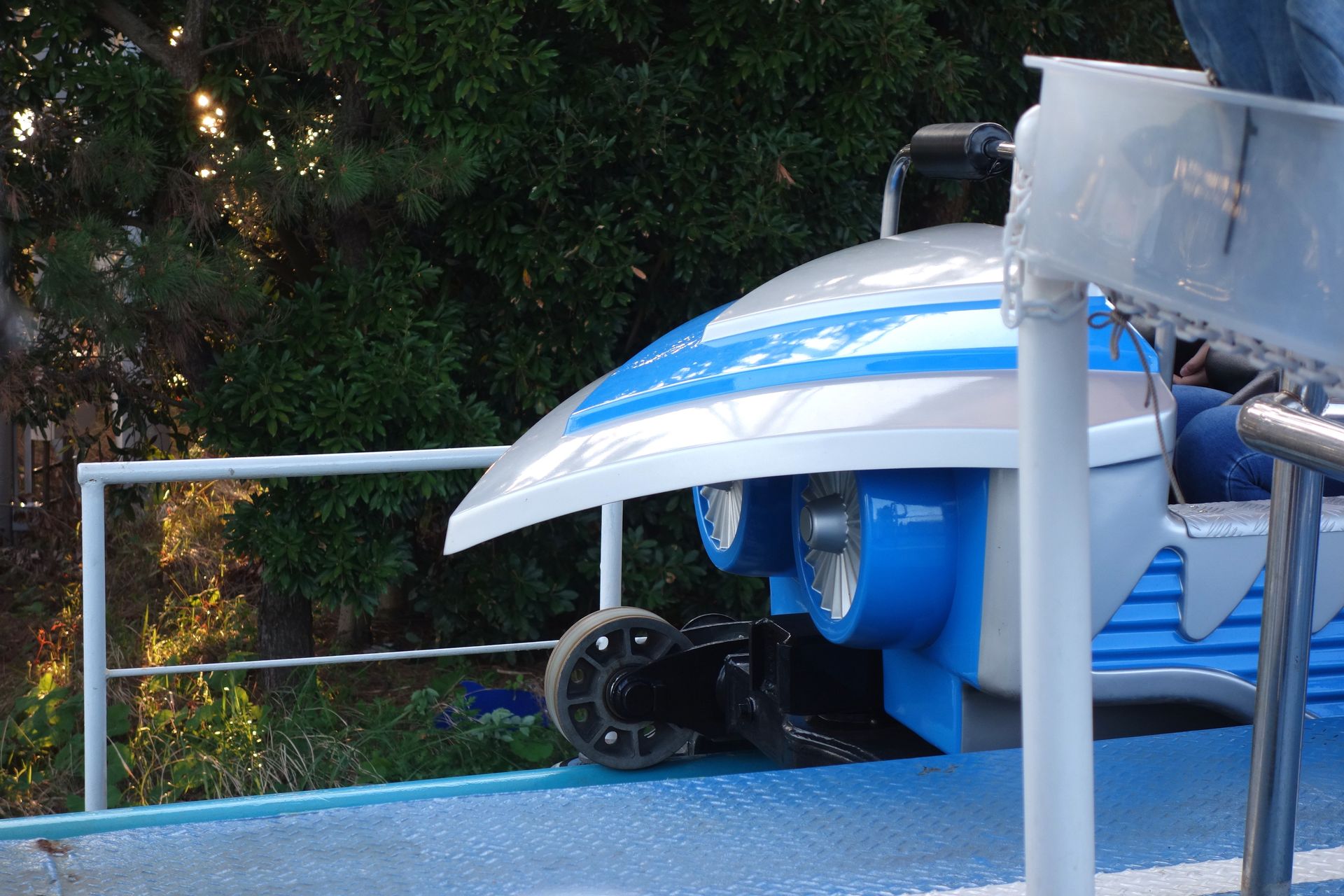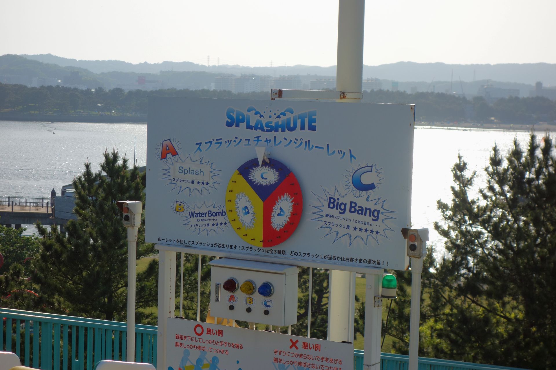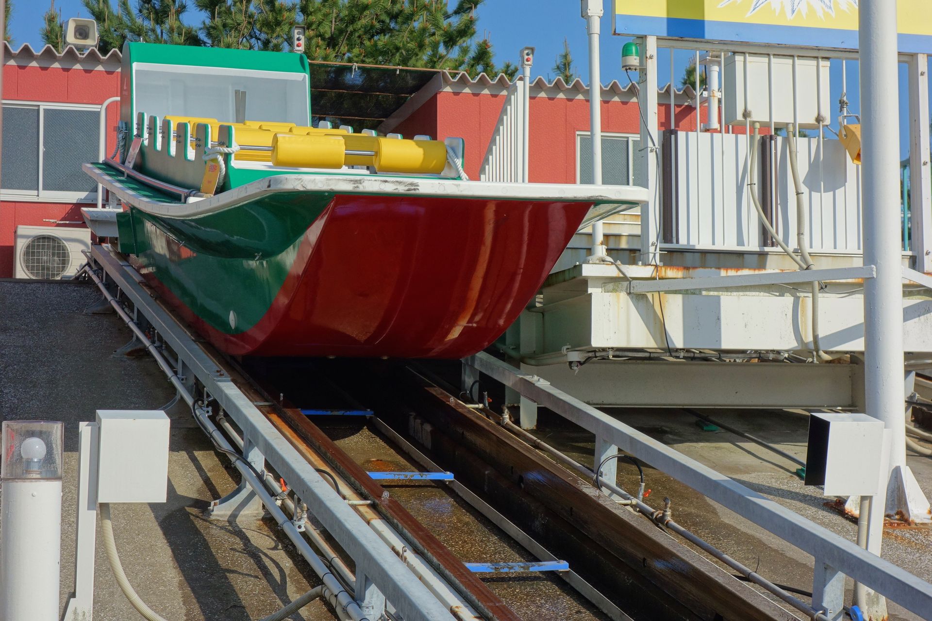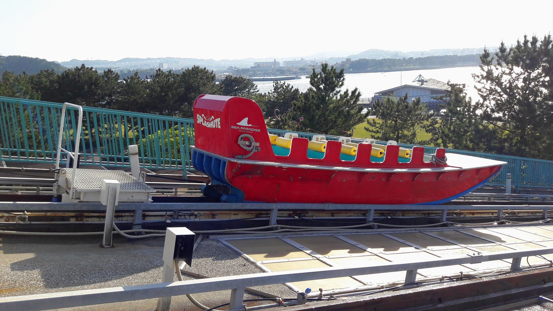 Dieses ist wiederum nur durch einen Schotterwall vom Meer - also den Ausläufern der Bucht von Tokio - abgegrenzt. Schienen gibt es dort nicht mehr, am Ende der Rampe schwamm das Boot einfach auf und ein mitgefahrener Mitarbeiter zwang es mittels Gewichtsverlagerung in eine Kurve, womit gleichzeitig auch das Tempo abgebaut wurde. Für den Fall der Fälle war der Schotterwall in einer Ecke mit Autoreifen ausgelegt, damit ein auflaufendes Boot nicht beschädigt wurde. Mithilfe einer Stange steuerte der Mitarbeiter das Boot dann zur Plattform neben der Rampe, wo die Besucher das Boot verließen.