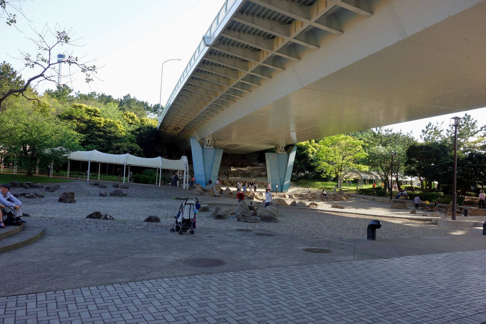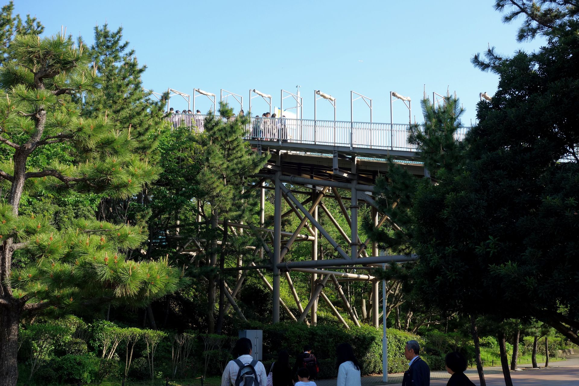 Die 1992 fertiggestellte Shiba Route Bridge ist mit ihrem 45 Meter hohen Turm kaum zu übersehen. Offiziell gehören ihre vier Fahrspuren (zwei pro Richtung) zur Nationalstraße 357, welche als Tokyo Bay Road von Chiba (östlich von Tokio) bis nach Yokosuka führt. Beziehungsweise führen soll, denn aktuell endet die Straße mitten im Hakkeijima Sea Paradise. Tatsächlich hat man auf der Insel sogar einen künstlichen Berg angelegt in dem die Straße nach der Brücke per Tunnel verschwindet. Obendrauf befindet sich wohl noch ein Rosengarten. Auf der anderen Seite des Tunnels befindet sich derzeit noch ein Wendehammer mit Busbahnhof. Bisher dürfen nämlich nur Busse zum Hakkeijima Sea Paradise diese Straße nutzen. Ändern soll sich das erst, wenn endlich die weiterführende Verbindung an der im letzten Bericht erwähnten Nissan-Teststrecke vorbei nach Yokosuka fertiggestellt wurde. Dann wird der eingangs gezeigte Blick auf die Achterbahn von einer weiteren Brücke verdeckt werden. Die Bauarbeiten sind wohl im Sommer 2018 - 30 Jahre nach Beginn der Planung - endlich angelaufen.
