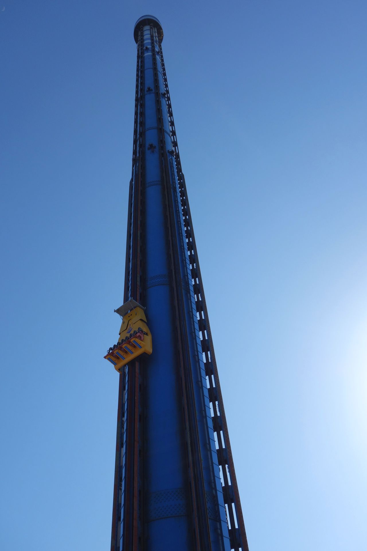 Richtig, da oben sind tatsächlich Bremsschwerter montiert. Auf drei Spuren fiel man also direkt 62 Meter nach unten, bis man die 38 Meter lange Bremsstrecke erreichte. Die drei anderen Spuren boten den sogenannten Fake Drop, bei dem man nach dem Ausklinken zunächst nur 2 Meter absackte, ehe man nochmal abgebremst wurde. Erst nach gemächlicher Überwindung des 6 Meter langen Bremsschwerts ging es die übrigen 54 Meter bis zur eigentlichen Bremsstrecke wieder frei nach unten. War ein interessantes Gimmick, ging aber leider zulasten der Intensität, wie ich meine. Schließlich wurde man schon wieder gebremst, ehe man die Initialbeschleunigung wirklich bemerkt hatte. Und die Beschleunigung nach der Bremsstrecke fühlte sich nicht mehr so knackig an, weil man ja schon in Bewegung war. Außerdem war die tatsächliche Fallstrecke natürlich entsprechend kürzer. Ich hätte die Bremsstrecke vielleicht erst nach 10 Metern platziert, da wäre sie eventuell noch etwas besser zur Geltung gekommen.