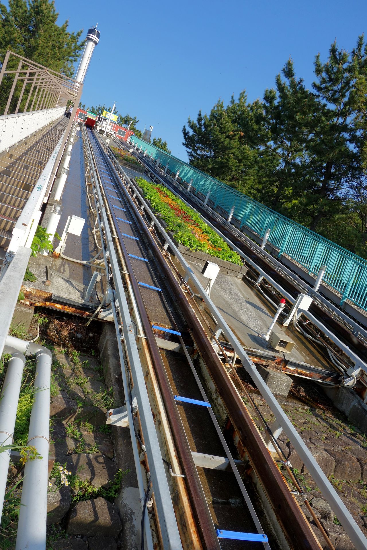 Die ragt mit einer Steigung von 12 Grad gute 70 Meter vom Ufer ins Inselinnere hinein. Eine vergleichsweise moderne Stahlkonstruktion sorgt dabei für einen Abstand von etwa 16 Metern zum darunterliegenden Boden samt Wegen. Auf der Rampe finden zwei Spuren aus Holzschienen Platz. Links und rechts der Rampe führt jeweils eine Treppe nach oben. Früher war der Andrang so groß, dass jede Spur einen eigenen Aufgang als Wartebereich hatte. Soweit ich das vom Eindruck vor Ort und auch von Bildern und Videos im Netz ausmachen konnte, wurde aber seit längerem nur noch der linke Aufgang für beide Spuren genutzt - sofern denn überhaupt beide Spuren gleichzeitig in Betrieb waren.