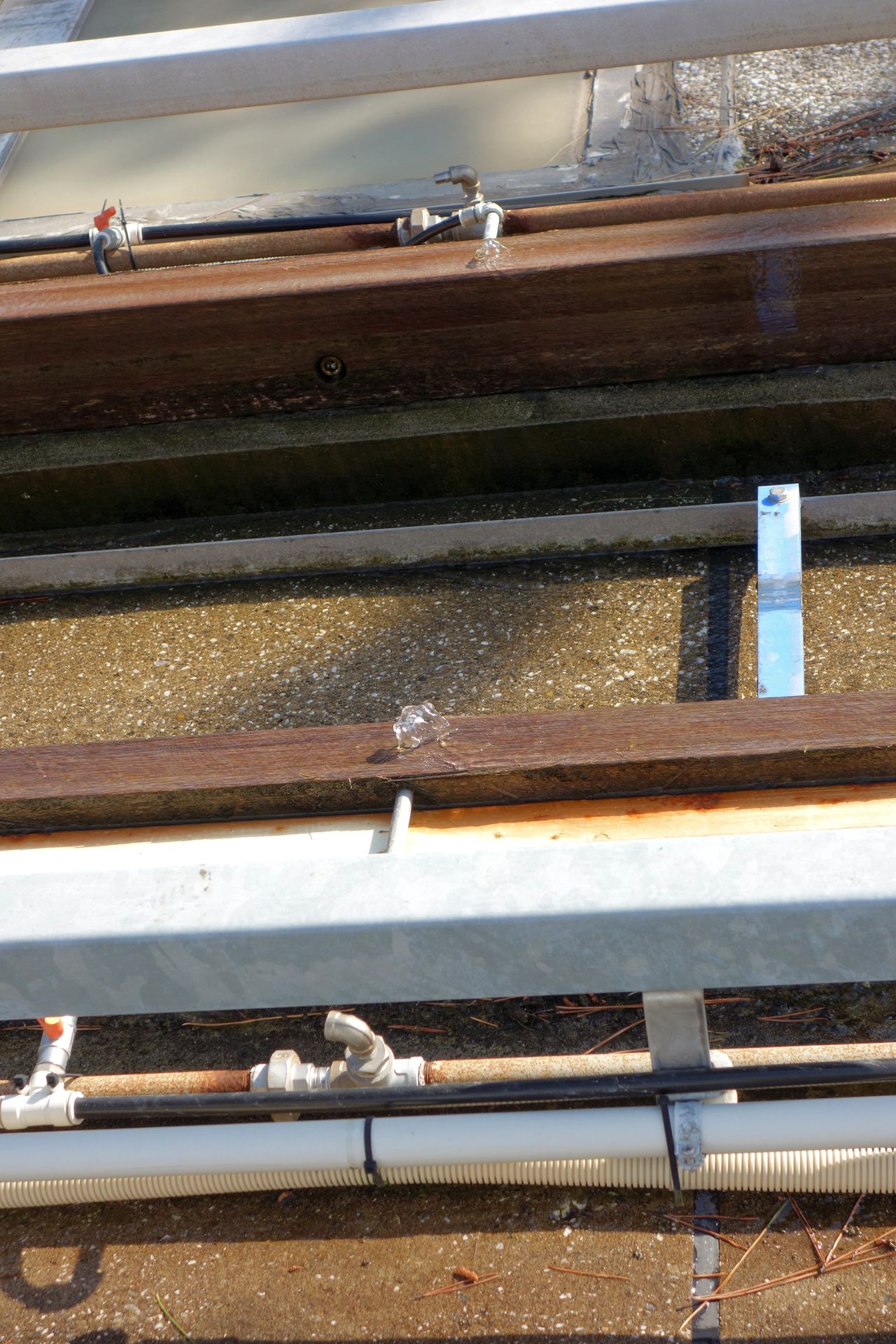 ) sprudelte Wasser aus den Holzschienen und bildete einen dünnen Film auf diesen.