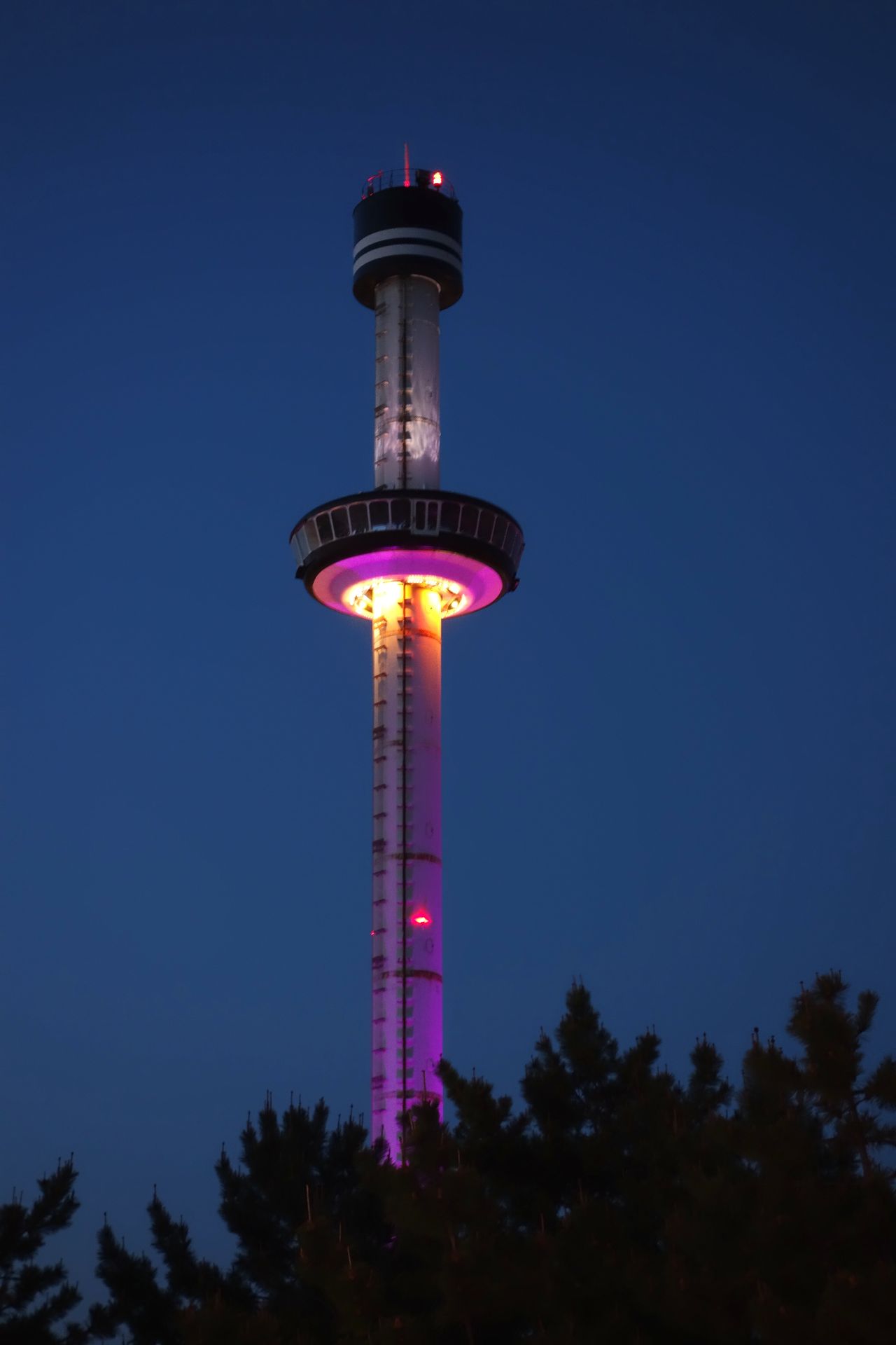 Viel los war nicht, mindestens eine der sechs Gondeln war auch außer Betrieb. Bevor wir auf den bekannten Vierersitzen Platz nehmen konnten, mussten wir aber noch eine Art dünne Plastik-Regenjacke in modischem, transparenten Rosa überziehen. Leider konnte ich bis heute nicht herausfinden, wozu diese gut sein sollten. Da sie auf älteren Bildern und Videos zudem nicht zu sehen sind, scheinen sie auch erst seit kurzem Pflicht gewesen zu sein. Als Regenschutz brauchten wir sie jedenfalls definitiv nicht, feucht wurde man eher, weil man darunter noch mehr schwitzte als eh schon. Ob man also schlichtweg die Sitze vor dem Schweiß der Mitfahrer schützen wollte? Oder war der Motor gar nicht mehr ganz dicht und man wollte die Kleidung der Besucher vor eventuell herabtropfenden Betriebsstoffen schützen? Das wäre zumindest eine Erklärung dafür, dass der Turm Ende März 2020 offiziell geschlossen wurde. Angeblich hat er die Inspektion nicht mehr bestanden...