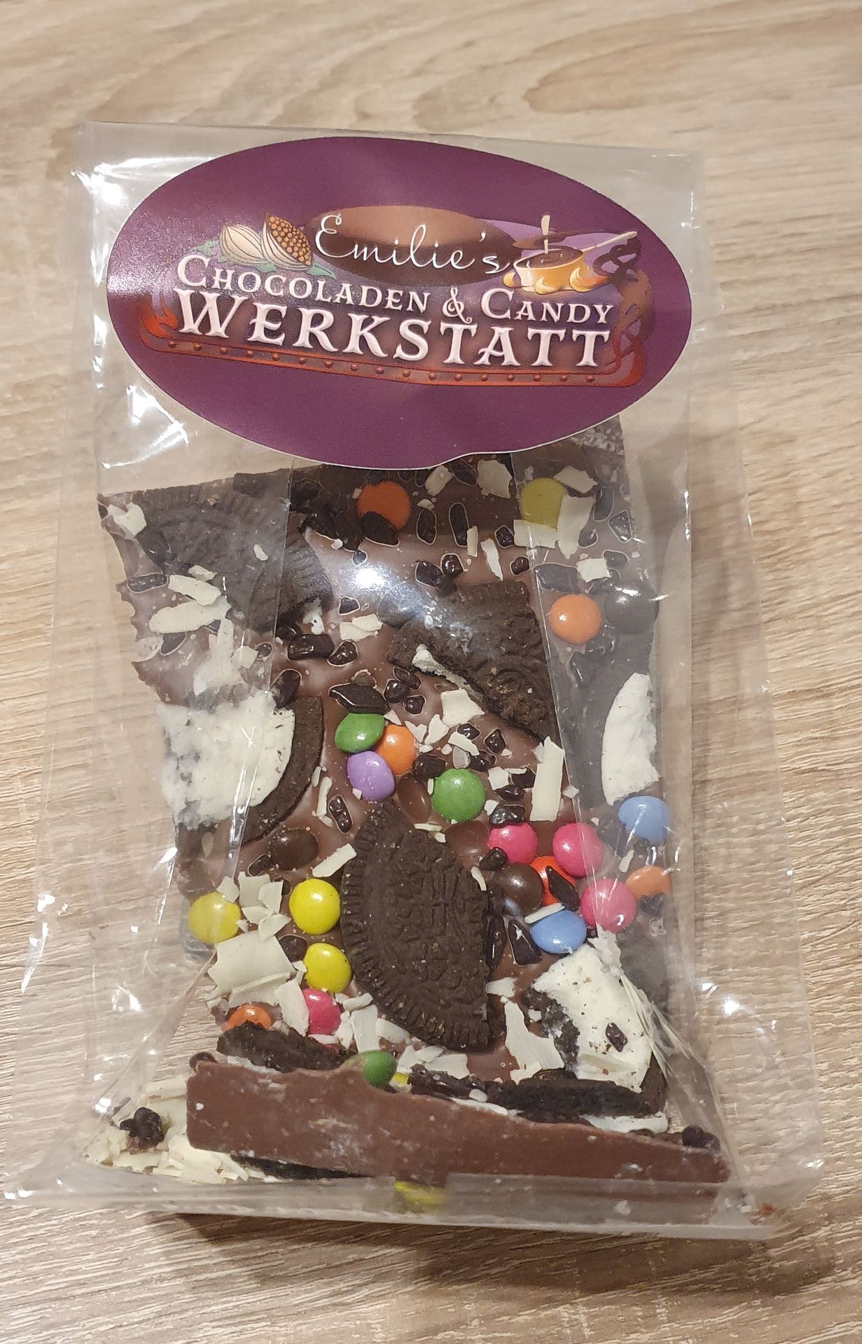 Die Vollmilch-Oreo-Schokolinsen-Schokolade kurz vor der Vernichtung