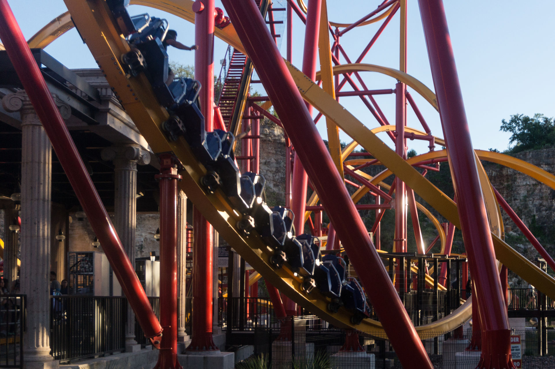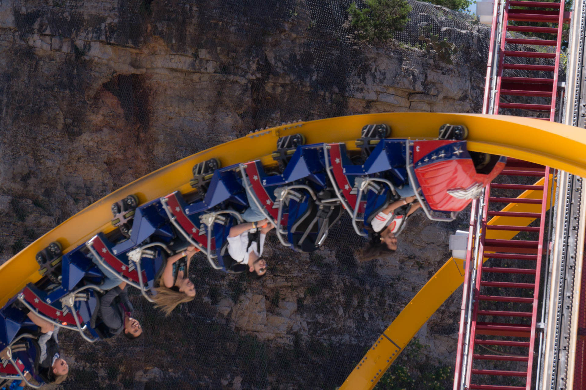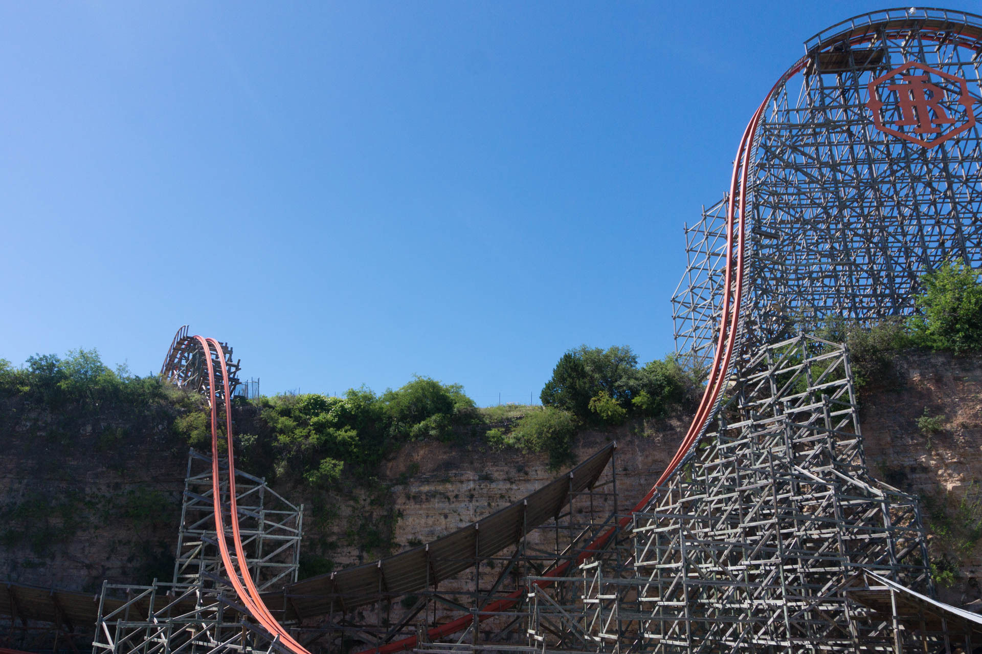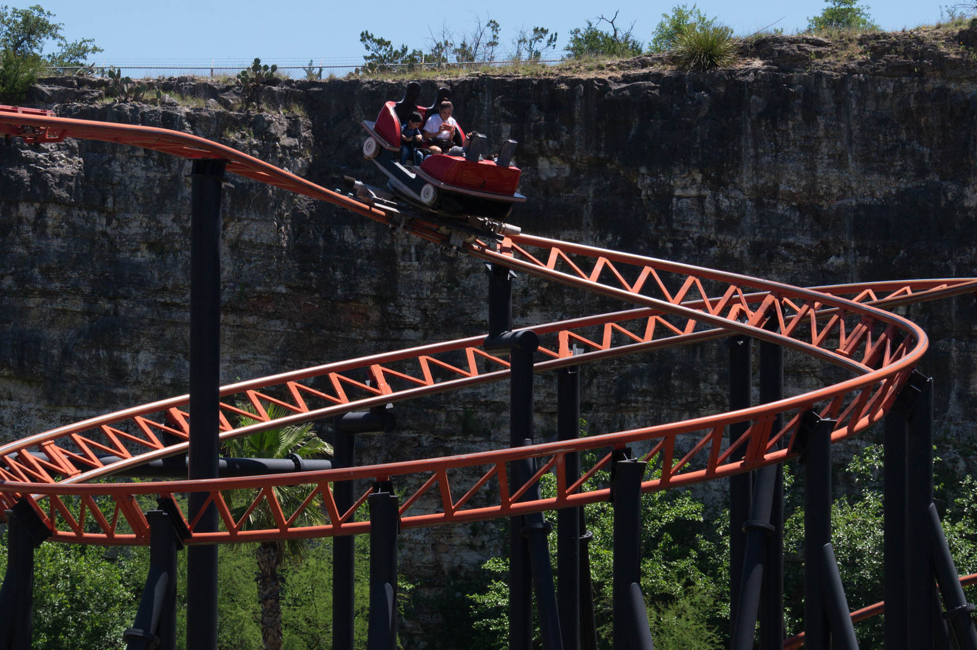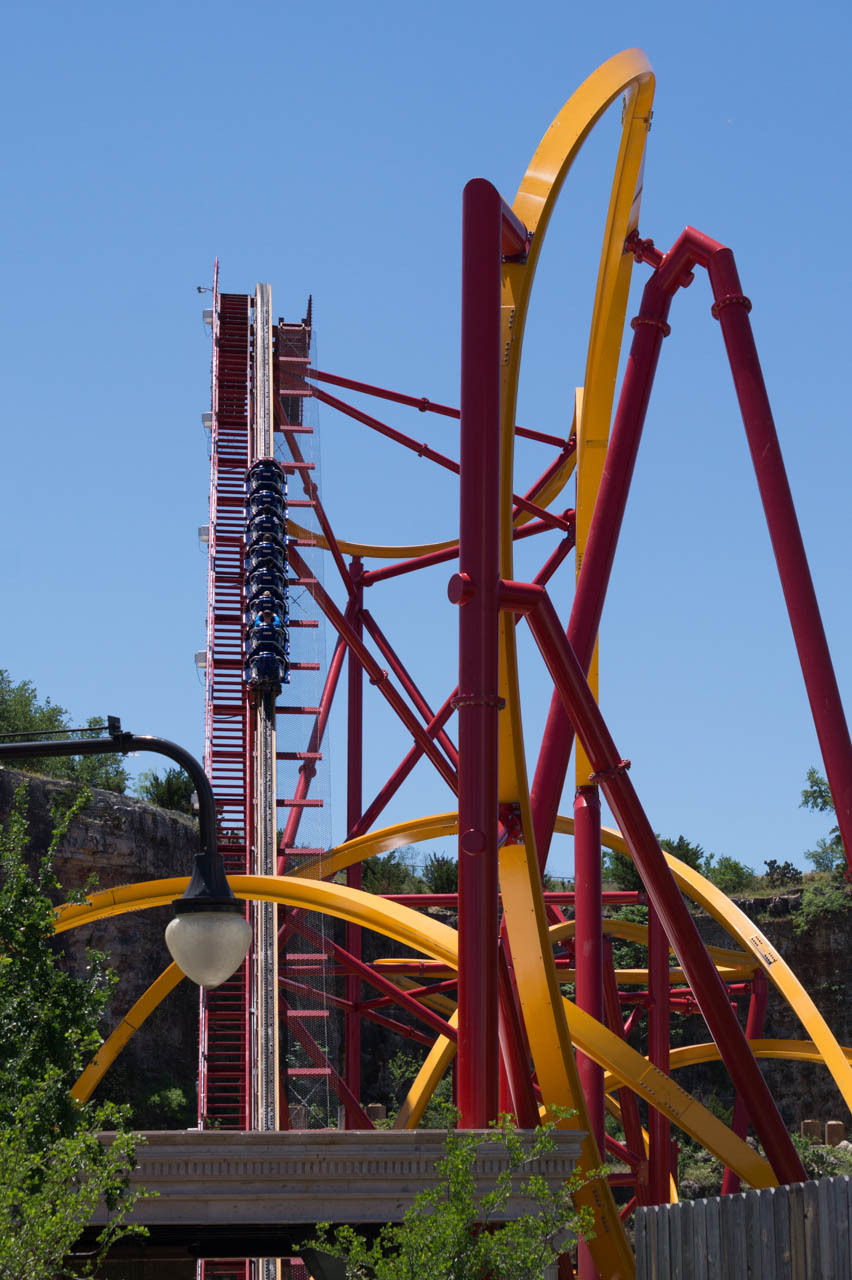 Oben an der Steinbruchwand angekommen, genießen wir den Blick auf das Einkaufszentrum The Shops at La Cantera, bevor wir uns in einer immer steiler werdenden Kurve nach unten begeben. In unsere Sitze gepresst, rasen wir nun durch das erste Tal, bevor wir in den großen Looping einfahren.