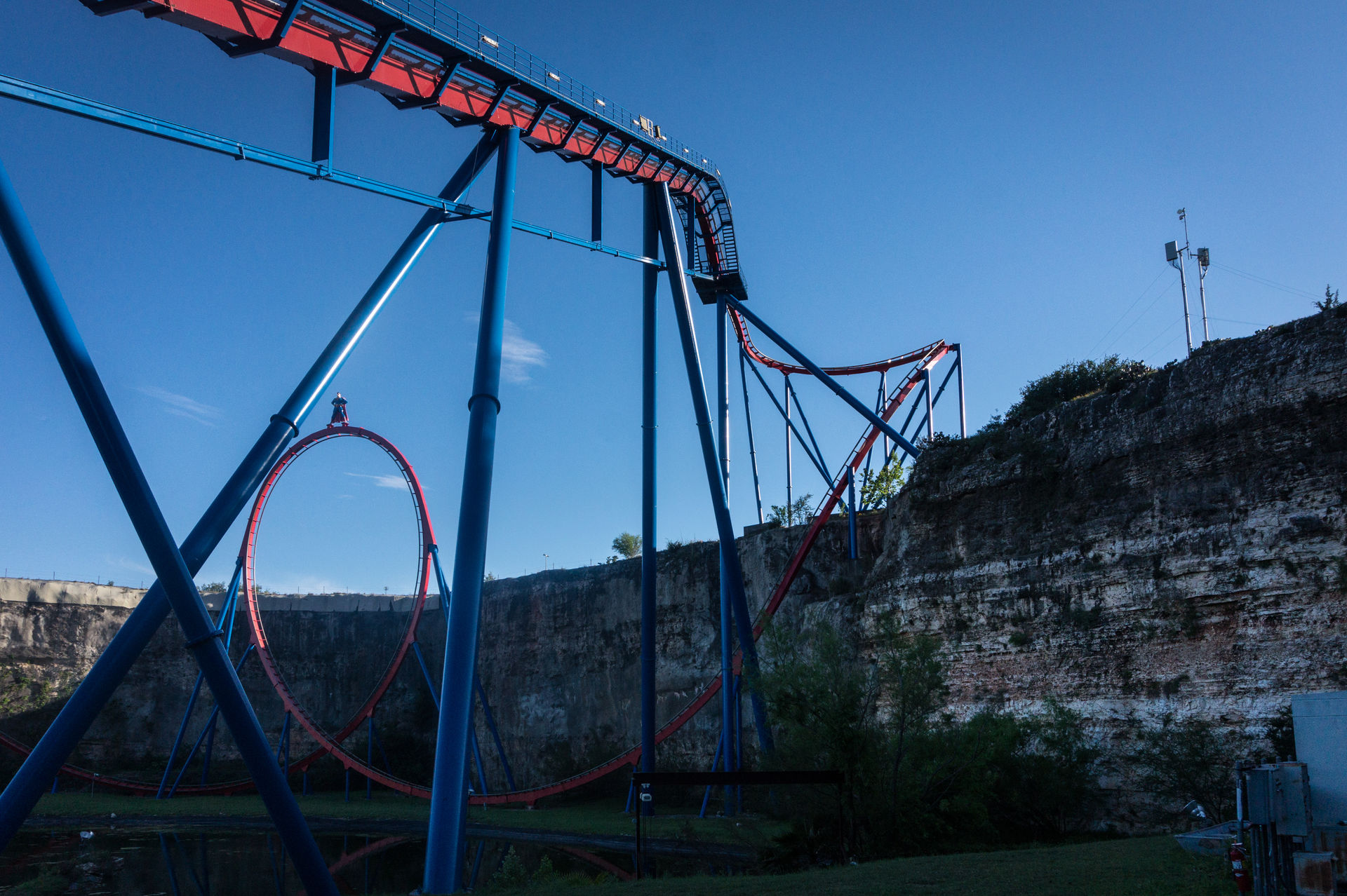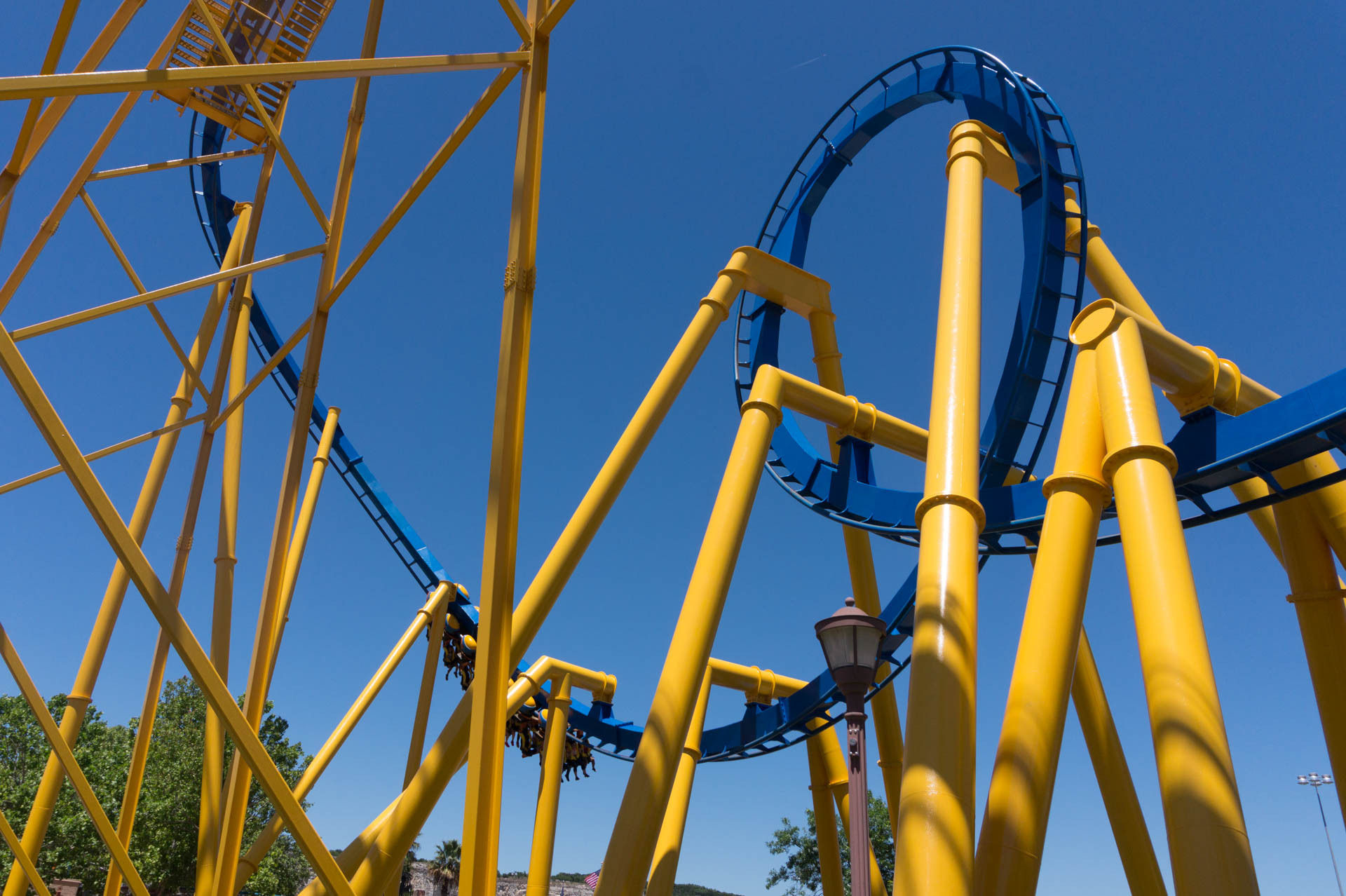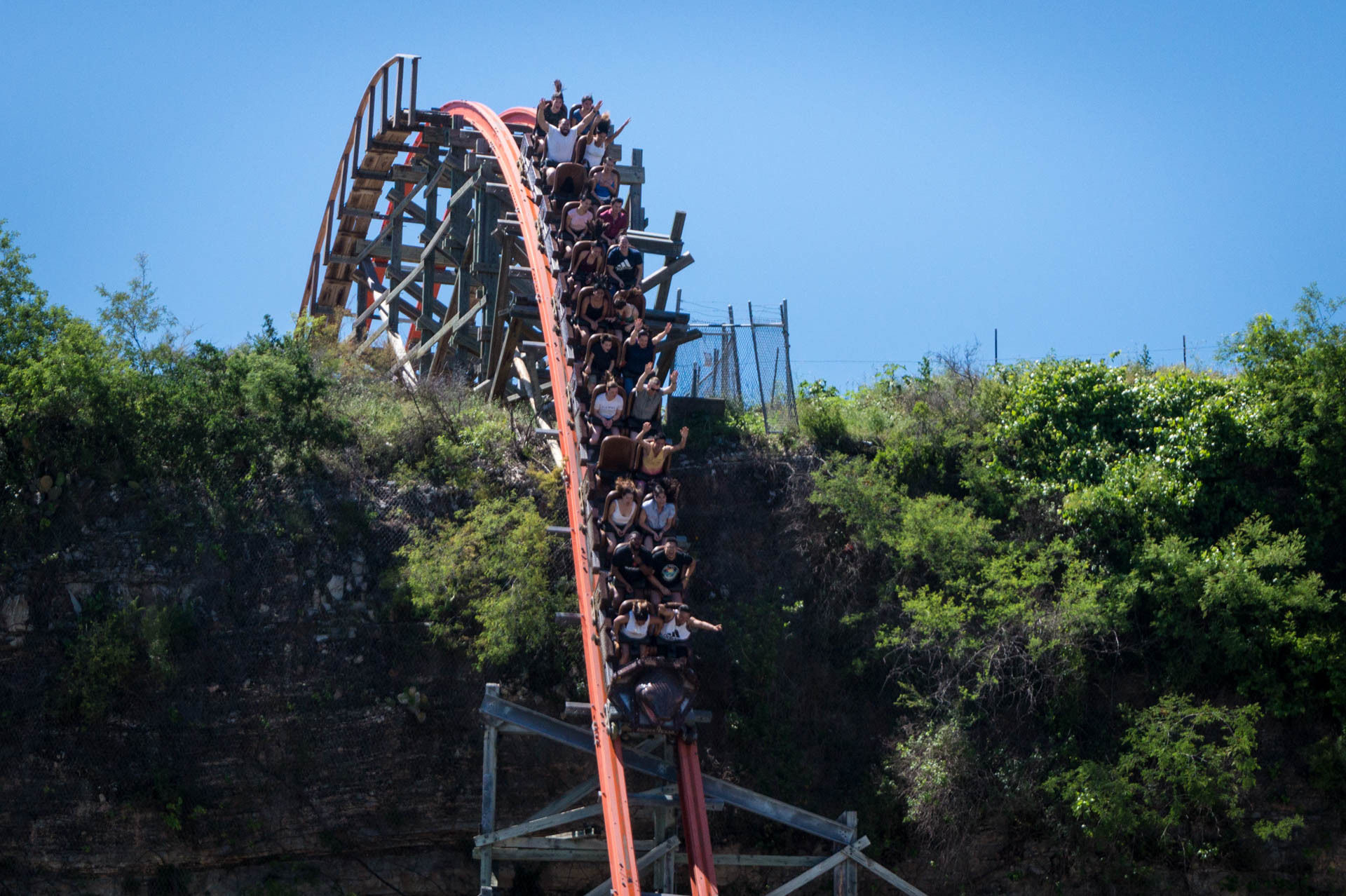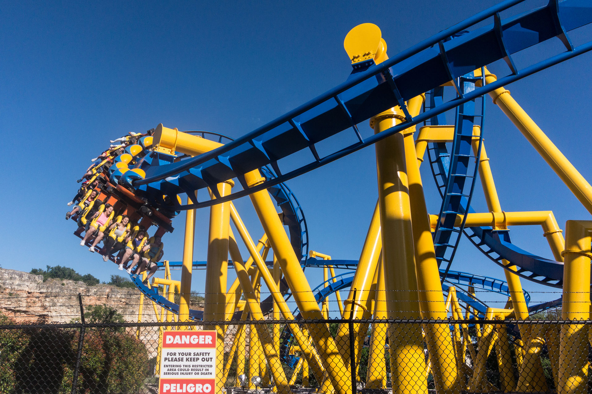 Oben an der Steinbruchwand angekommen, genießen wir den Blick auf das Einkaufszentrum The Shops at La Cantera, bevor wir uns in einer immer steiler werdenden Kurve nach unten begeben. In unsere Sitze gepresst, rasen wir nun durch das erste Tal, bevor wir in den großen Looping einfahren.